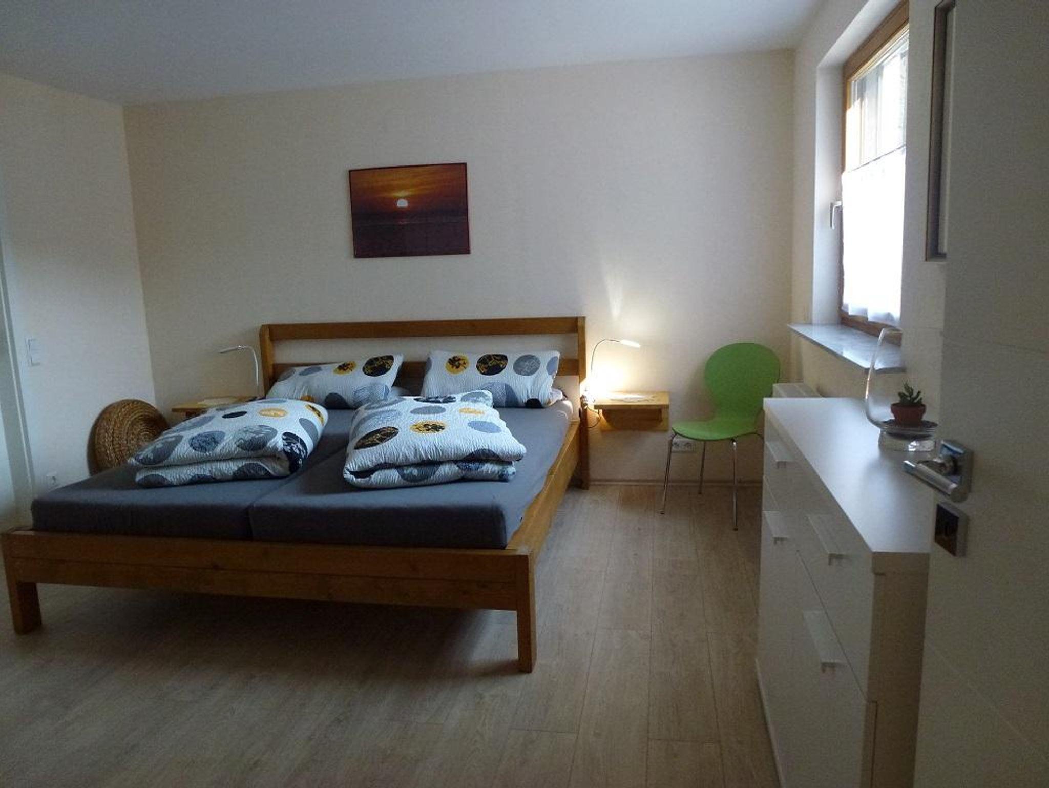Zimmer und Ausstattung: Schlafzimmer: Doppelbett 180x200, Bettwäsche, Kleiderschrank, Kommode
