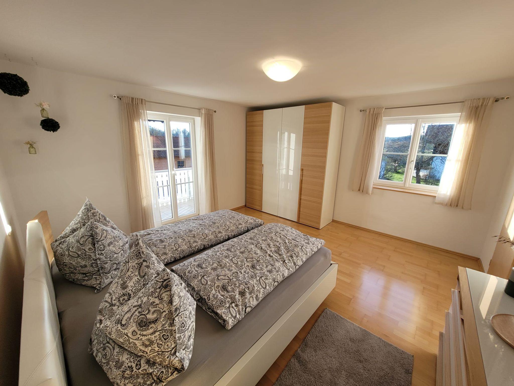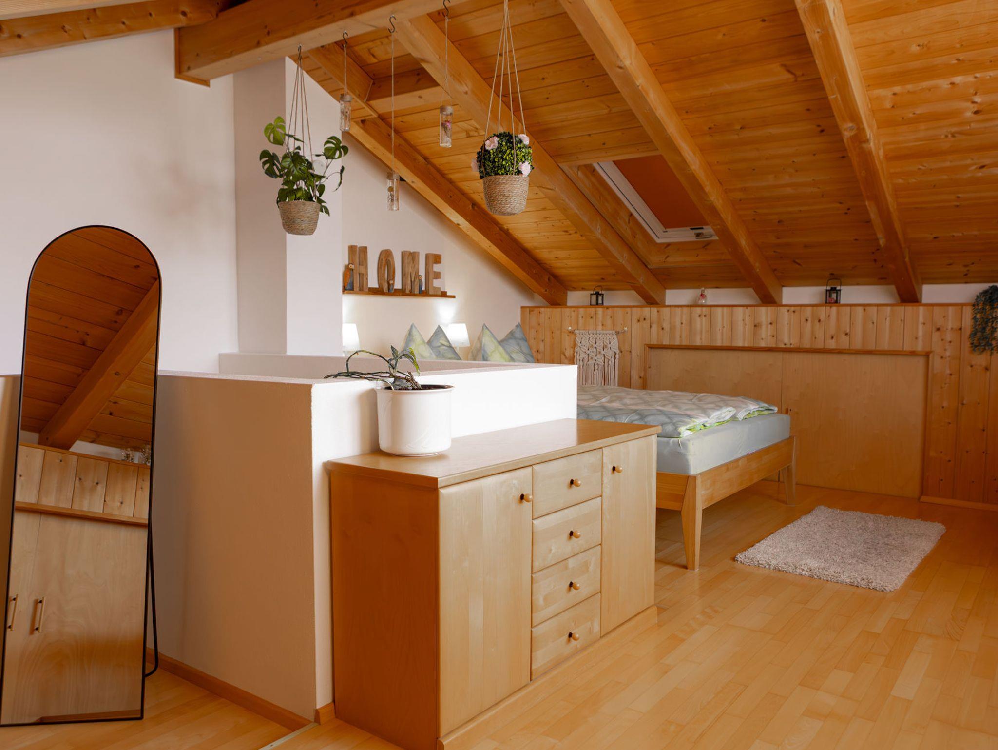 - offenes Schlafzimmer DG mit komfortablem Doppelbett in Überlänge (2,20 m) mit Blick auf die Alz