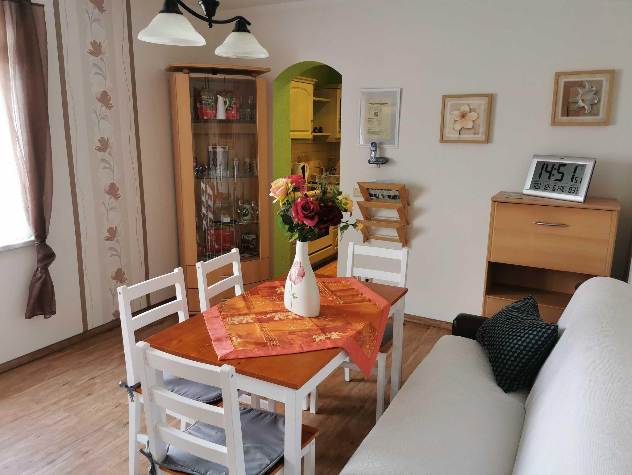 Schöne helle 44 qm Einliegerwohnung mit seperaten Eingang im idyllischen Ort Wolfshain. Das Zweiraum-Appartment verfügt über ein Schlafzimmer mit zwei Einzelbetten und einem Kinderetagenbett. Im Schlafzimmer ist Platz für eine Aufbettung und/ oder Reisebettchen. Im Wohnzimmer befindet sich eine Sitzgruppe für 6 Personen und ein TV Flachbild, Radio mit CD Player. Direkt anschließend befindet sich die Küchenzeile mit Backofen, E-Herd mit Ceranfeld, Kühl- und Gefrierschrank sowie Mikrowelle u.a. Direkt nebenan steht Ihnen ein Hauswirtschaftsraum als Abstellmöglichkeit zur Verfügung. Das großzügige Bad mit Fenster hat eine ebenerdige Dusche und eine Waschmaschine.