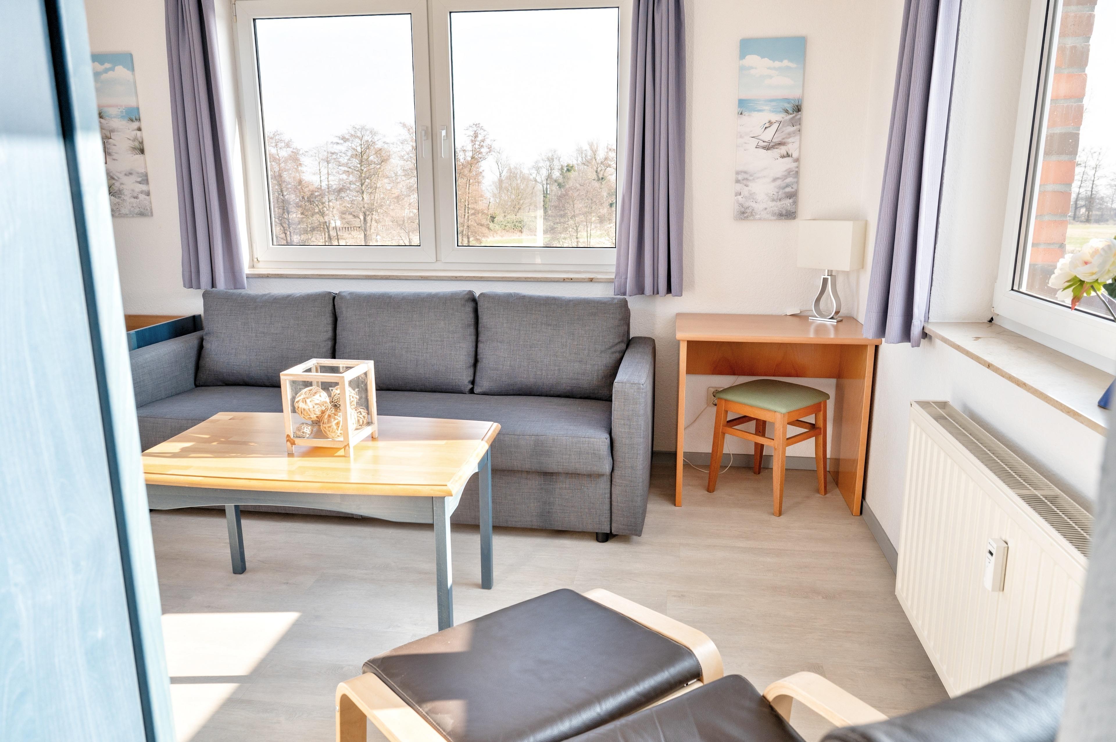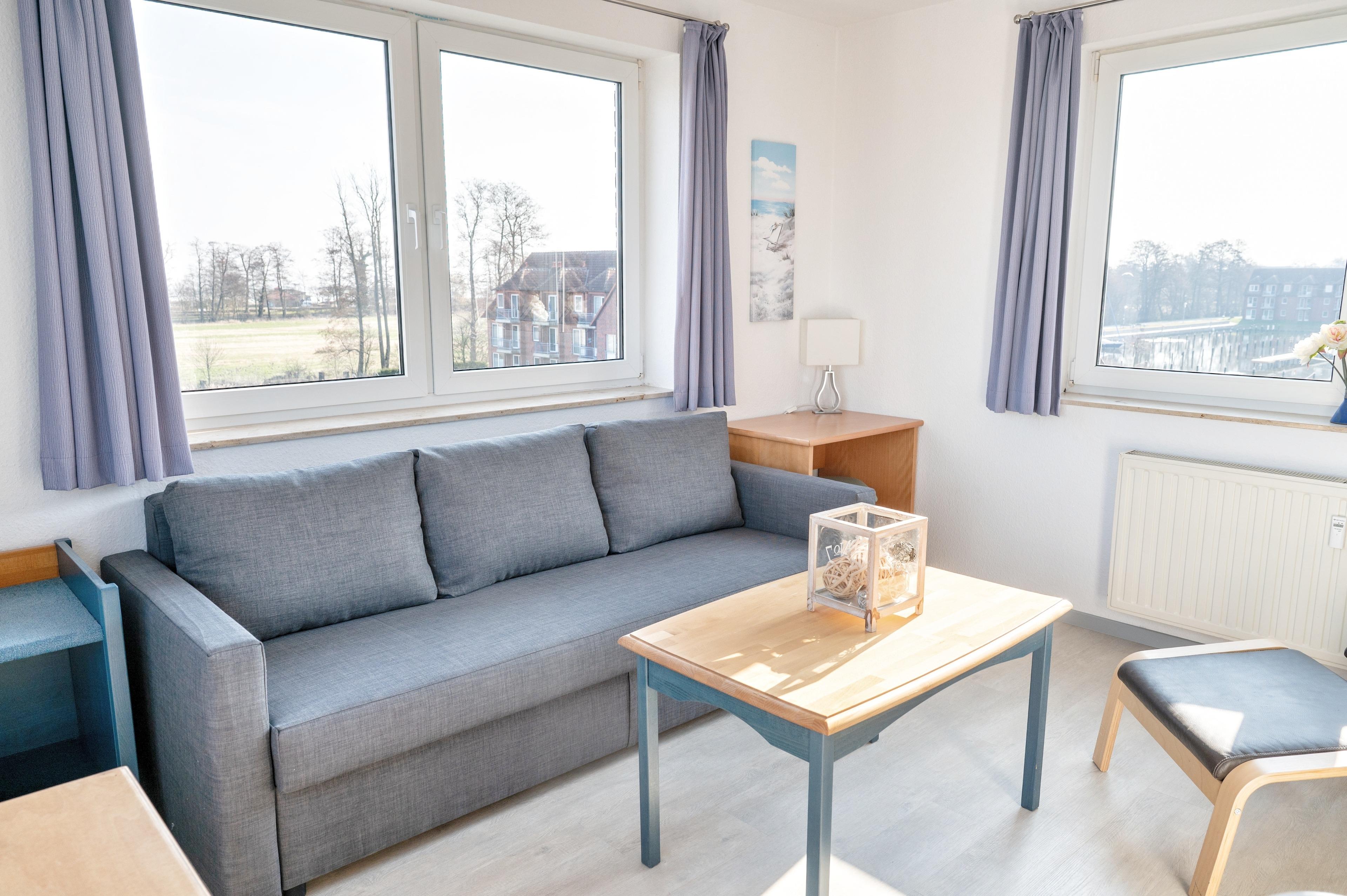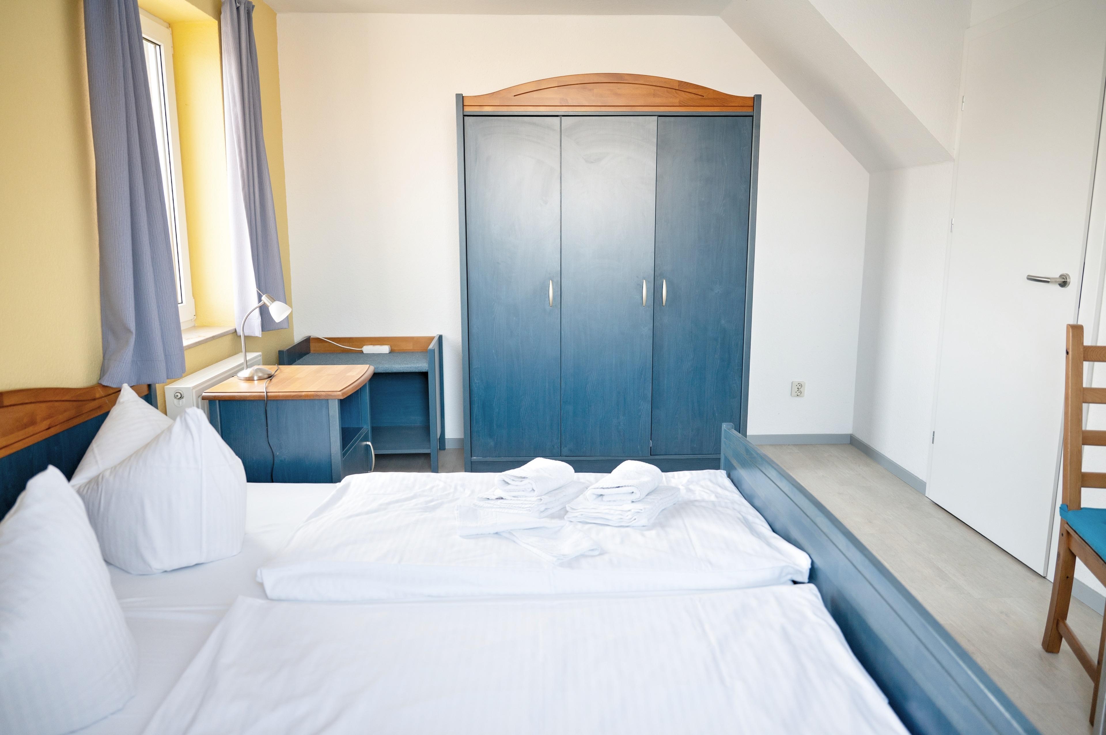 Die Ferienwohnung ist für eine Zweizimmerwohnung sehr großzügig geschnitten. Ein kleines, zusätzliches Türmchenzimmer verleiht der Wohnung nicht nur einen besonderen Charme, sondern auch einen wunderbaren Ausblick .Das Wohnzimmer verfügt über einen Esstisch mit vier Stühlen, ein ausziehbares Schlafsofa mit einem Schlafplatz für zwei Personen und einem Sessel mit Hocker. Multimedial können Sie auf einen großen Flachbildfernseher zurückgreifen. Ihre Ferienwohnung hat einen Kabelanschluss. Auch einige Gesellschaftsspiele warten hier schon auf Sie. Zusätzlich zum Wohnzimmer befindet sich ein durch eine Treppe erreichbares Türmchenzimmer. Dieses Zimmer hält eine ausklappbare Couch, einen Sessel mit Hocker und einen Tisch mit zwei Stühlen bereit. Für die Schlafgäste steht ein Kleiderschrank zur Verfügung. In Ihrem Schlafzimmer befindet sich ein Doppelbett. Nachttische, Leselampen und Garderoben möchten hier von Ihnen genutzt werden. Der große Schrank und das Kofferbord werden Ihnen gute Dienste leisten und genügend Stauraum für Ihr Gepäck bieten. Die Wohnküche ist zum Wohnzimmer hin offen, was den Raum großzügig erscheinen lässt. Ihre Küche ist für Sie voll ausgestattet. Bestandteile sind unter anderem ein Kochfeld, eine Kaffeemaschine, ein Backofen, viel Geschirr, ein Geschirrspüler sowie eine Kühl- und Gefrierkombination. Das Badezimmer ist mit einer hohen Duschkabine und ausreichend Ablageflächen ausgestattet. Auch ein Fön wartet hier schon auf Sie. Vom Flur, wo Sie auch eine Garderobe und einen großen Spiegel vorfinden, gehen alle Räume ab. Die Ferienwohnung Back befindet sich im zweiten Obergeschoss des Hauses Störtebeker im Eingang 1. In unmittelbarer Nähe dieser Ferienwohnung befinden sich weitere Appartements unserer Gesellschaft .Eine gemeinsame Anmietung ist hier sehr gut möglich.