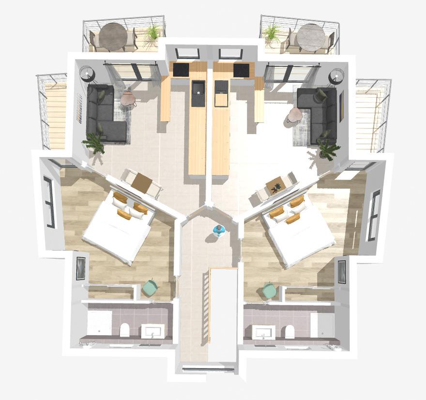 Der lichtdurchflutete Wohnbereich bietet eine gemütliche Atmosphäre mit einem ausziehbaren Schlafsofa (1,20 m Breite), das für zusätzliche Schlafmöglichkeiten sorgt. Ein weiterer Smart-TV und ein moderner Esstisch machen diesen Raum perfekt für gesellige Abende oder entspannte Stunden. Auch hier hast du direkten Zugang zum zweiten Balkon, der den Wohnbereich harmonisch nach draußen erweitert.