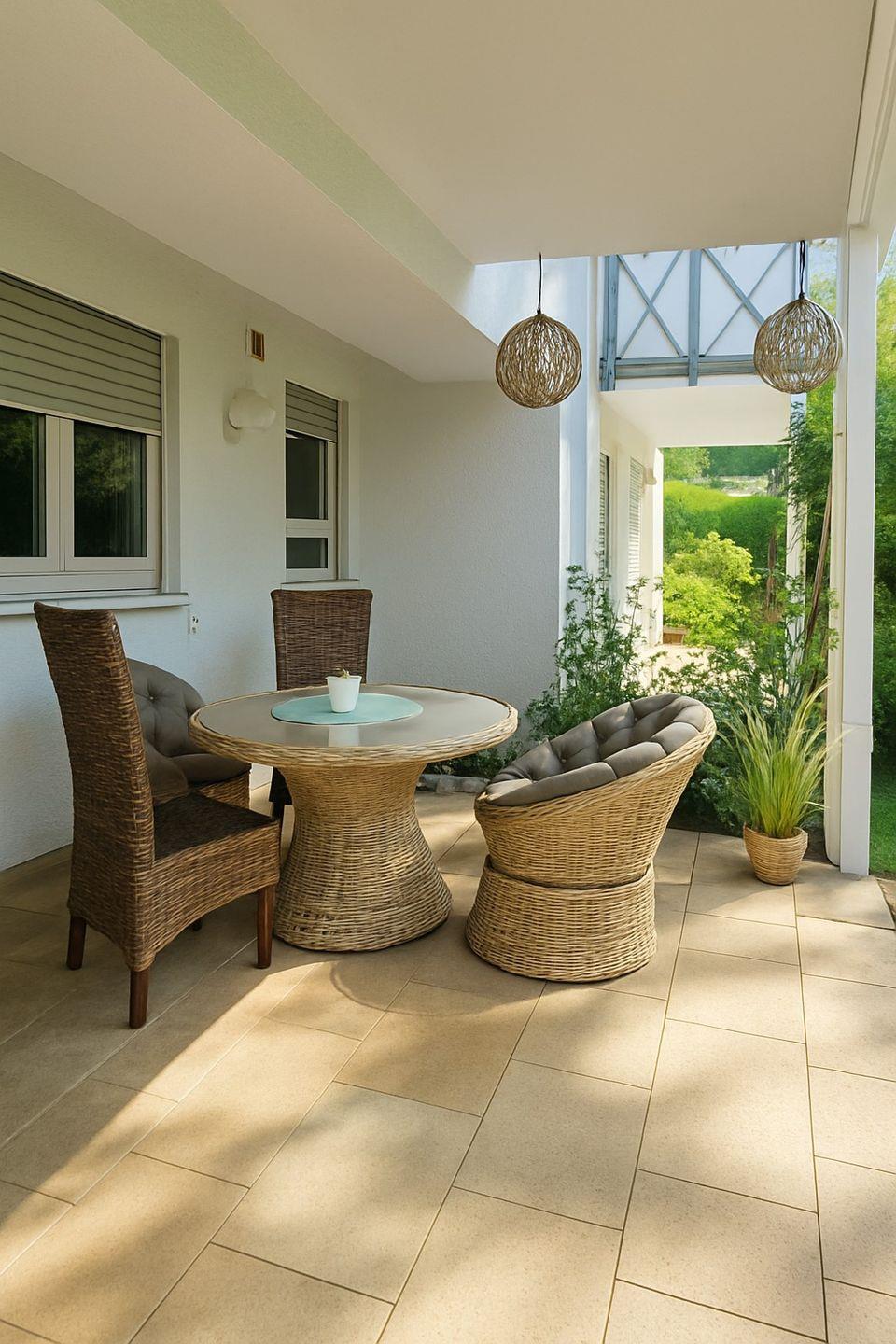 Eine Terrasse, die perfekt für ein entspanntes Frühstück oder einen erholsamen Abend an der frischen Luft ist.