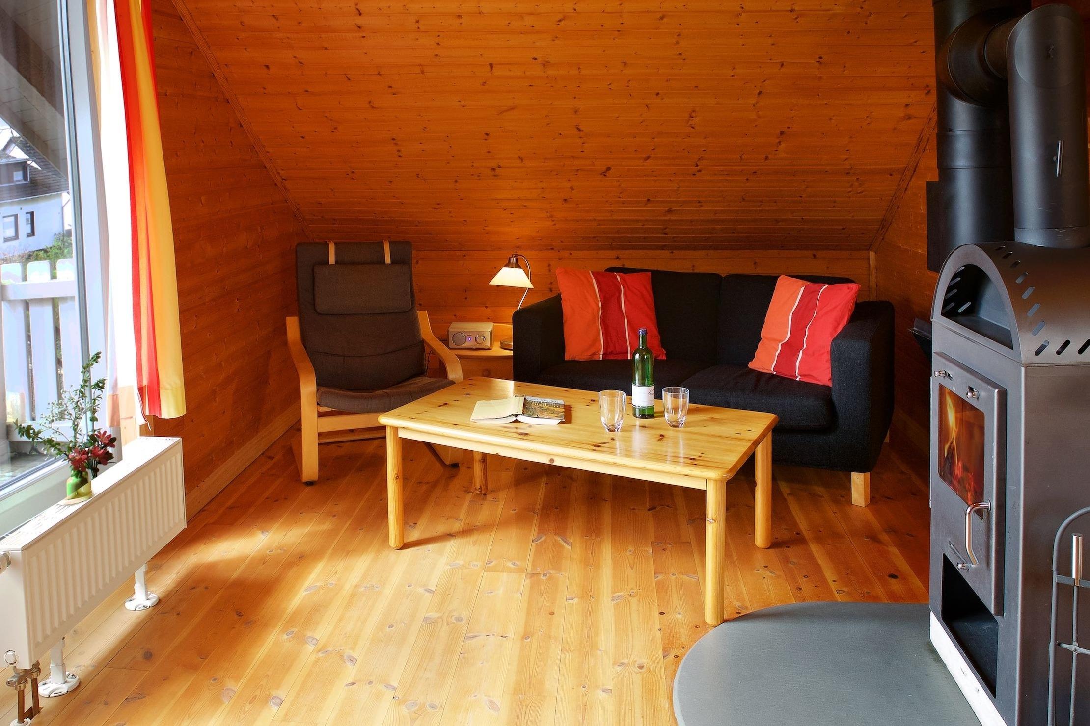 Unsere kleinste Wohnung, Ingvi, im Obergeschoss ist geprägt von urgemütlichen Dachschrägen. Sie hat alles, was zum Urlaub benötigt wird, ist hell, freundlich und ideal für Singles oder Paare, mit oder ohne Kleinkind. Die offene Küche ist vollständig ausgestattet. Direkt am Serviertresen steht der Esstisch. Im Schlafzimmer begrüßt Sie die Morgensonne, der große Balkon mit dem Treppenaufgang hat die Sonne am Nachmittag und Abend. Das warme geölte Kiefernholz und die massivhölzerne Einrichtung sorgen für Wohlbefinden und Entspannung. Und mit zwei oder drei Scheiten Holz im Kaminofen stellt sich schnell das Gefühl der Erholung ein.