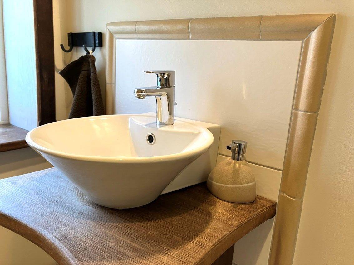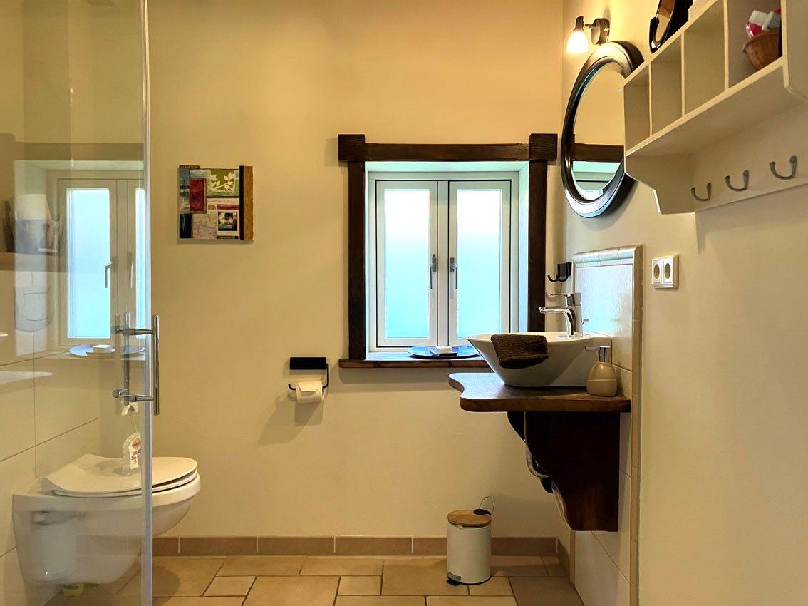 Durch wegnehmbare Holzrampen, breite Türen und Zufahrt in die ebenerdige Dusche größtenteils rollstuhlgerecht.