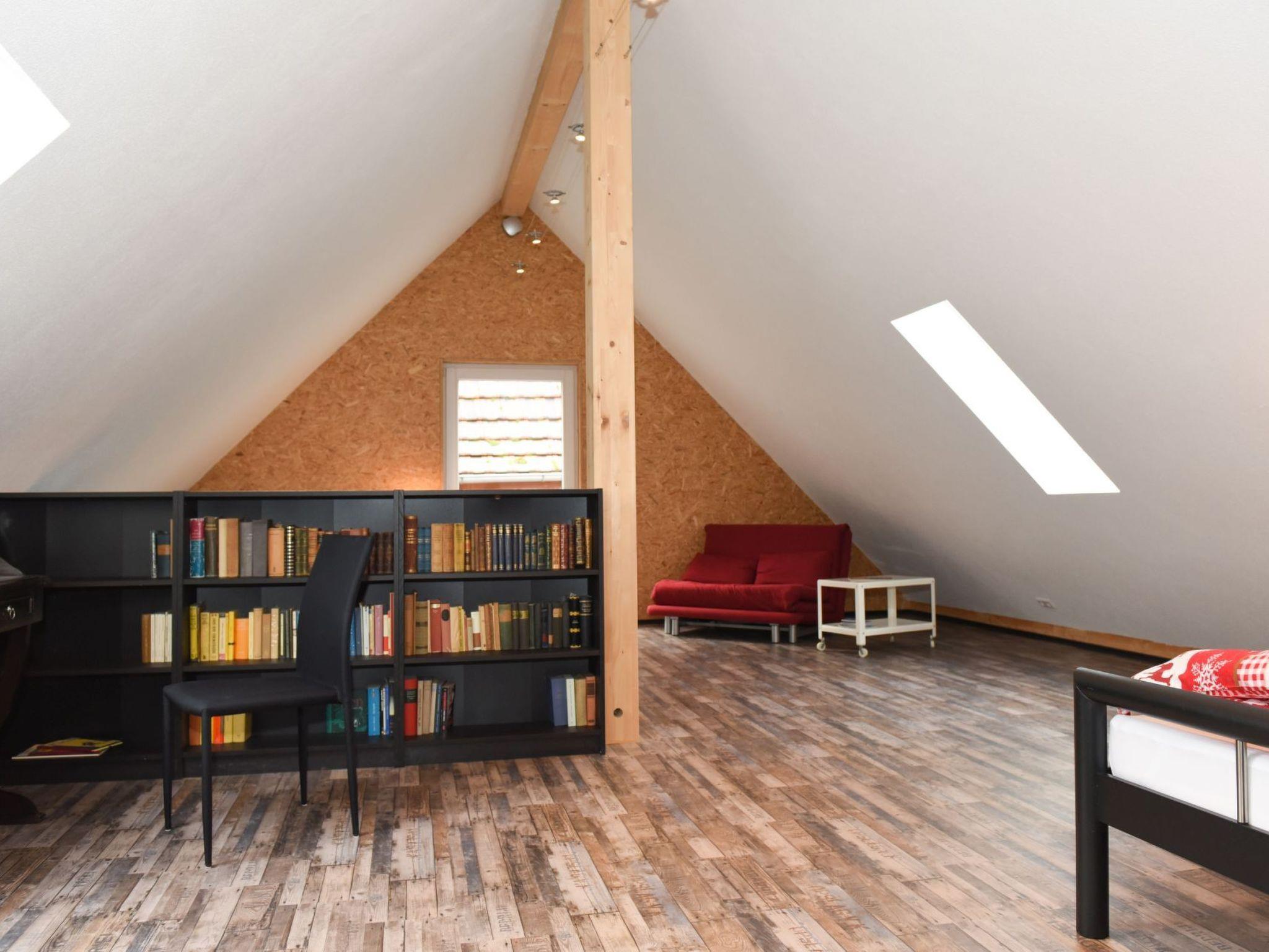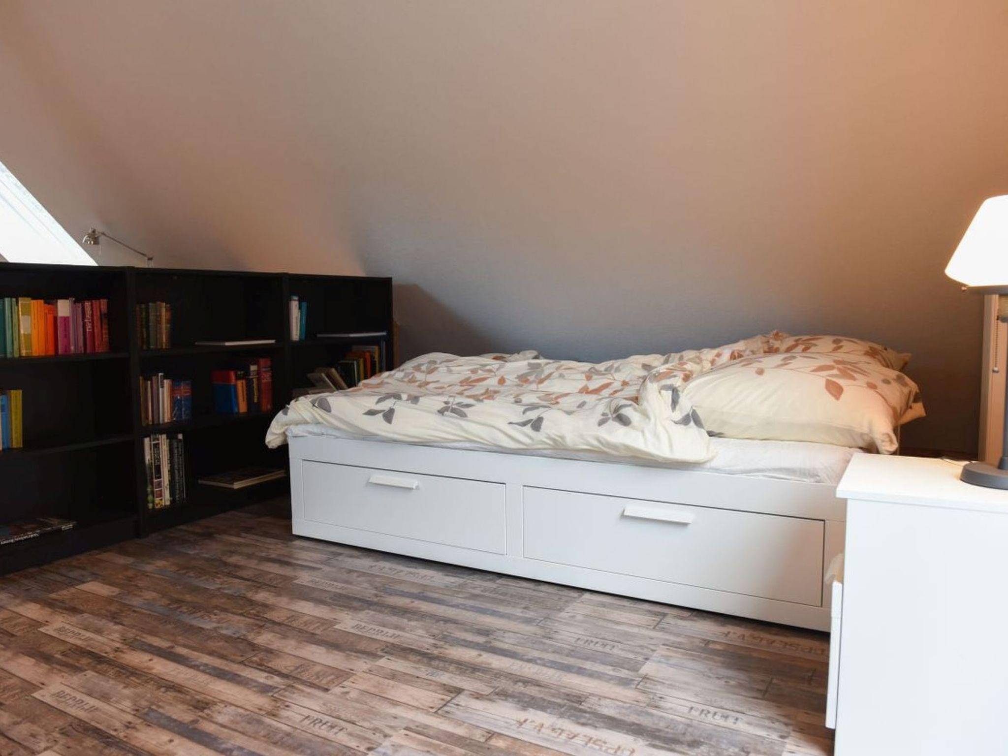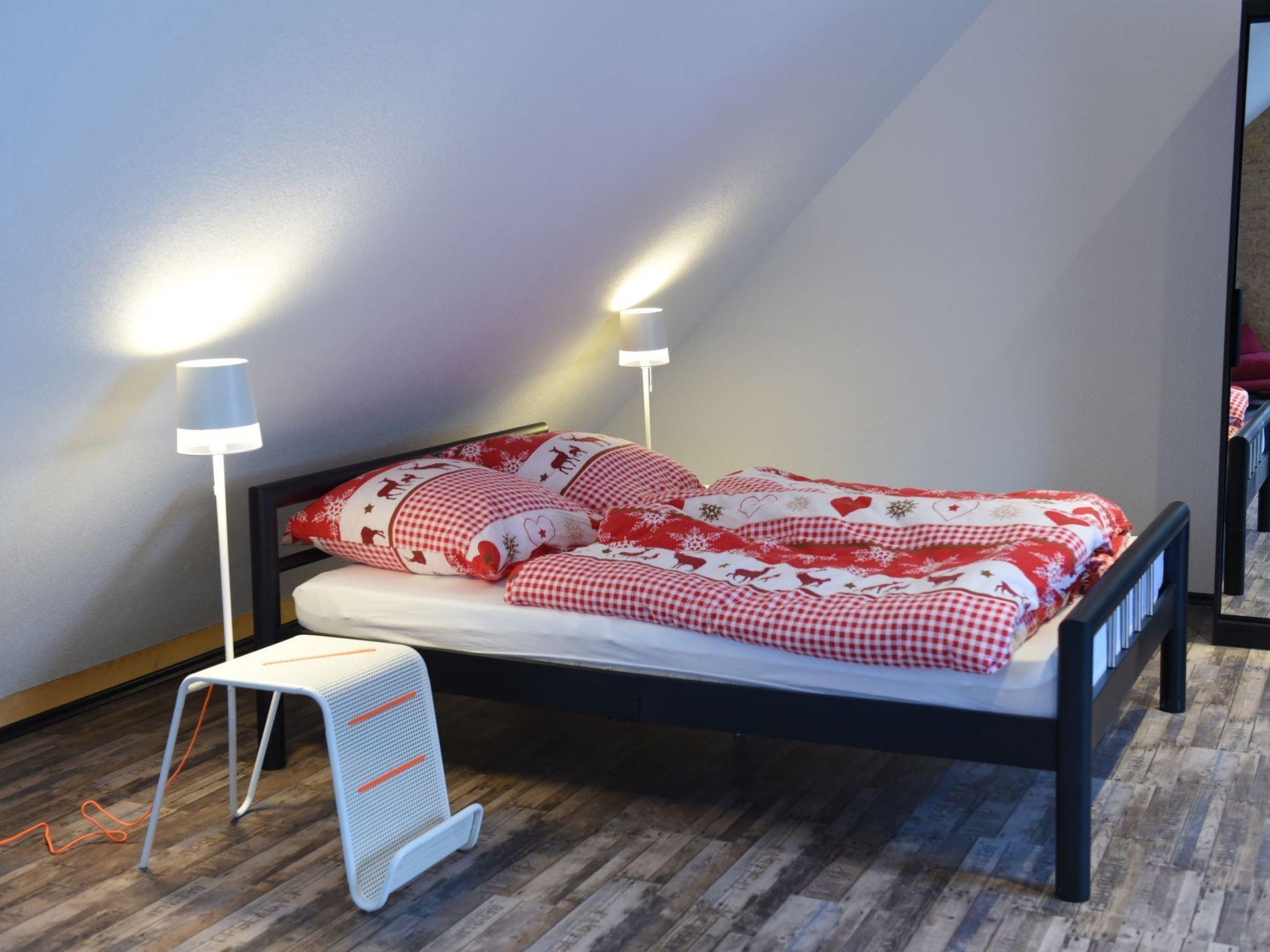 A staircase leads to the light-flooded open-plan upper floor, where the sleeping areas are located. A spacious room accommodates two cosy double beds, visually separated by a room divider. The facilities also include free Wi-Fi and a practical washing machine.