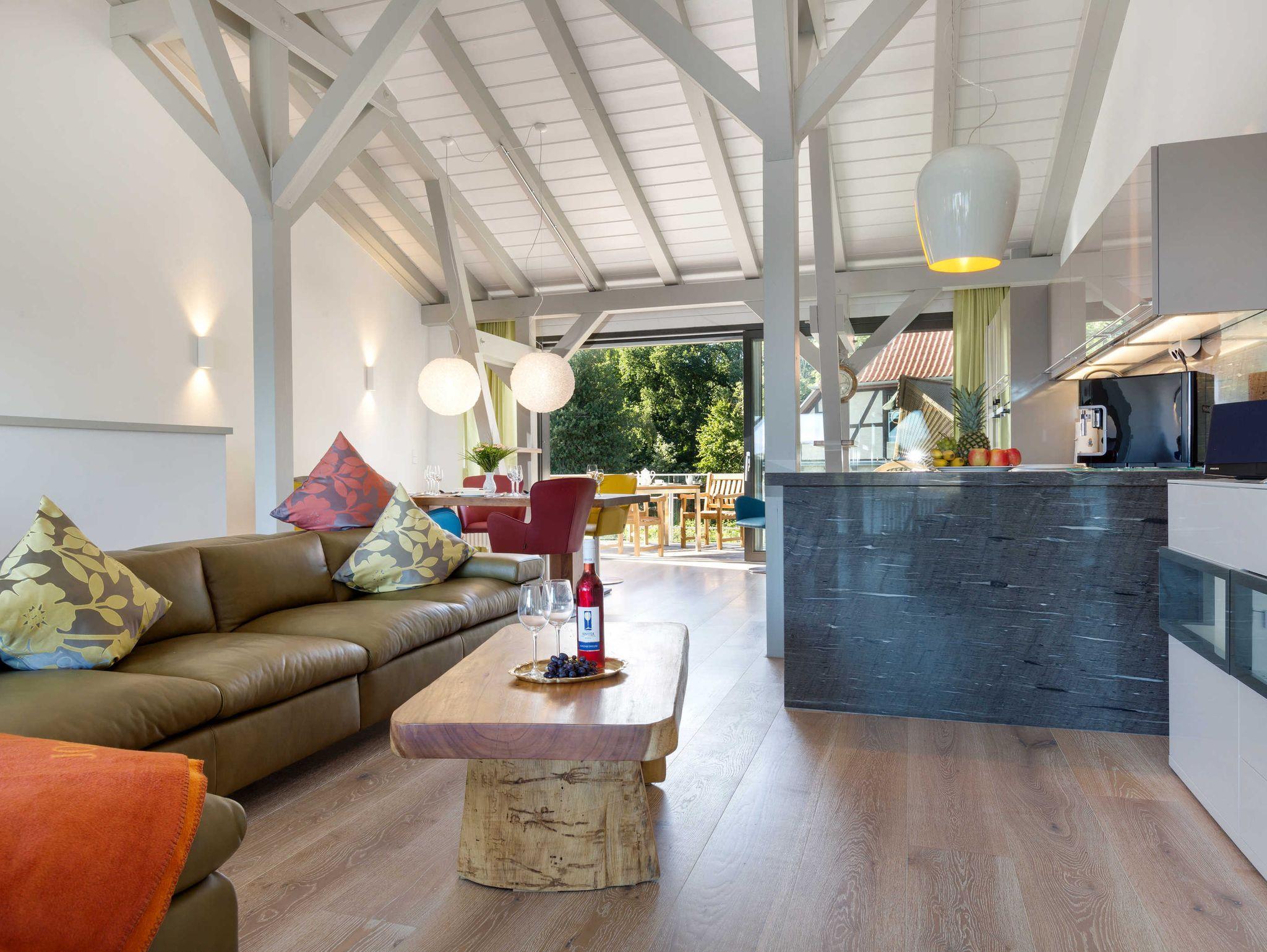 Während sich der großzügige Schlafbereich im Erdgeschoss befindet, beeindruckt der Wohnbereich im Obergeschoss mit bis zu vier Meter hohen Decken. Das luxuriöse Interieur wird durch die komplett ausgestattete Küche, drei HDTV-Fernseher, eine HiFi-Anlage, Designermöbel und natürlich einen Internetzugang per WLAN abgerundet.
