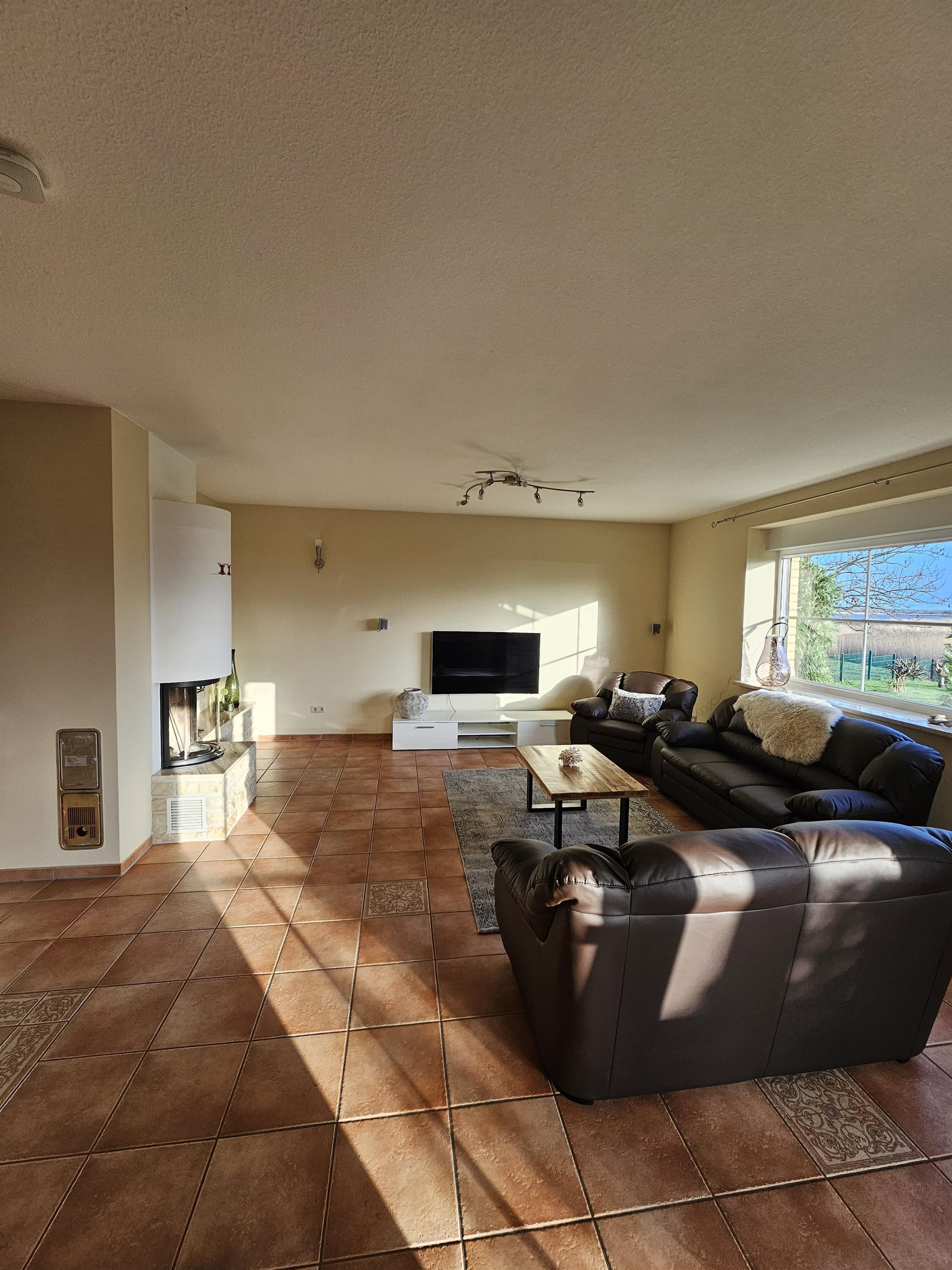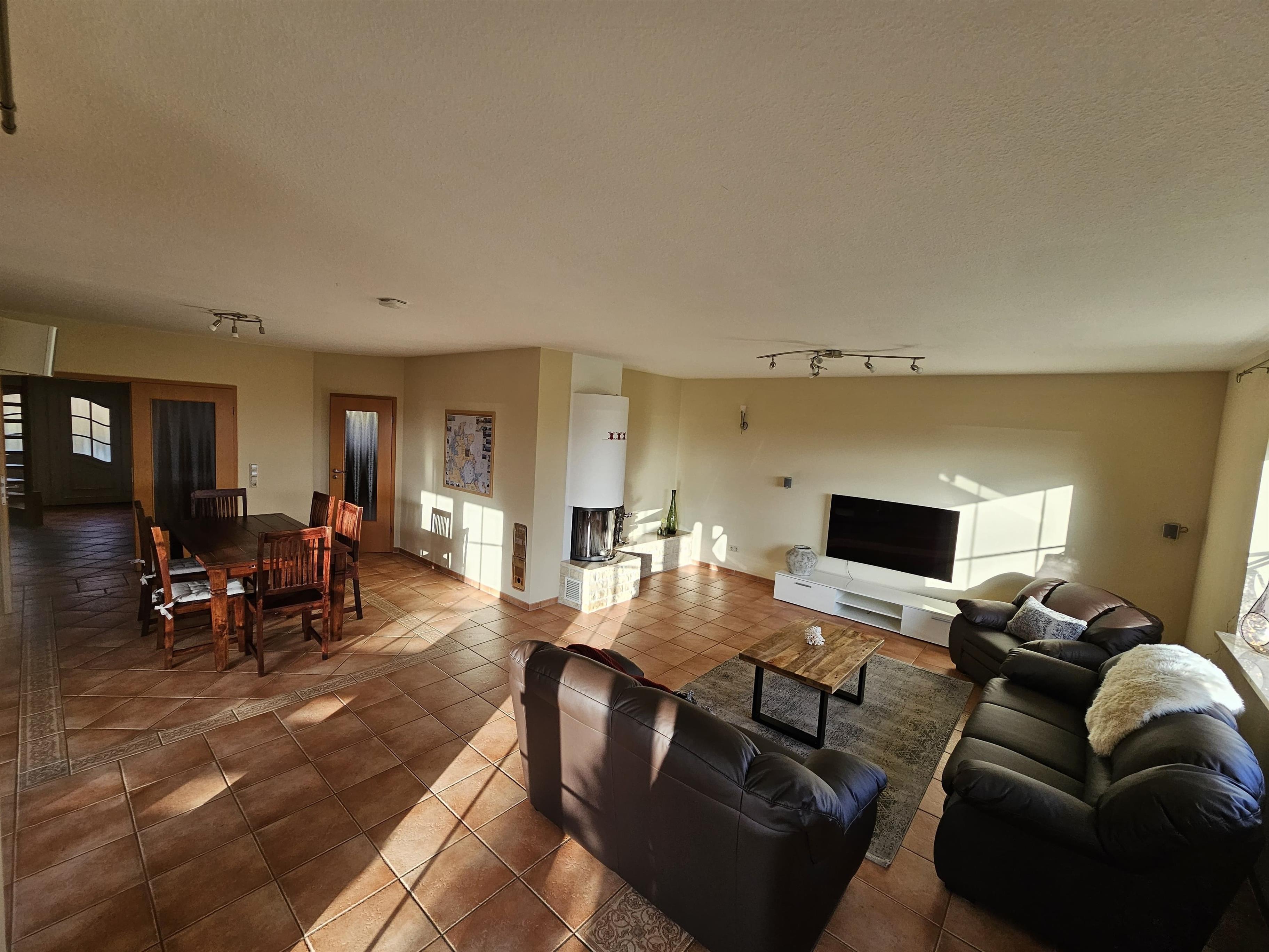- Komfortables Wohn/Esszimmer mit gemütlicher Couchecke, Kaminofen, großen Esstisch