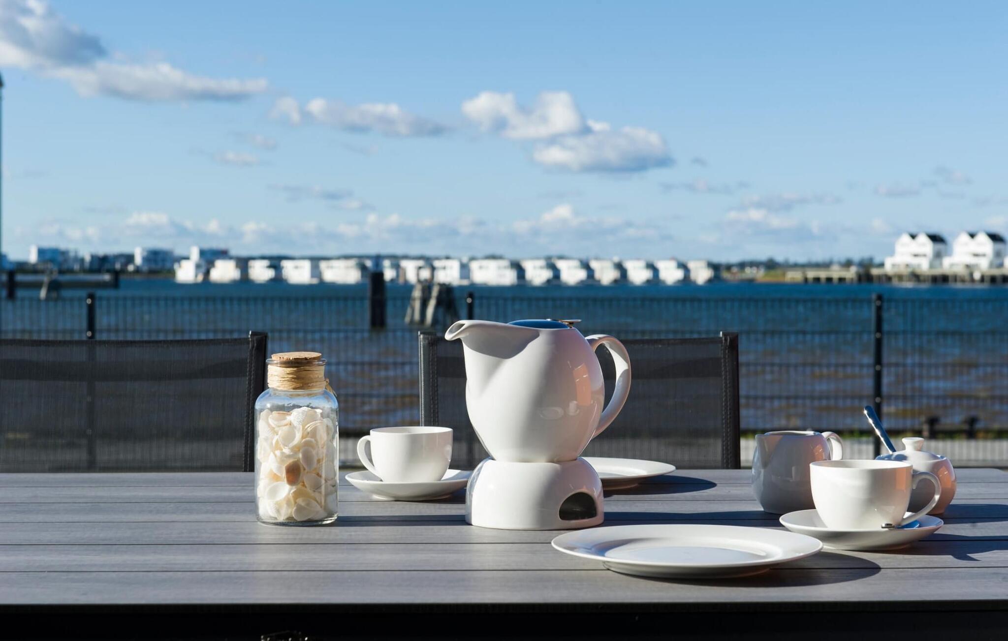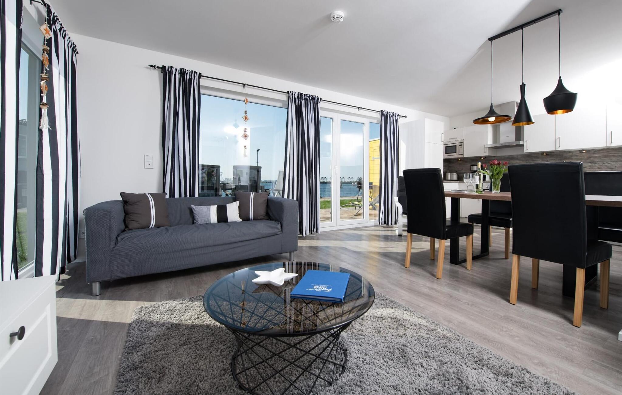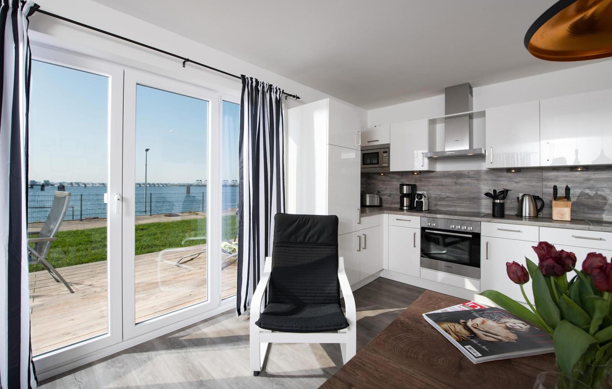 Fra oppholdsrommet og den tilstøtende terrassen har du en fantastisk utsikt over marinaen. Havnekinoen sørger for underholdning under en hyggelig grillkveld eller en romantisk middag med levende lys i solnedgangen.