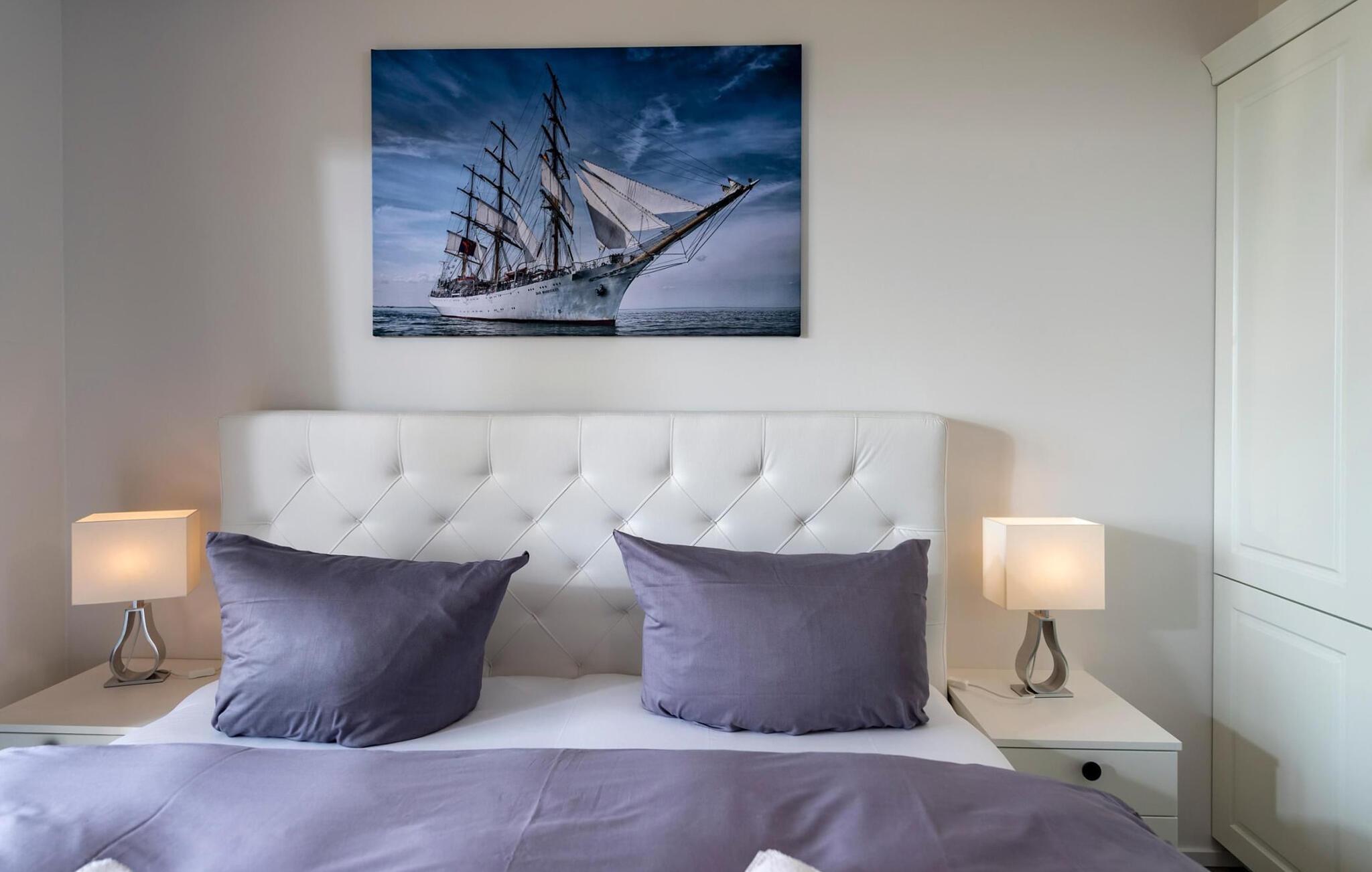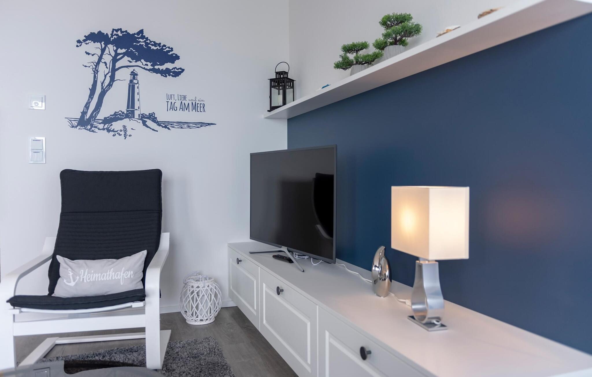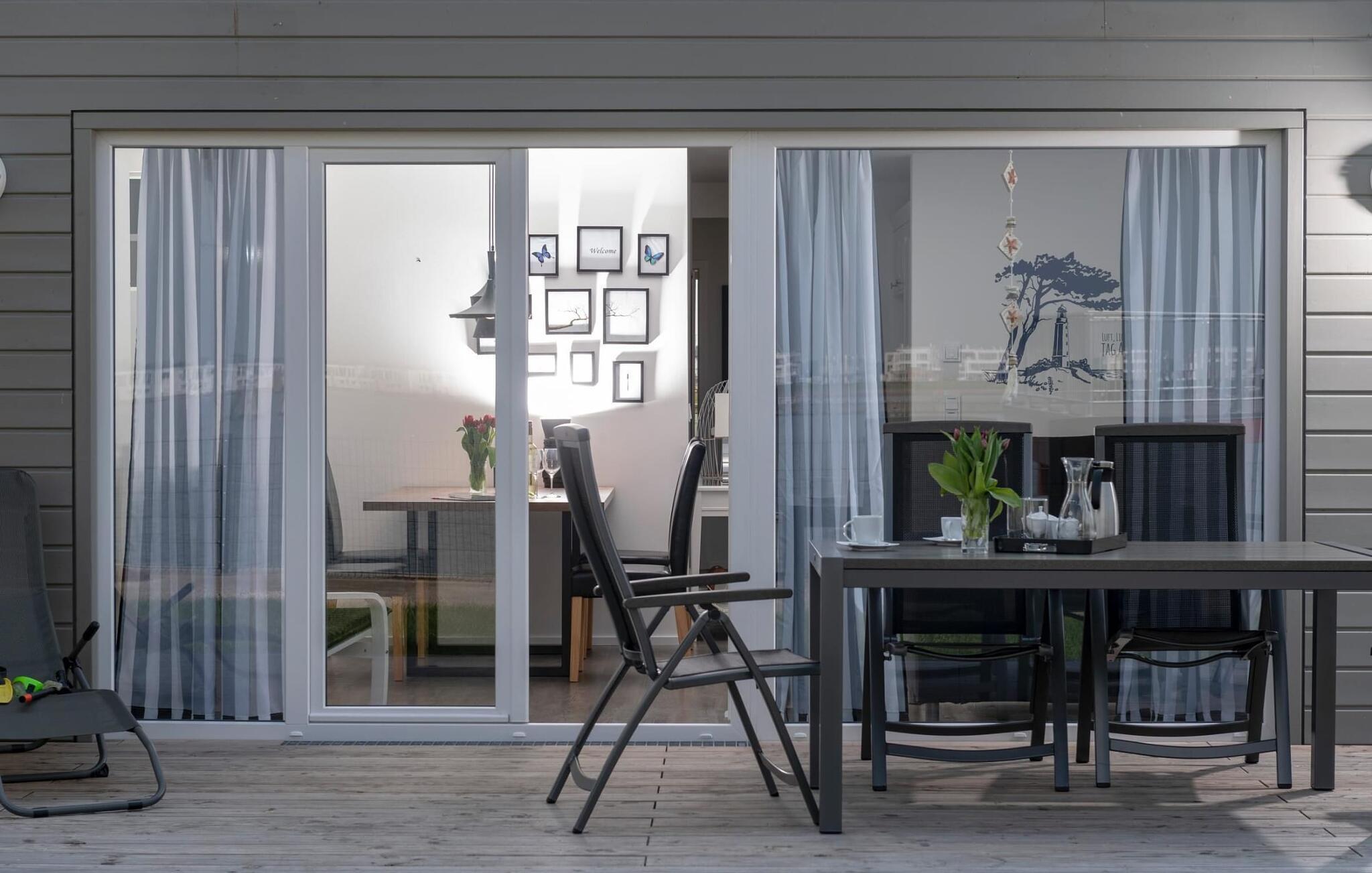 Fra oppholdsrommet og den tilstøtende terrassen har du en fantastisk utsikt over marinaen. Havnekinoen sørger for underholdning under en hyggelig grillkveld eller en romantisk middag med levende lys i solnedgangen.