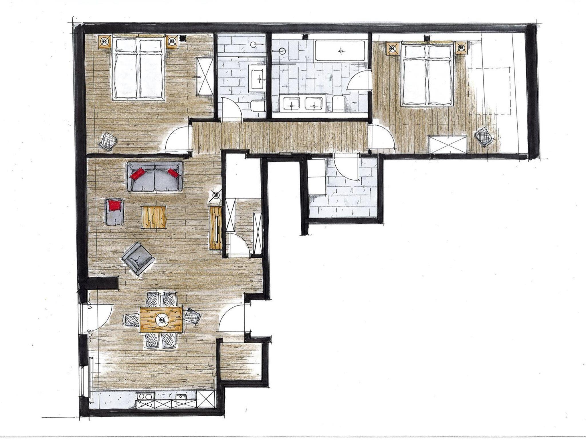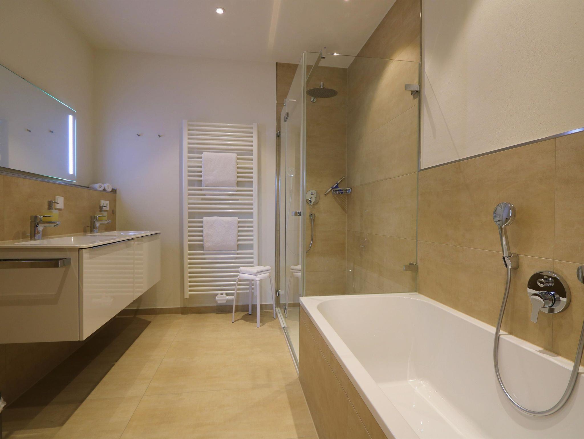 Diese Ferienwohnung für 2-6 Personen verfügt über ein zentral in der Wohnung gelegenen Wohnbereich mit integrierter Küche mit Essbereich und zwei separaten Schlafzimmern. Sie verfügt über eine Küche mit Kühlschrank, Spülmaschine, Ceran-Herd, Wasserkocher, Toaster und Kaffeemaschine sowie zwei Bädern mit Dusche und WC zudem im Hauptbad über eine Badewanne. Vom Küchenbereich gelangen Sie auf den Balkon.