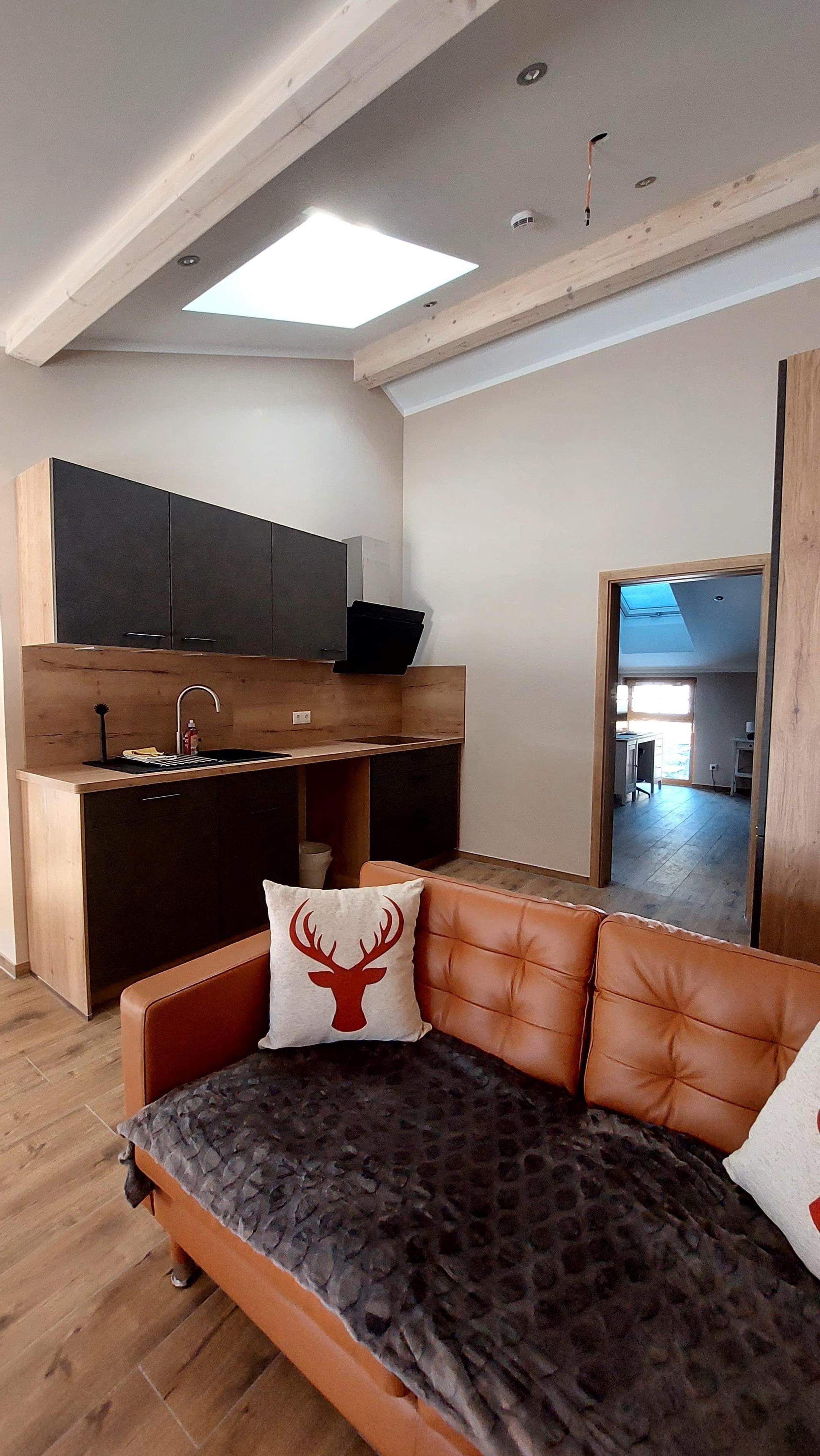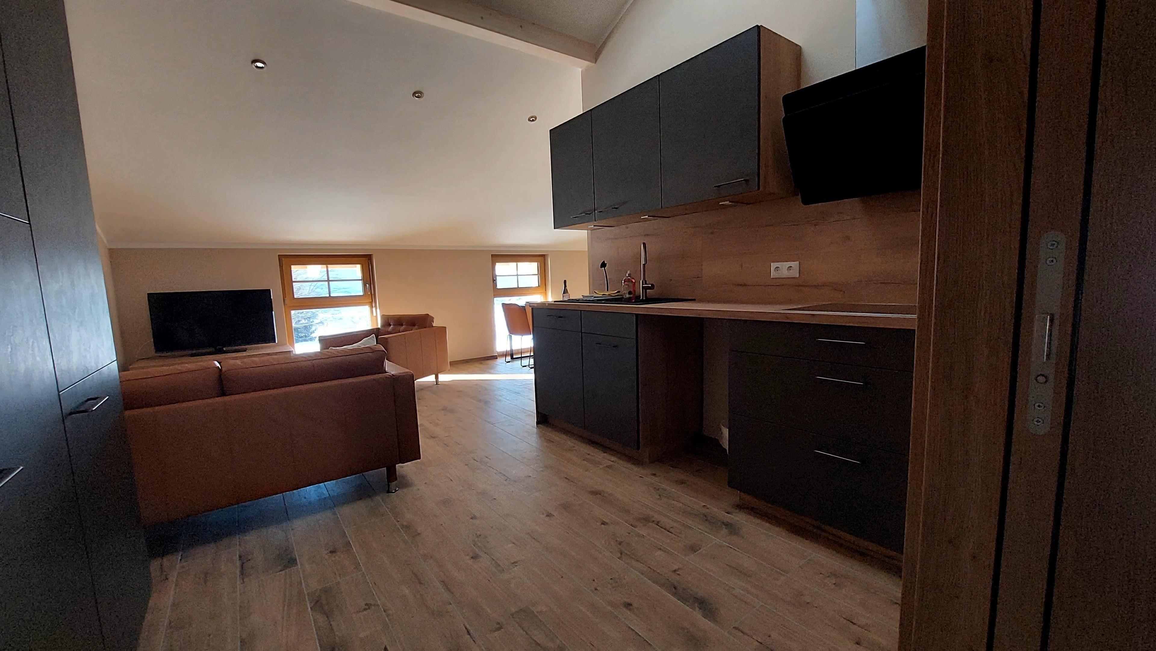 Wohnzimmer mit voll eingerichtete Küche
