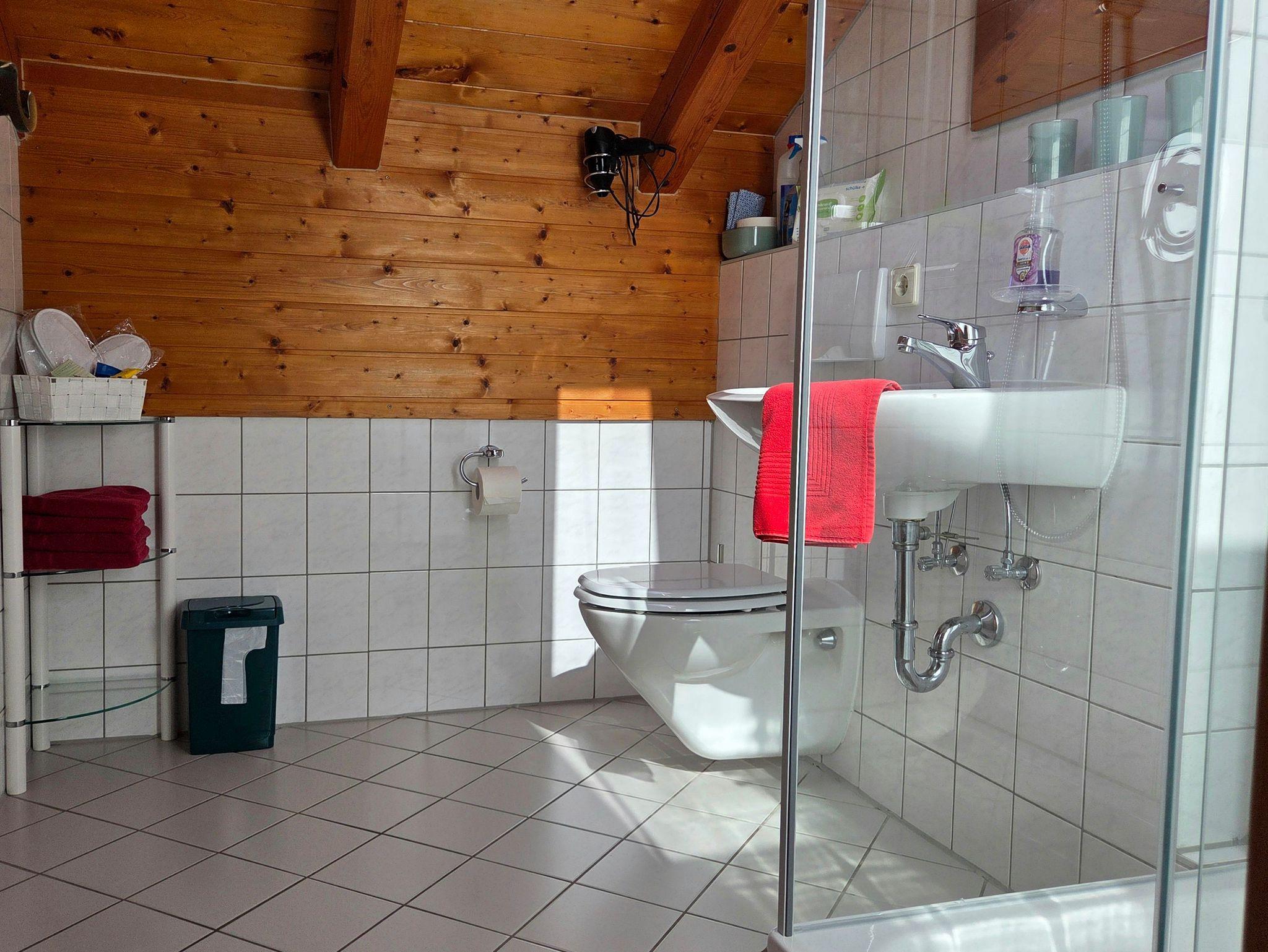 Tageslicht Badezimmer mit Dusche und WC, Haarfön, Toilettenartikel und Pantoffel,