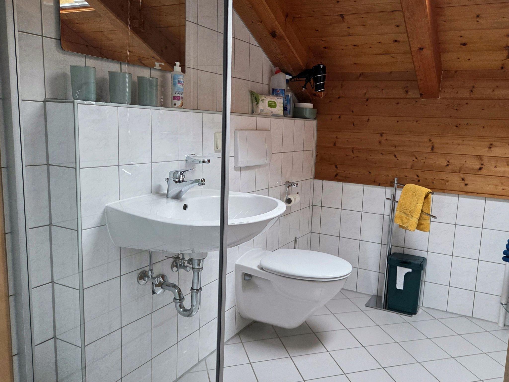 Das Badezimmer hat Tageslicht, Dusche/WC, Toilettenartikel, Hand- Badetücher stehen zur Verfügung, Haarfön, Hauspantoffel;