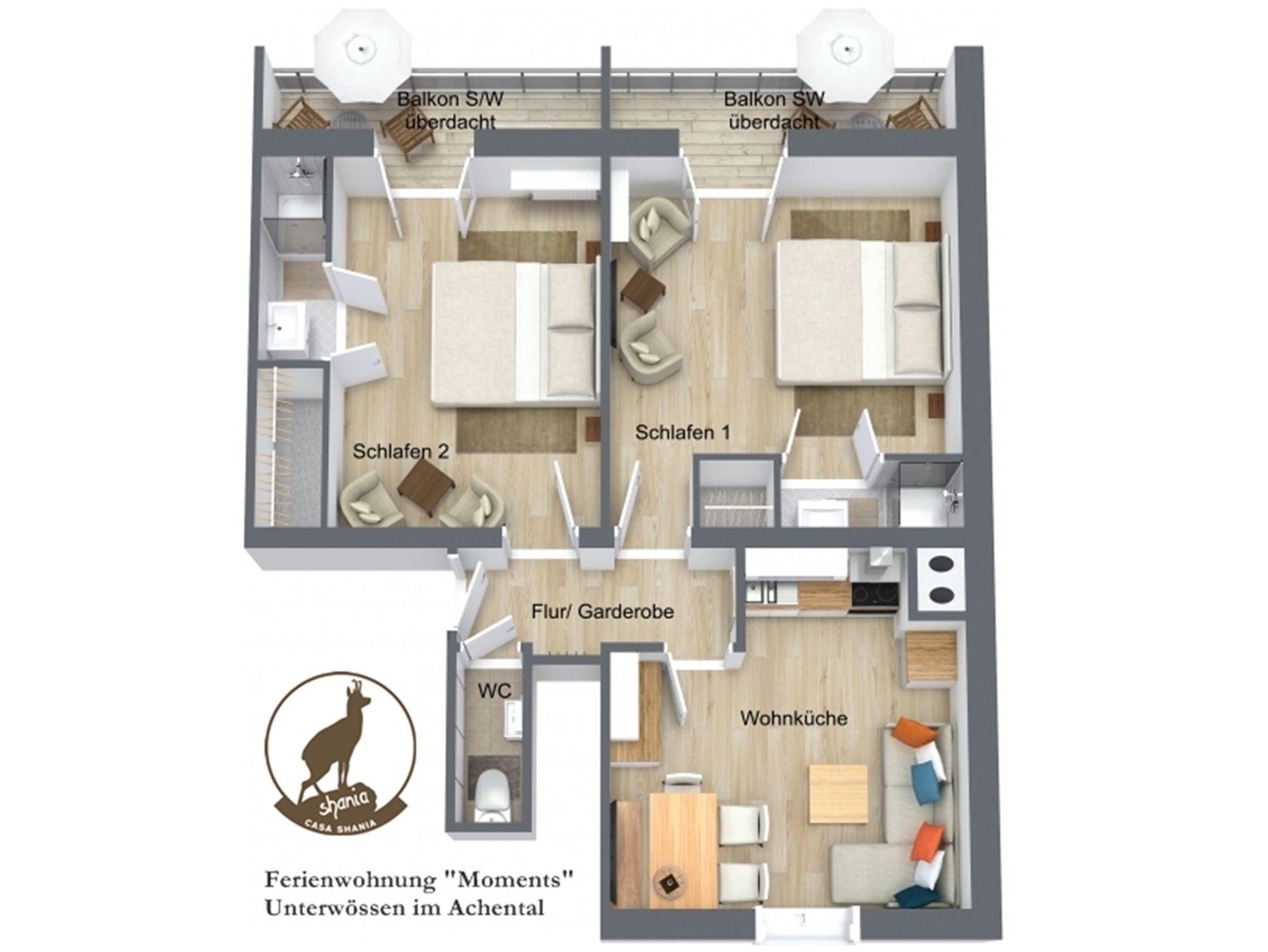 Die Ferienwohnung „Moments“ ist für bis zu 4 Personen ausgelegt. Sie verfügt über drei Räume, Flur und WC. Im Schlafzimmer 1 steht ein großes „Himmel-Doppelbett“ mit Ablagen, eine kleine Sitzgruppe, großer Einbauschrank mit eingebauter Dusche und Waschtisch und ein großer Flat-TV. Zugang zum eigenem überdachten SW- Balkon mit 2 Stühlen und Tisch. Das Schlafzimmer 2 hat ebenfalls ein Doppelbett, jedoch in Boxspring- Ausführung, eine kleine Sitzgruppe und einen großen Einbauschrank mit eigener Dusche und Waschtisch. Einen kleinen TV finden sie im Schrank. Direkter Zugang zum überdachten SW- Balkon mit 2 Stühlen und Tisch. Die Wohnküche ist voll ausgestattet, zusätzlich neben dem Essplatz mit Bank und Stühlen gibt es hier noch eine gemütliche Couch. Weiter finden Sie hier auch einen XXL-Flat TV. Küchenausstattung: Vollwertiger Herd mit Ceranfeld, Spülmaschine, Kaffee-Pad Maschine, Geschirr/Kochgeschirr etc. in ausreichender Anzahl.
