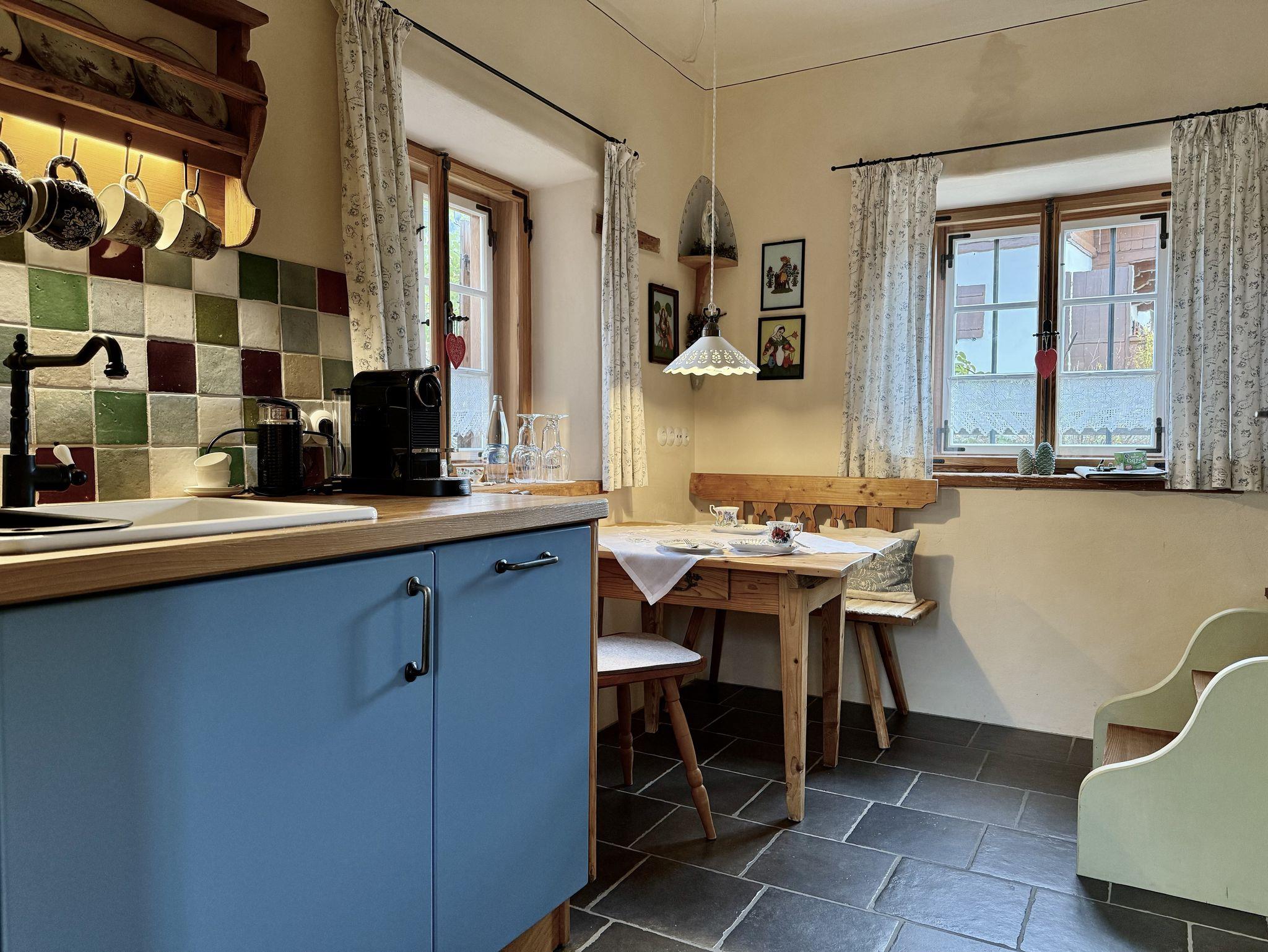 Für Gäste, die das Besondere zu schätzen verstehen: ein denkmalgeschütztes Zuhäusl auf einem uralten Bauernanwesen mit Blick über den Bauerngarten und die weitläufige Streuobstwiese auf die umliegenden Berge. Historische Bausubstanz, die kürzlich aufwändig restauriert und mit allem modernen Komfort versehen wurde, bildet den Rahmen für stilvoll und dabei funktionsorientiert eingerichtete Räume: im Erdgeschoß ein kleiner Eingangsflur und die Wohnküche, dazu ein neu angebautes Bad mit Wanne; über eine steile historische Kastentreppe gelangt man ins Obergeschoß mit Wohnraum sowie einem Schlafzimmer mit Doppelbett 180x200 cm. Handgemachte Fliesen, hochwertige Textilien, schreinergefertigte Einbaumöbel, bäuerliche Antiquitäten, Daunenbetten, Battistwäsche, edles weißes Frottee ergänzen das Ensemble. Fußbodenheizung, freies WLAN, Bose-Lautsprecher. Dazu alle Serviceangebote unserer Lohei-Anlage vom absperrbaren Fahrradraum, dem Hofladen, dem Waschmaschinenraum und dem Carport bis zum Grillplatz.