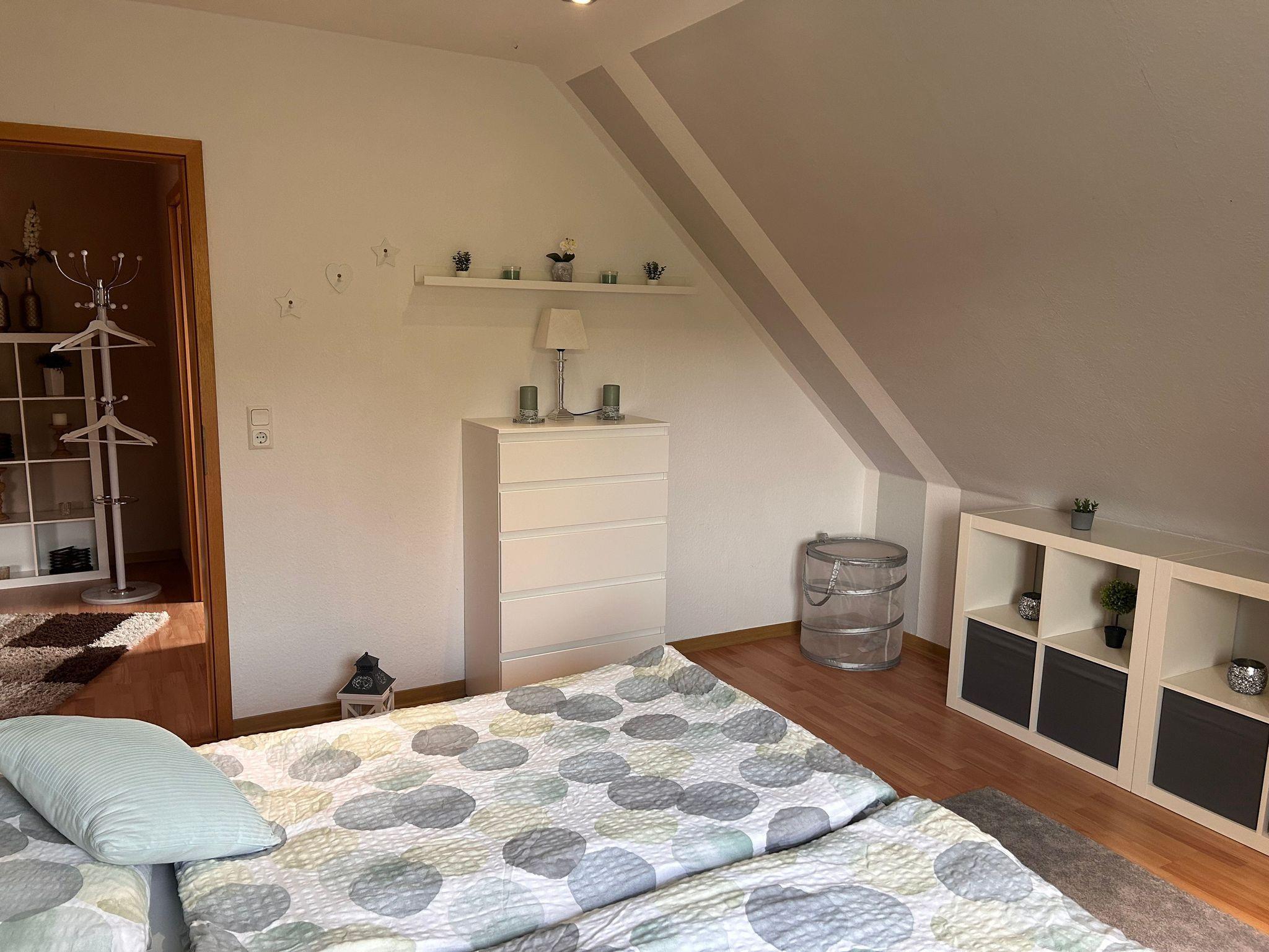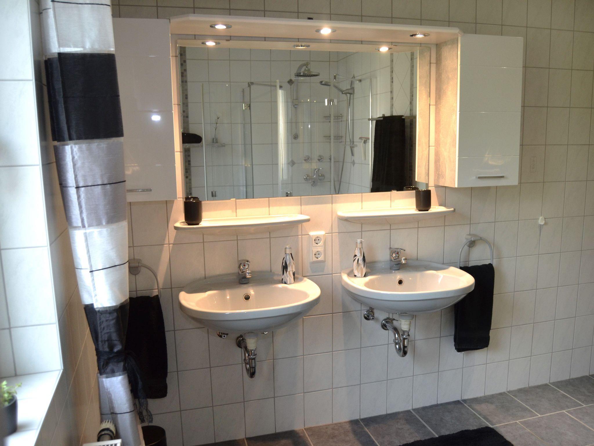 Das Obergeschoss bietet Ihnen ein Schlafzimmer mit begehbarem Kleiderschrank, einem französischem Bett mit 140cm breite und einem Doppelbett mit einer Breite von 200cm; ein weiteres Schlafzimmer mit einem 180cm breiten Bett und ein zweites Badezimmer mit Dusche, Badewanne und WC.