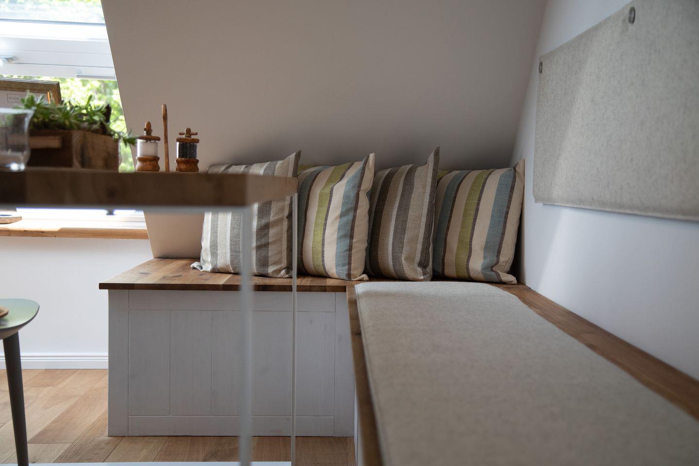 Mit einer Größe von 56 m² findet hier bequem Platz für bis zu vier Personen. Die Ferienwohnung im zweiten OG verfügt über zwei geschmackvoll eingerichtete Schlafzimmer mit hochwertige Parkettböden, die für eine warme Atmosphäre sorgen. In dem lichtdurchfluteten Wohnzimmer lädt eine gemütliche Sofaecke zum Entspannen ein, während ein Essbereich, der ausreichend Platz für gesellige Mahlzeiten bietet, dazu einlädt, die Zeit gemeinsam zu genießen. Die moderne Küche ist voll ausgestattet mit allen Annehmlichkeiten, die Sie benötigen: Ein Kühlschrank, Herd, Backofen und sogar eine Spülmaschine stehen Ihnen zur Verfügung. Genießen Sie Ihren Kaffee aus der bereitgestellten Kaffeemaschine auf dem "Balkon" oder der Terrasse im Garten.