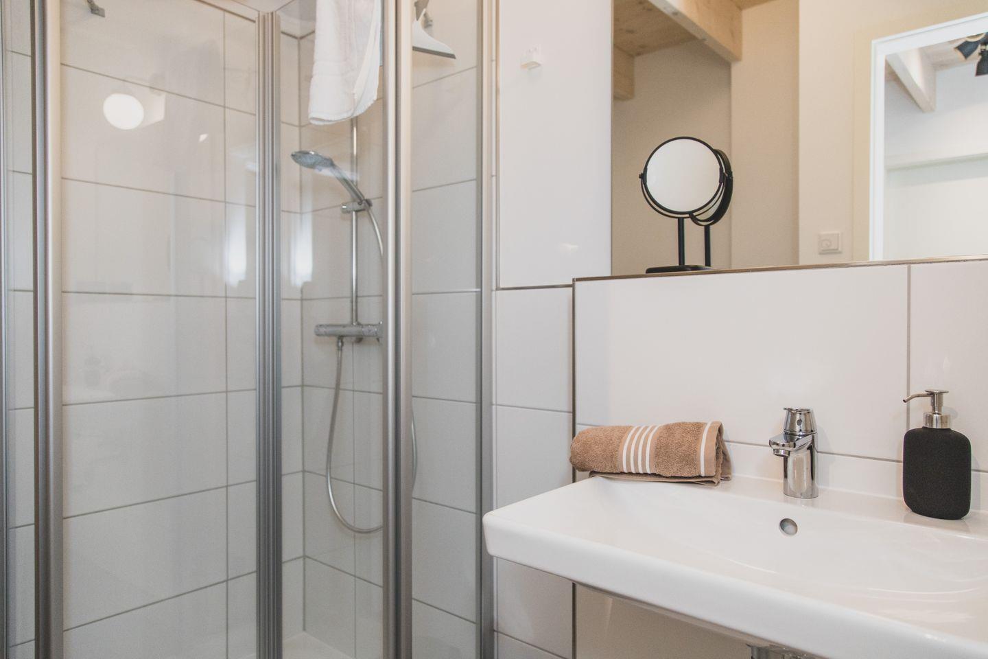 Mit einer großzügigen Fläche von 60 m² bietet die Ferienwohnung Platz für bis zu vier Personen und besteht aus zwei gemütlichen Schlafzimmern. Ideal für kleinere Familien oder zwei Paare, die gemeinsam reisen. Der offene Wohnbereich ist der perfekte Ort, um nach einem erlebnisreichen Tag zu entspannen. Hier finden Sie eine Sofaecke, einen Esstisch sowie eine moderne Küche, die komplett ausgestattet ist – vom Herd über die Spülmaschine bis hin zur Nespresso-Espressomaschine erwartet Sie alles, was Sie für Ihre kulinarischen Kreationen benötigen.