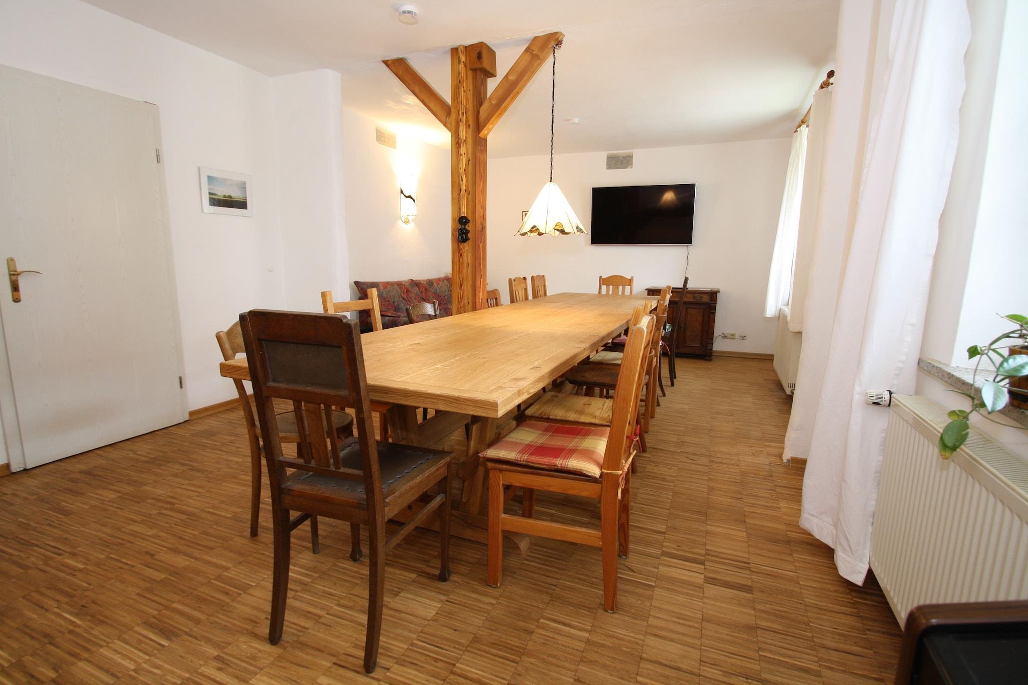 Moderne og koselig: Kjærlig innredet XXL gårdshus på en enorm hagetomt på 3300 kvadratmeter i utkanten av Mecklenburg-Sveits i det vakre naturreservatet Peenetal. Det er ingen gjennomgangstrafikk i den rolige byen på Peene, så fredsøkere og naturelskere vil finne det de leter etter her. I tillegg til en koselig grillplass har eiendommen barnehus, sandkasse og huske, samt badstue med hvilerom. En koselig stue med fullt utstyrt kjøkken, spiseplass, gulvvarme og peis gir også plass til koselige kvelder. Traner og storker sees tydelig i det varierte landskapet med skog, enger og elver. For utflukter på nærliggende Peene, kanoer og kajakker inkludert redningsvester er tilgjengelig i båten skur. Den Upost distriktet i Peene dalen ved Lake Kummerower See er en del av kommunen Warrenzin, som igjen er en del av Mecklenburg Lakes Plateau og vest av byen Demmin har deler av denne regionen blitt utpekt som naturreservat siden 2010. Kuttingen av dykene har skapt et paradis for sjeldne fuglearter som villgås. Området er et populært ferieområde, spesielt for vannvandrere, fordi med sine mange skoger, enger og elver tilbyr ideelle forhold for en bekymringsfri dag i frisk air.You vil også finne noen sjeldne flora og fauna here.Rural ro på sitt beste! et særtrekk nær Upost er en stor stein grav i midten av skogen, som sjelden finnes i denne regionen og kan skyldes dens megalittiske arkitektur. Detaljer: 2 kanoer og 7 kajakker Aktiviteter i nærheten: Padle dine egne kanoer eller kajakker på Peene eller Kummerower See og stopp ved restaurant Aalbude, hvor du kan spise deilig fisk. Eller start S