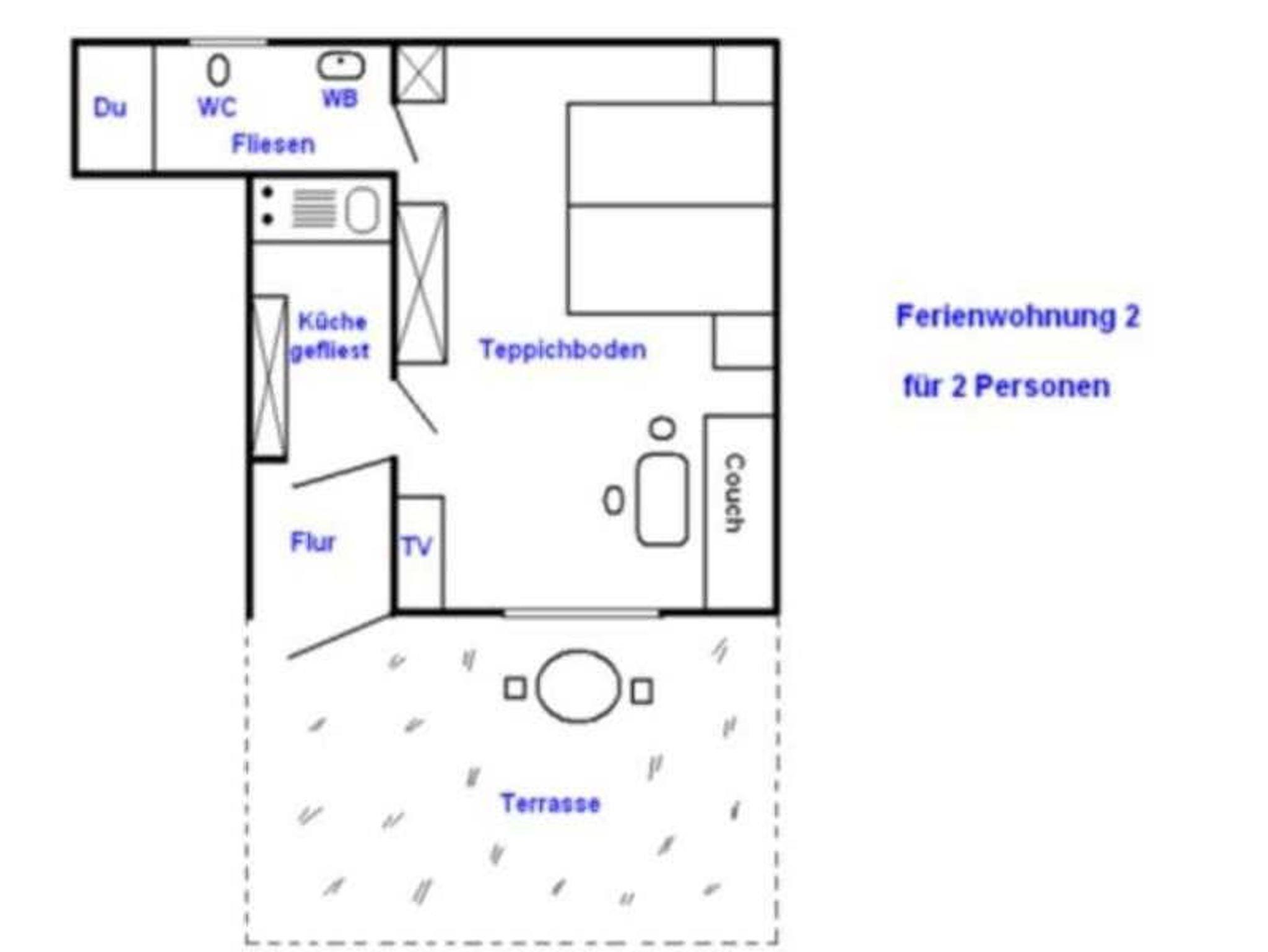 1 komb. Wohn- u. Schlafzimmer bis 2 Personen, Küche, Du/WC, Sat/TV/Radio, Garten, Terrasse mit Sitzecke, Grill, Parterre, sep. Eingang, Bettwäsche und Handtücher pro Person 12,00 Euro oder selbst mitbringen, Gaststätten, Einkaufsmöglichkeiten (Aldi, Netto) und Bäcker 2 min., Nichtraucherwohnung, Parkplatz vor dem Haus,