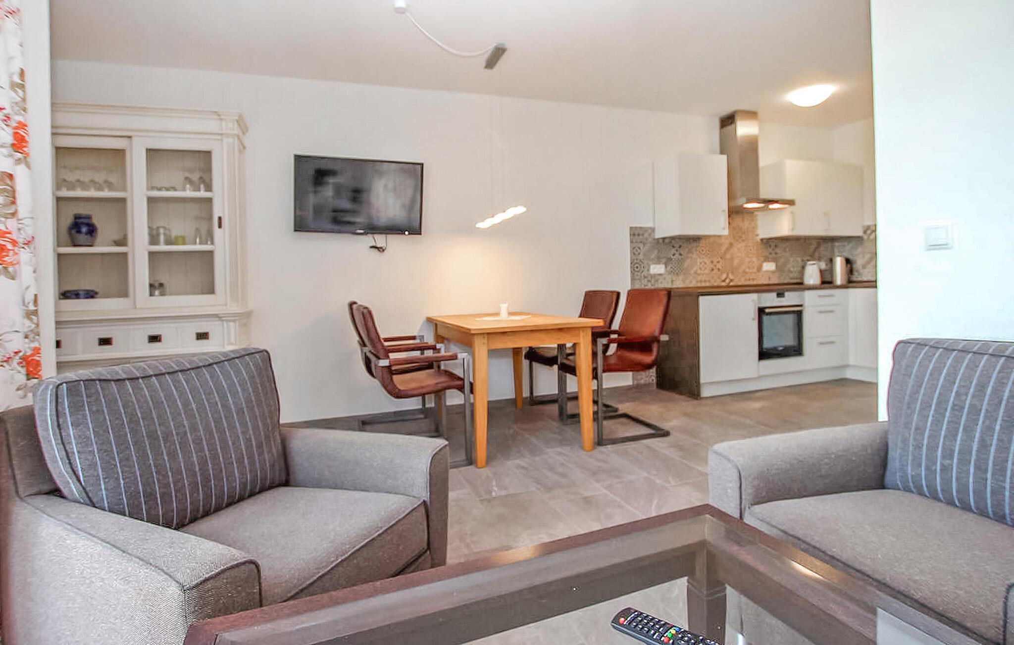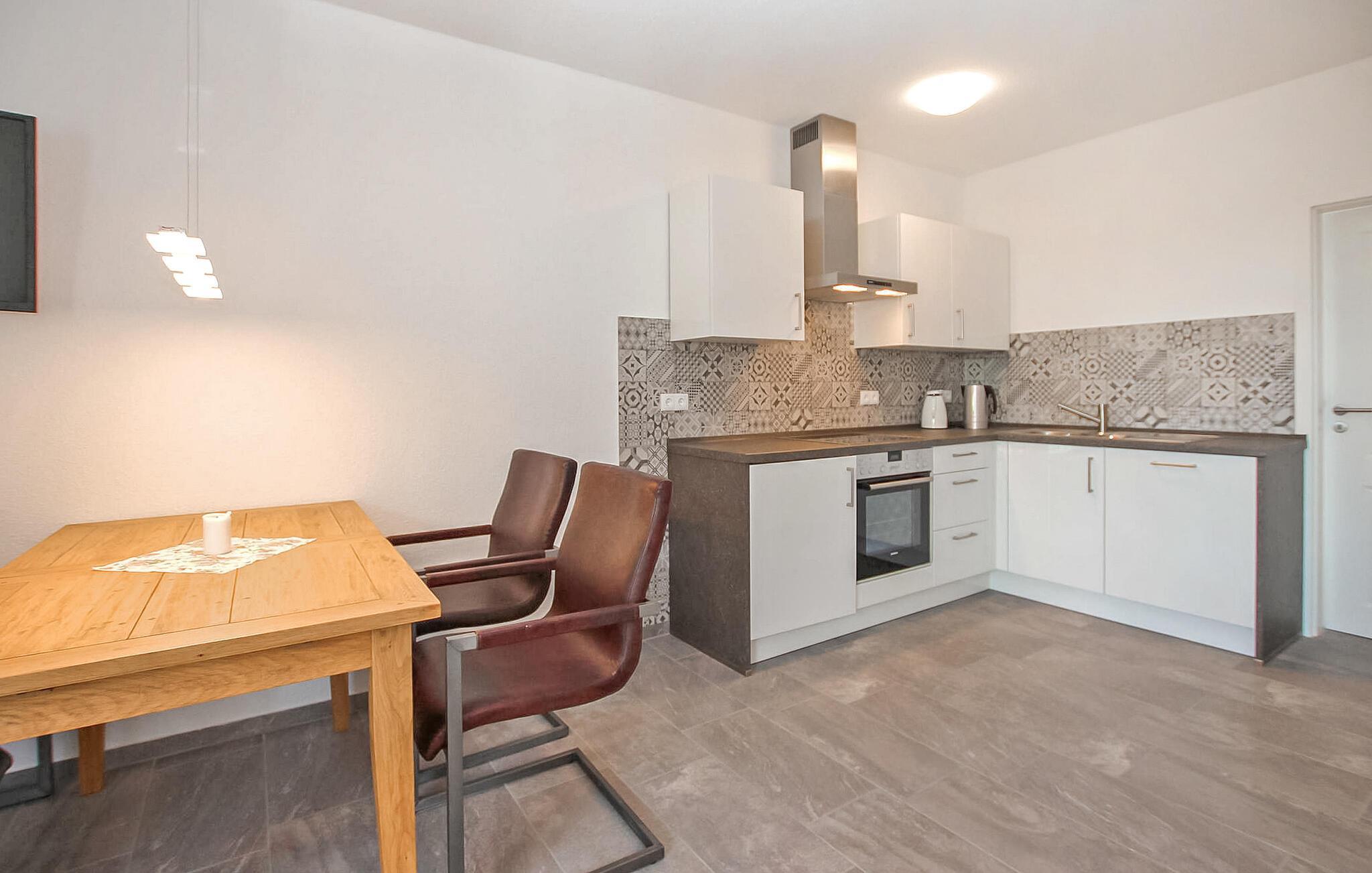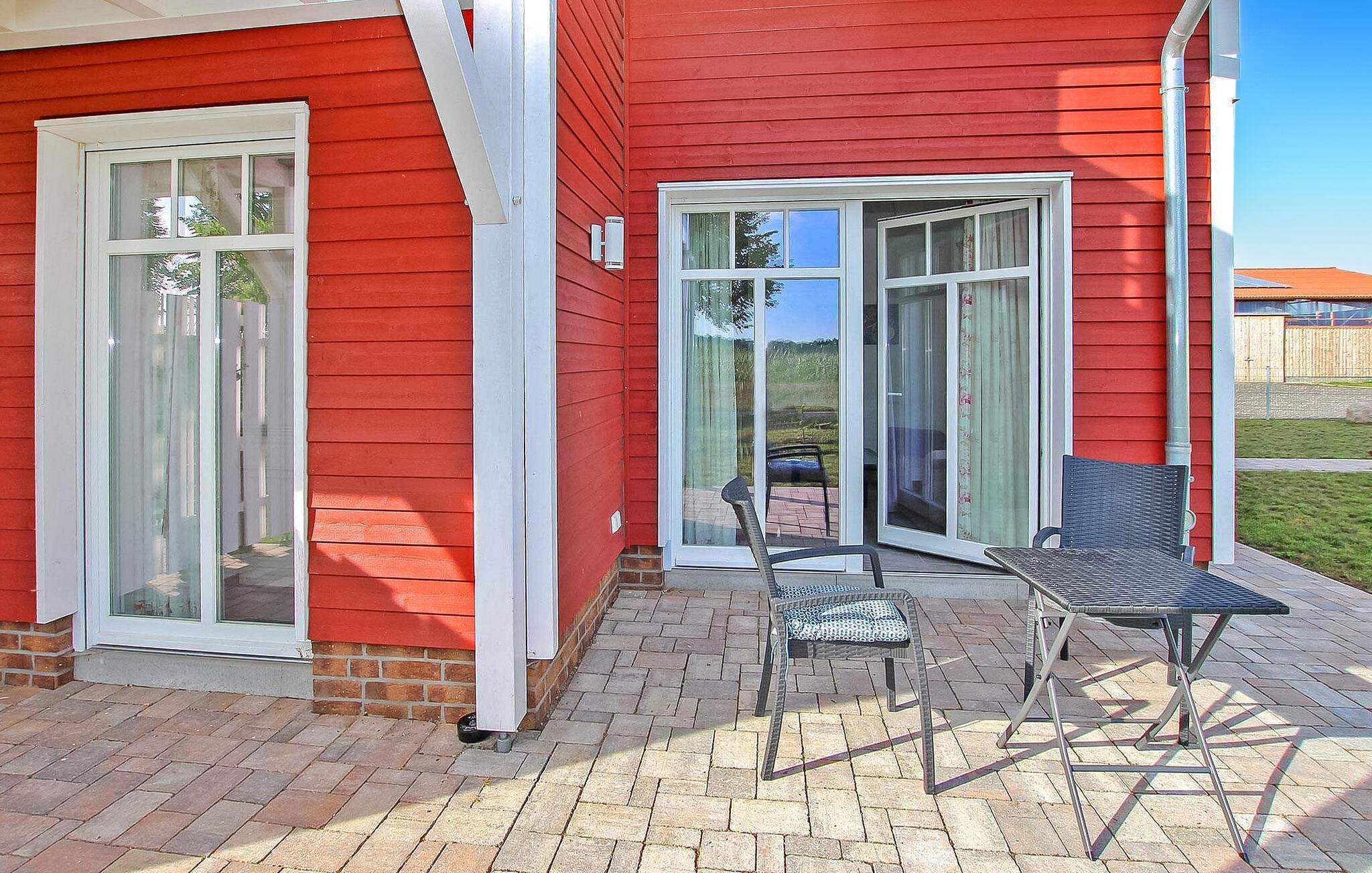 Denne sentralt oppvarmede, røykfrie leiligheten med egen inngang ligger i første etasje (40 kvm) i huset og nås via en felles gang. Leiligheten er utstyrt med stue, sittegruppe med polstret suite (spisebord, flatskjerm-TV), åpen kjøkkenløsning (elektrisk komfyr med stekeovn, kjøleskap, oppvaskmaskin, diverse små kjøkkenapparater), soverom (dobbeltseng), bad (dusj, WC) og terrasse. Parkeringsplasser, grill, barneseng og barnestol på forespørsel og W-LAN er også tilgjengelig.