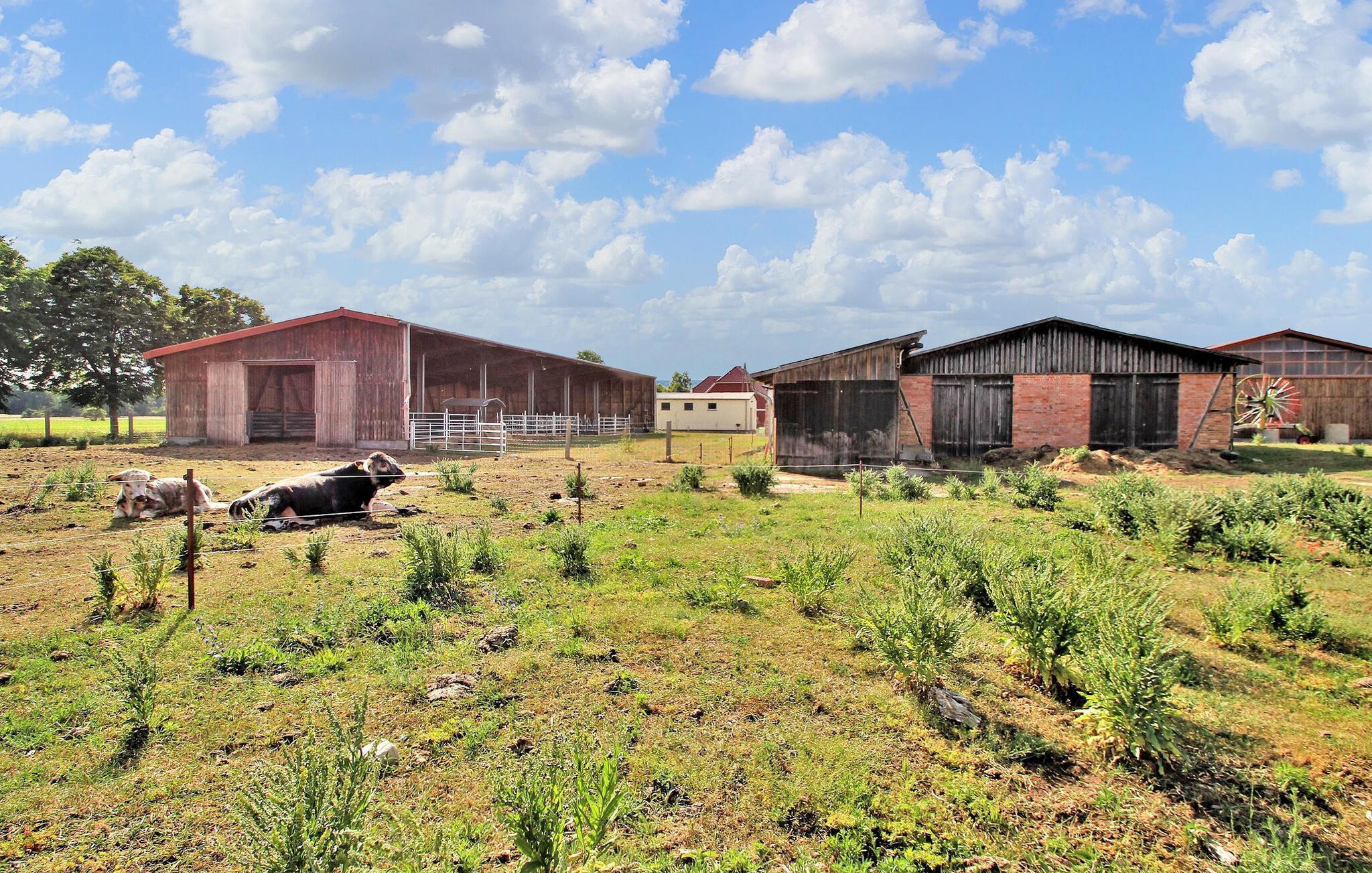 I idyllisk ro og familiær atmosfære, langt fra byens støy, på en britisk Longhorn-gård, ligger det to ferieleiligheter for 2 og 4 personer på den ca. 300 m² store inngjerdede eiendommen i tomannsboligen i et bolighus som ble bygget i 2017. De drives bærekraftig av store solcellepaneler på stallen og låven, der gjestene fortsatt kan oppleve det ekte livet på landet sammen med en rustikk besetning av ammekyr, høner, sauer og geiter av gamle raser i ekstensivt beitebruk. Blant annet gjess og traner føler seg hjemme i det åpne skogs- og englandskapet foran terrassen eller balkongen. Den rolige beliggenheten til leilighetene, litt unna landsbyen, er et ideelt utgangspunkt for omfattende sykkelturer. Området byr også på utallige turstier, badeplasser og andre utflukter for både voksne og barn.