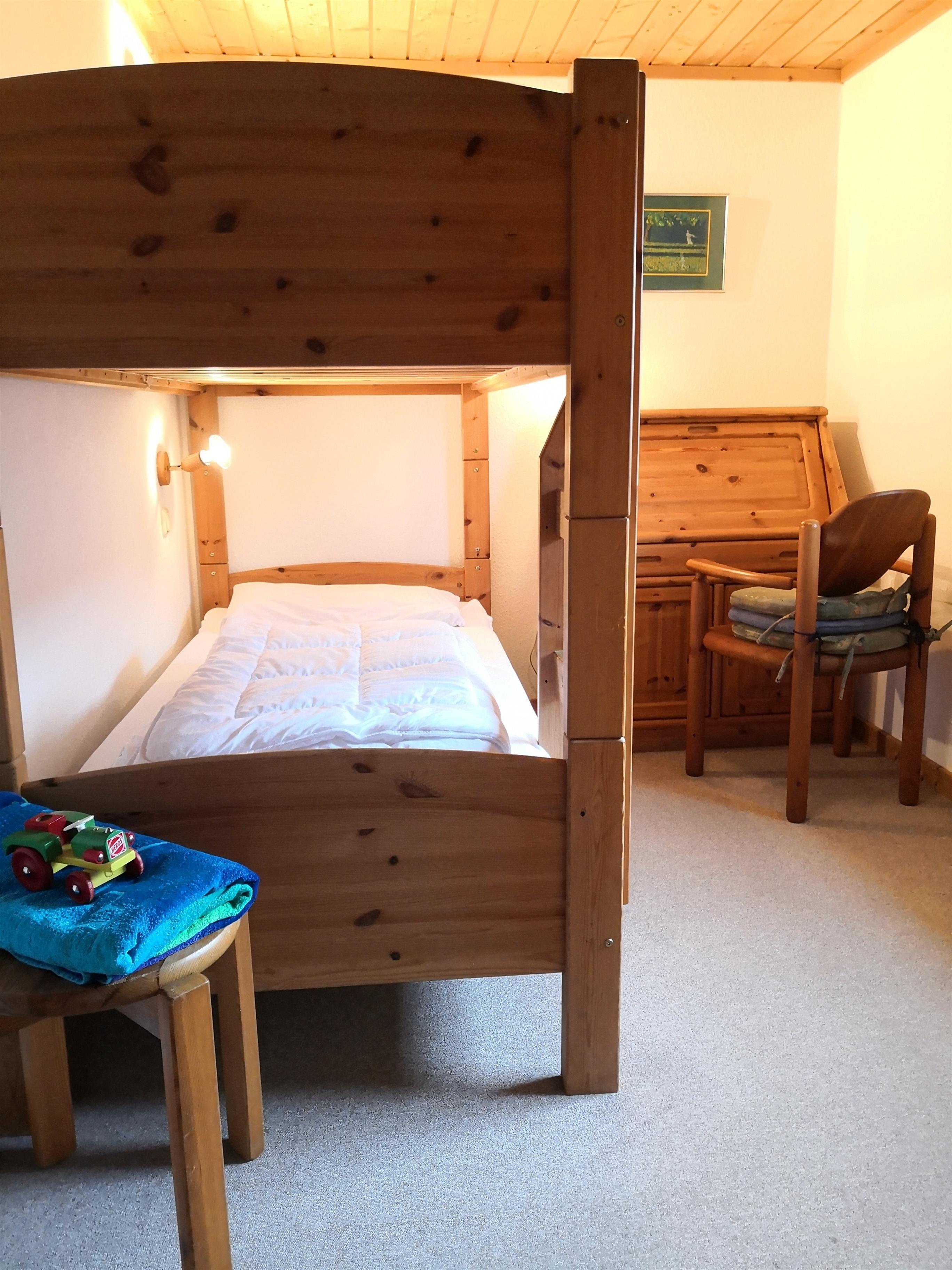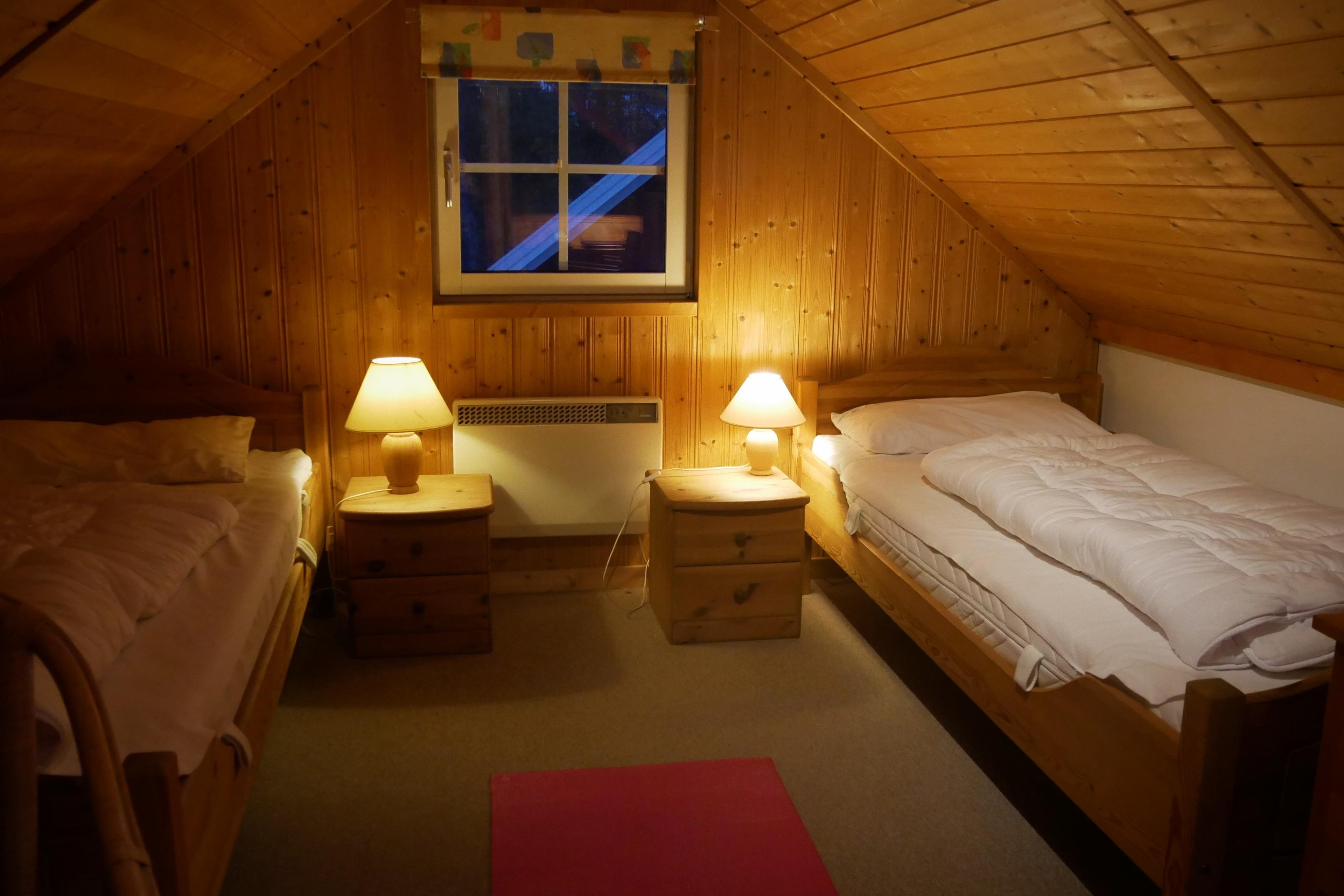 Das Ferienhaus verfügt über 2 Schlafräume im Erdgeschoss (ein Doppelbett, ein Etagenbett); außerdem befindet sich ein weiterer Schlafraum mit zwei Einzelbetten und einer kleinen Sitzgruppe auf der Galerie im Dachgeschoss, der durch eine Glaswand vom darunter liegenden Wohnbereich abgetrennt ist. Alle Schlafbereiche sind mit Fliegengittern ausgestattet.