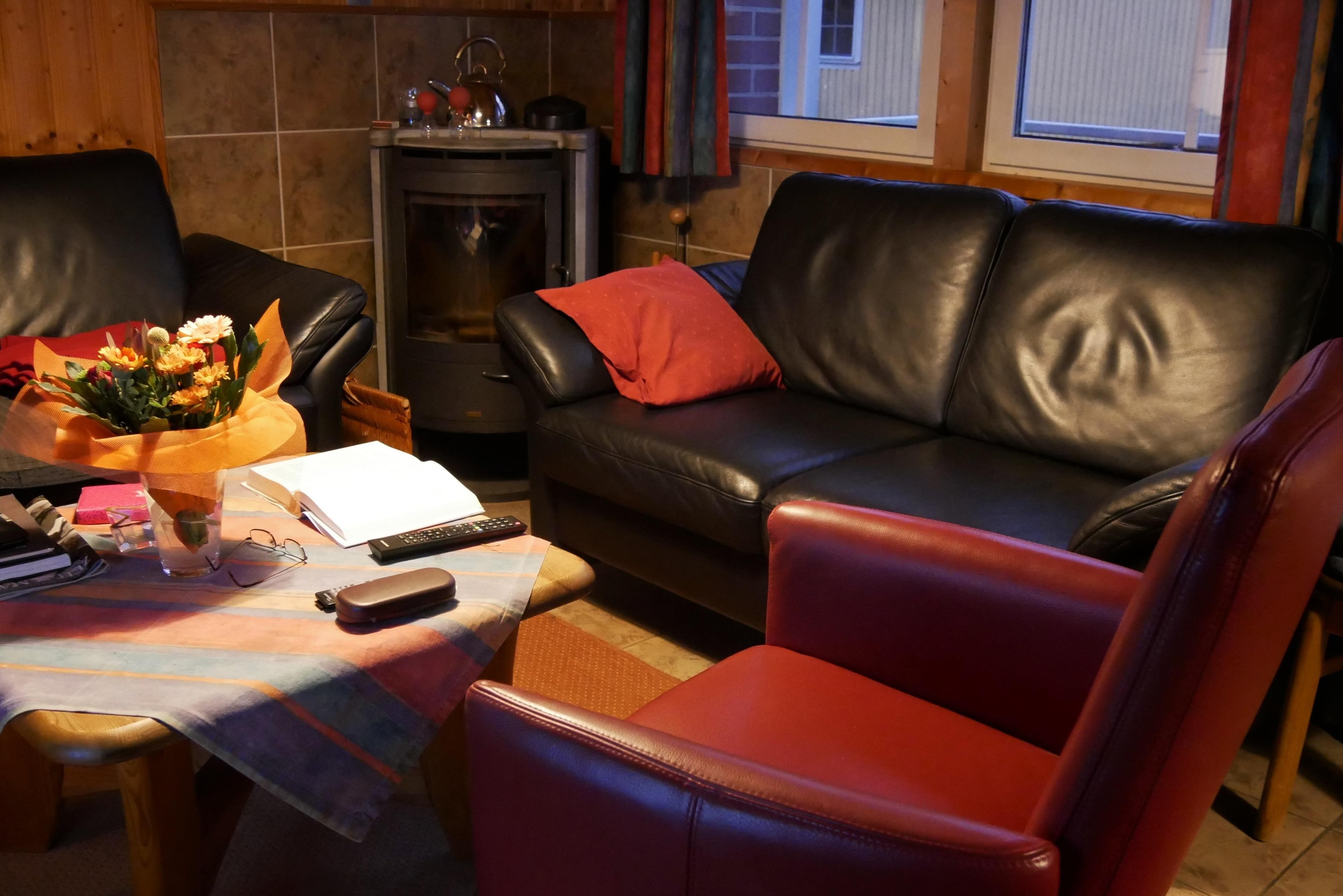 Der Wohn-/Aufenthaltsraum mit Flachbildschirm-TV/Sat und Radio lädt mit zwei bequemen Ledersofas und einem Sessel rund um einen Speckstein-Kaminofen zum Lesen und Entspannen ein. Von dort treten Sie direkt auf Ihre Terrasse und die dahinter liegende offene Rasenfläche. Sonnenschirm und Terrassenmöbel samt Sitzpolstern sind vorhanden.