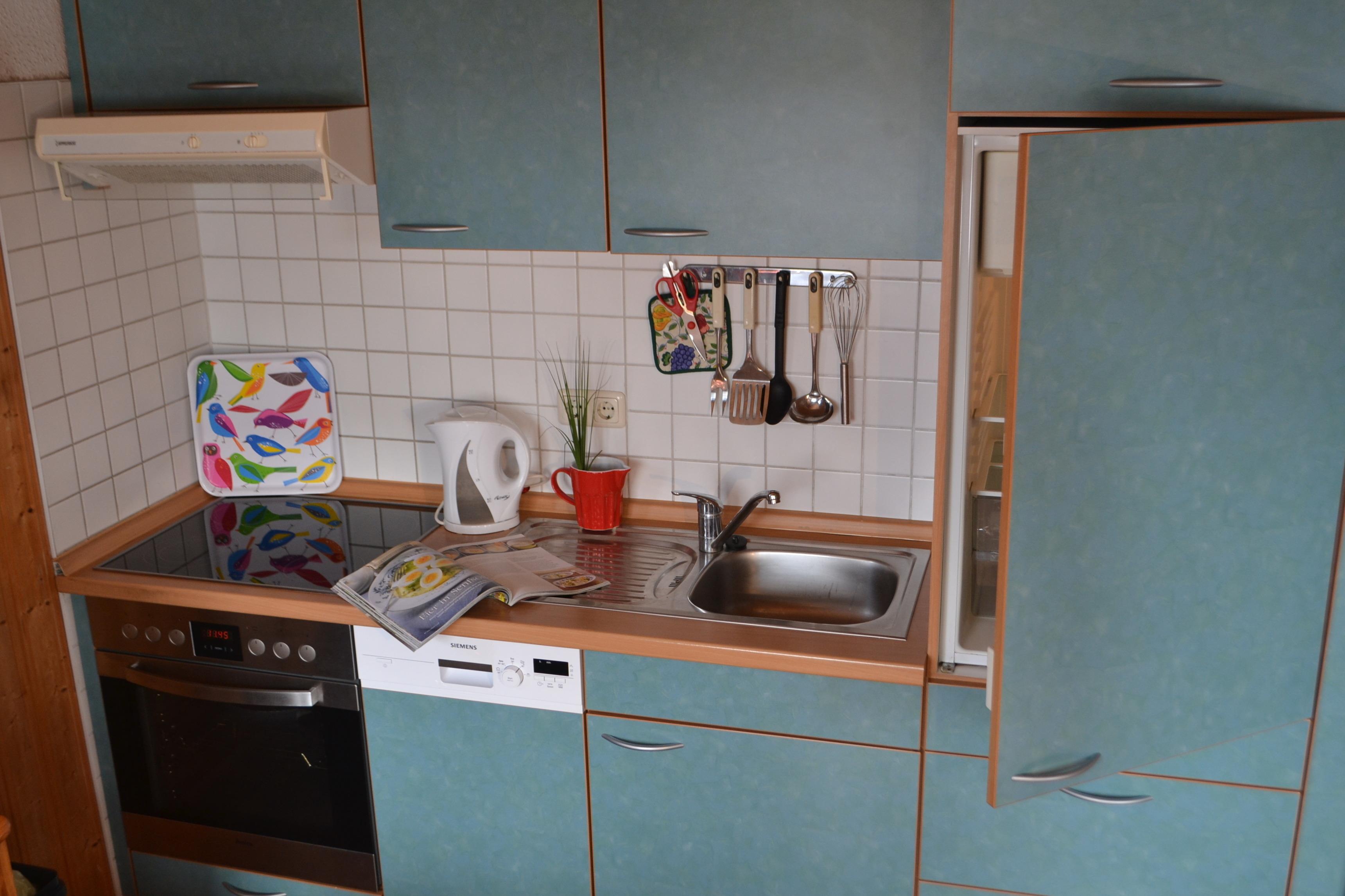 Die Küche ist komplett eingerichtet (Spülmaschine, CERAN-Kochfeld, Backofen, Dunstabzug, Kühlschrank mit Gefrierfach, Mikrowelle, Kaffeemaschine, Wasserkocher. Toaster etc.).