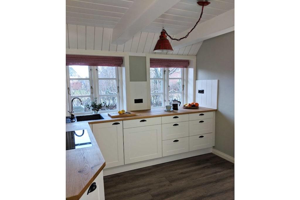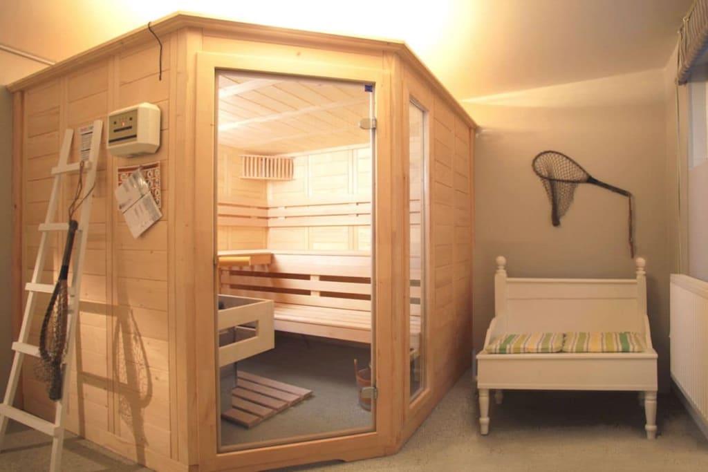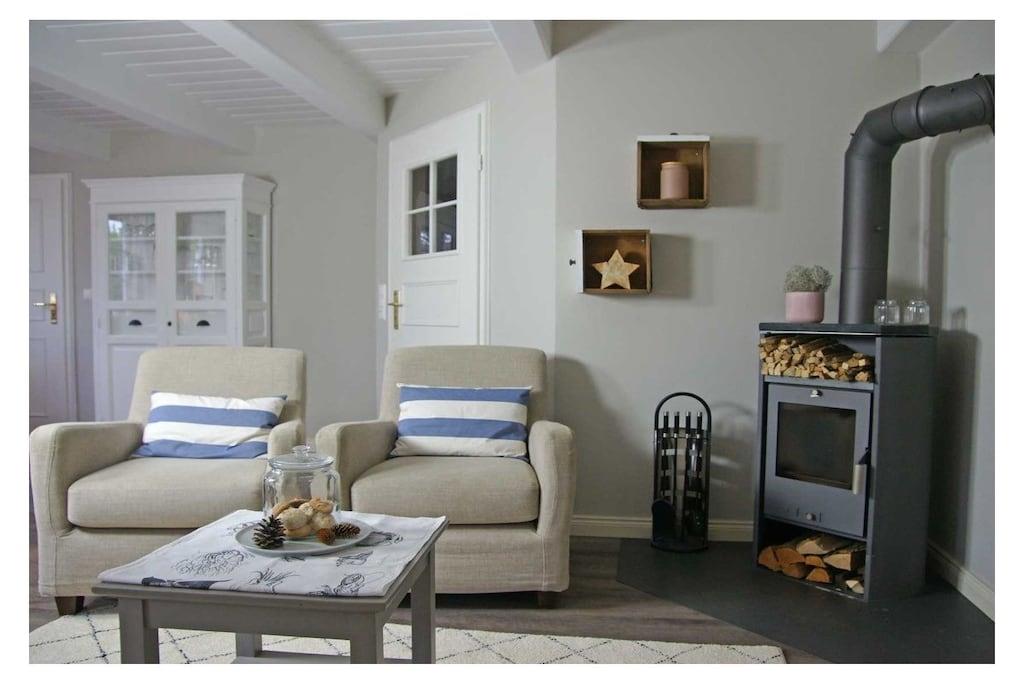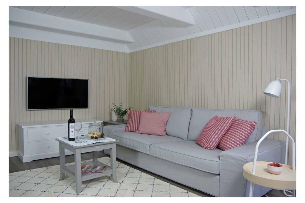 Nyt din solrike, private sør- og vestvendte hage med terrasse, privat strandstol og solsenger, samt den fredelige beliggenheten med enkel tilgang til stranden og landsbyen med dens utmerkede fasiliteter. Kjeller: Lekerom for barn, badstue med avslapningsområde, samt vaskemaskin og tørketrommel til fri bruk. Første etasje: Entré med garderobe, dusjrom/WC, kjøkken, romslig stue og spisestue med vedovn, satellitt-TV (Sky, DAZN, Netflix) og tilgang til den sørøstvendte terrassen/hagen med hagemøbler og strandstol. Første etasje: Gang med trapp til loftet, to doble soverom, dusjrom/WC og et tredje soverom med en alkove-køyeseng for to personer. Loft: Ekstra lekerom med TV og Xbox.