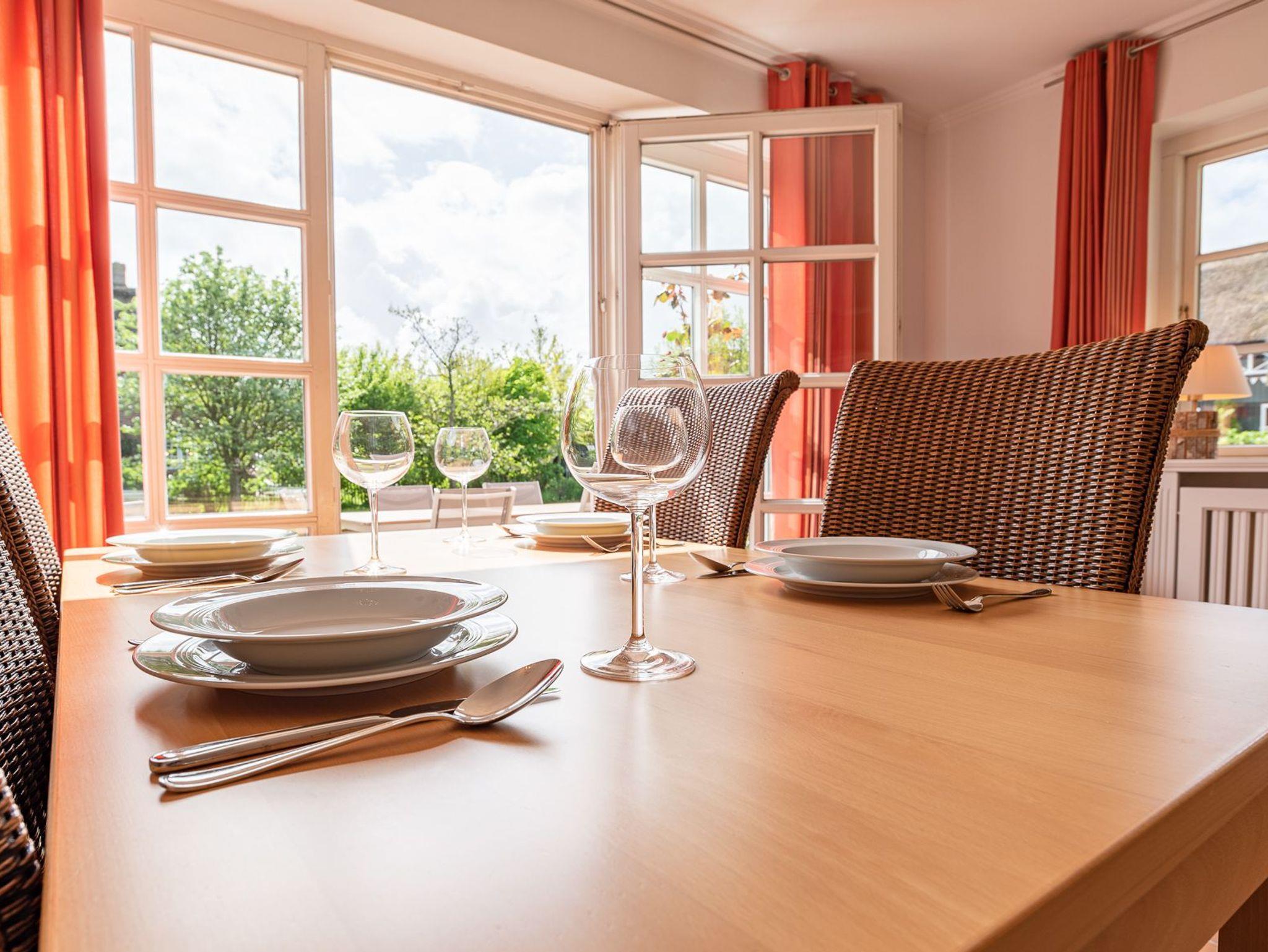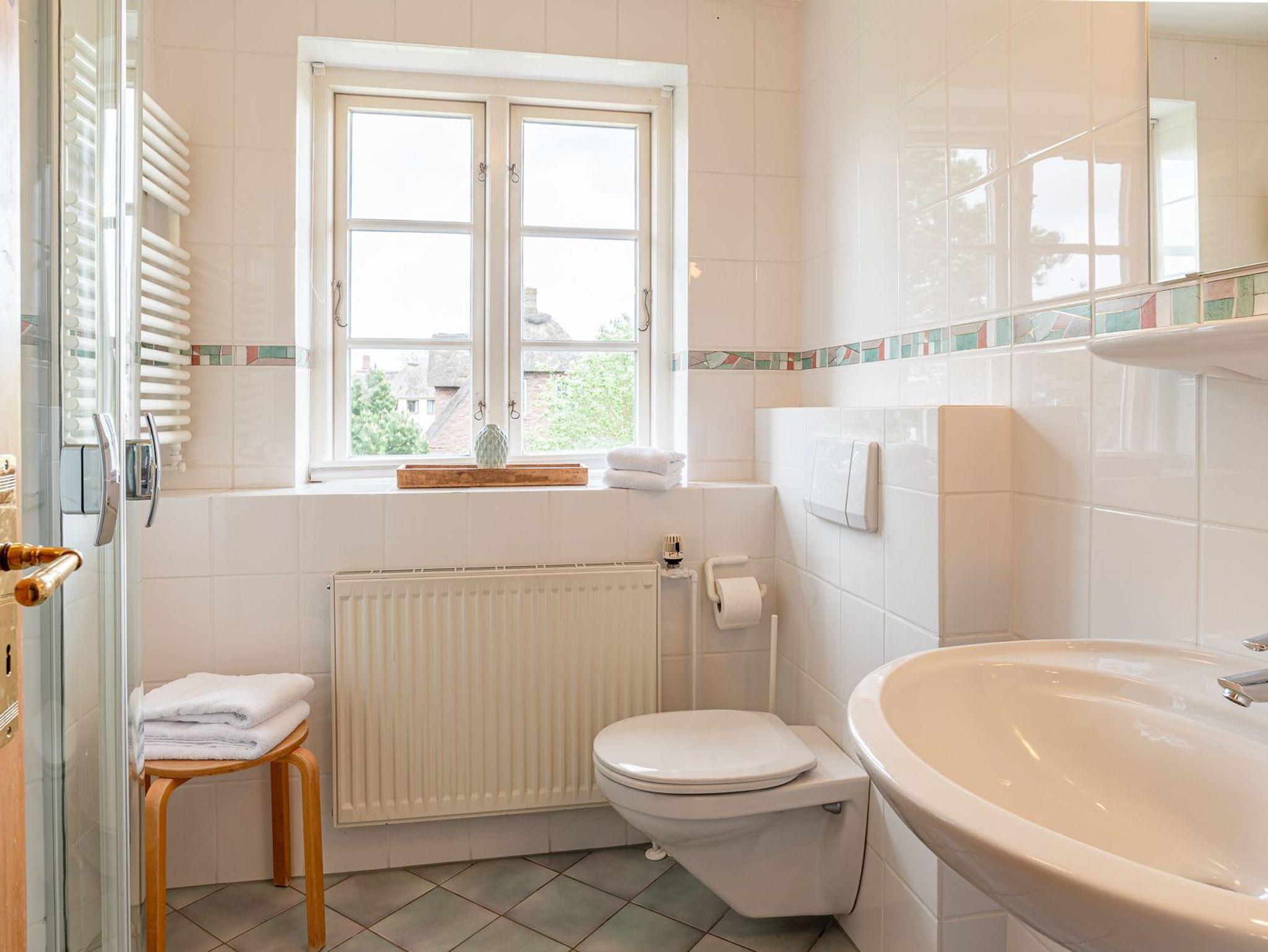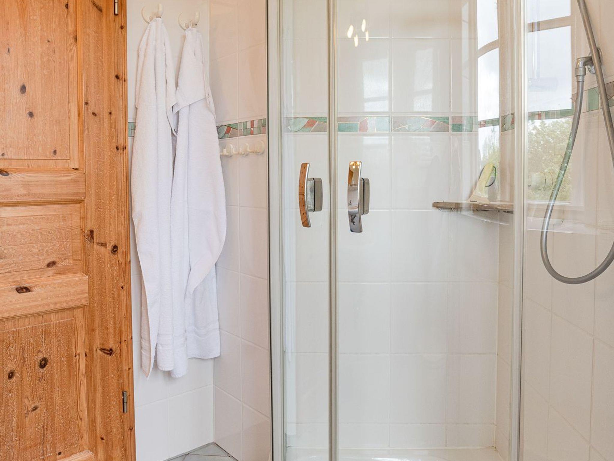 Durch die Seitentür gelangen Sie in den Vorflur in dem sich die Garderobe befindet und von dem man ins erste Duschbad gelangt. Weiter gelangt man in den großzügigen Wohn- und Essbereich, in dem sich auch der Zugang zur Terrasse und der Kaminofen befinden. Über die Treppe gelangen Sie in das 1. Obergeschoss mit zwei Schlafzimmern und dem zweiten Duschbad. Ein Schlafzimmer davon ist mit zwei Einzelbetten (hintereinander) und eins mit einem Doppelbett ausgestattet. Das dritte Schlafzimmer unter dem Dach ist mit einem Doppelbett ausgestattet.