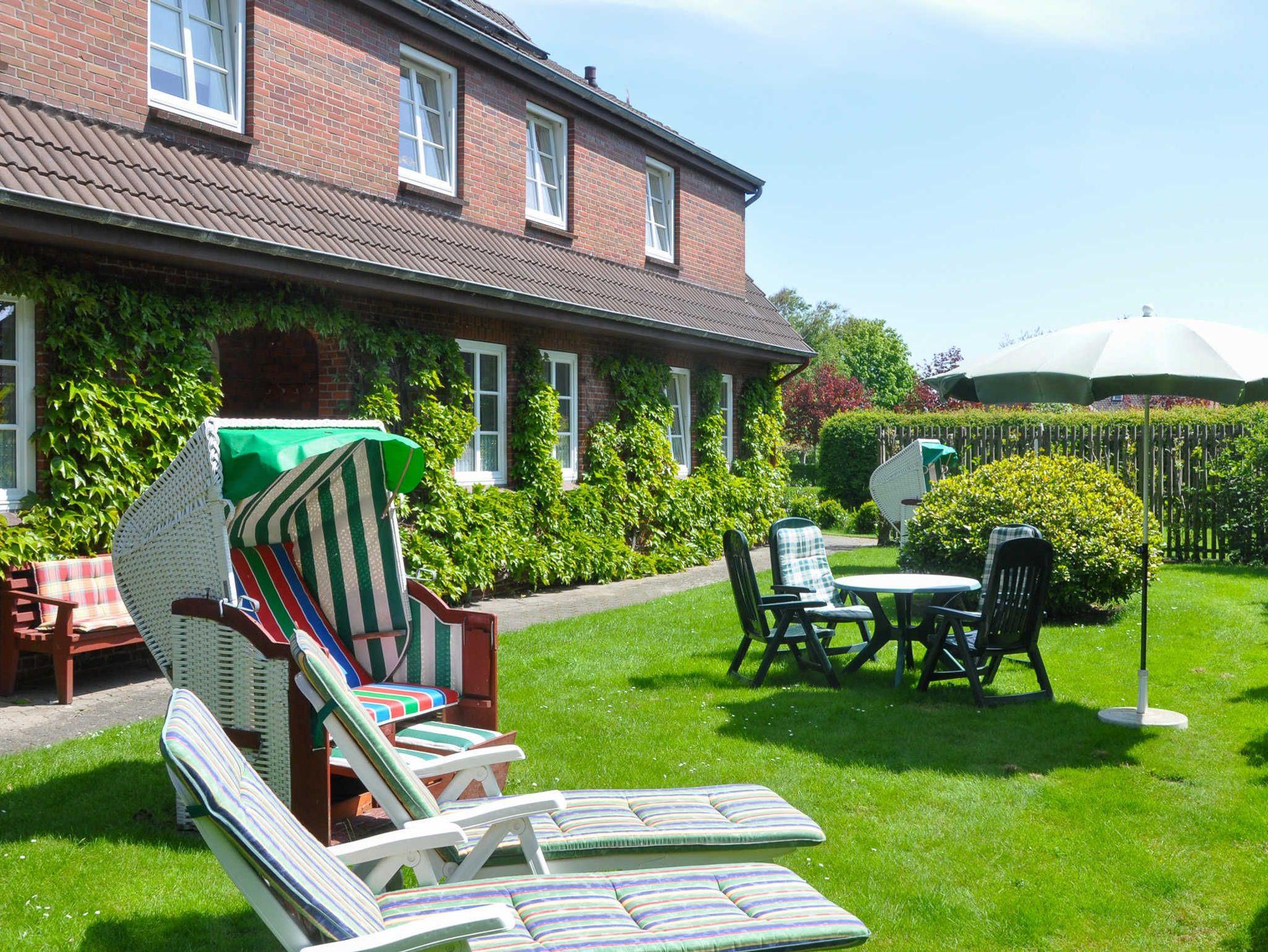Außenbereich: Garten/Liegewiese (gemeinsch.), Gartenmöbel, Sonnenschirm, Strandkorb.