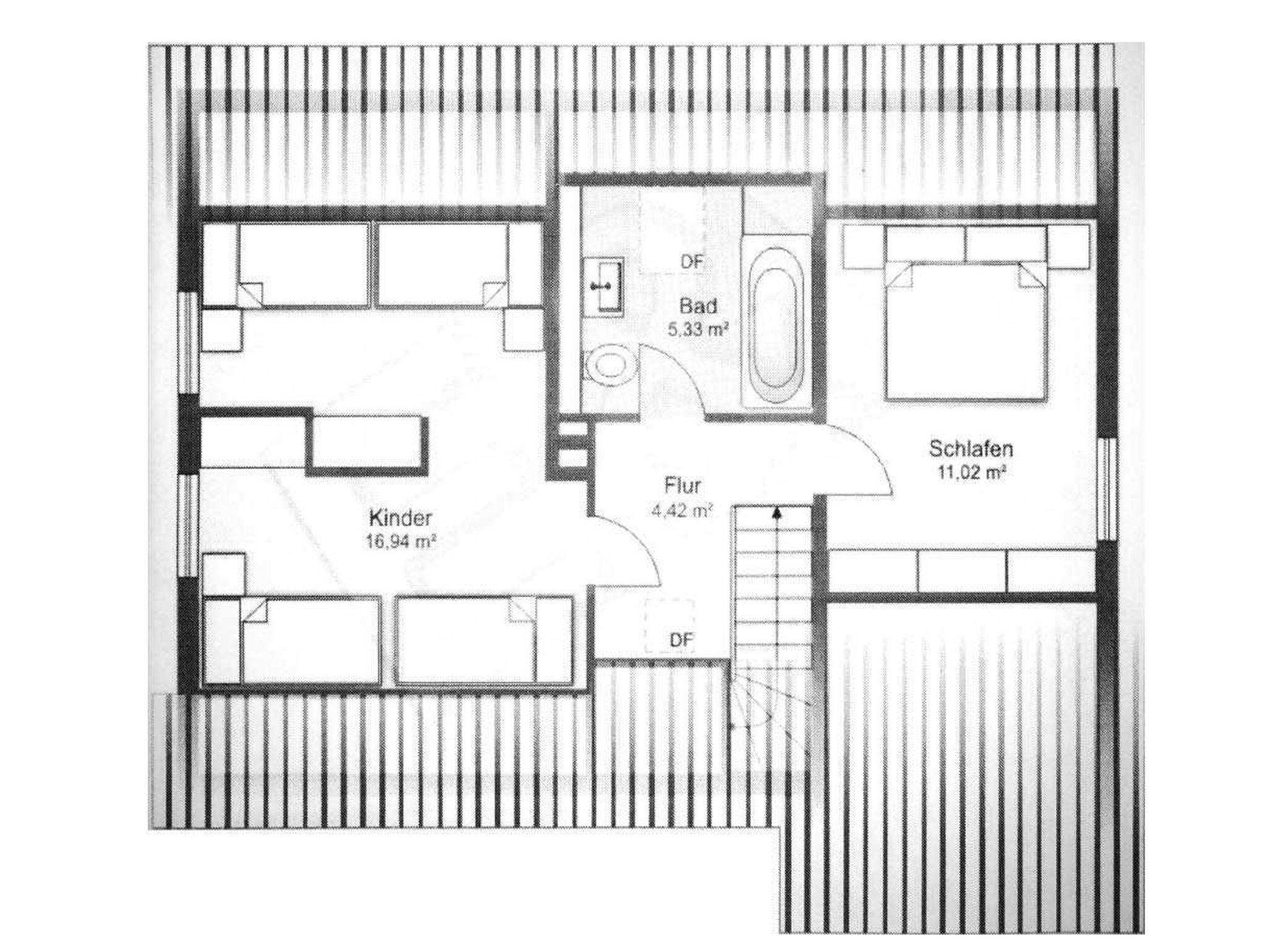 Raumaufteilung: 1 Schlafraum (3 Einzelbetten), 1 Schlafraum (1 Doppelbett), 1 Schlafraum (1 Doppelbett), 1 Wohnraum, 2 Flure, 1 separate Küche, 1 Badezimmer mit Dusche, 1 Badezimmer mit Badewanne.