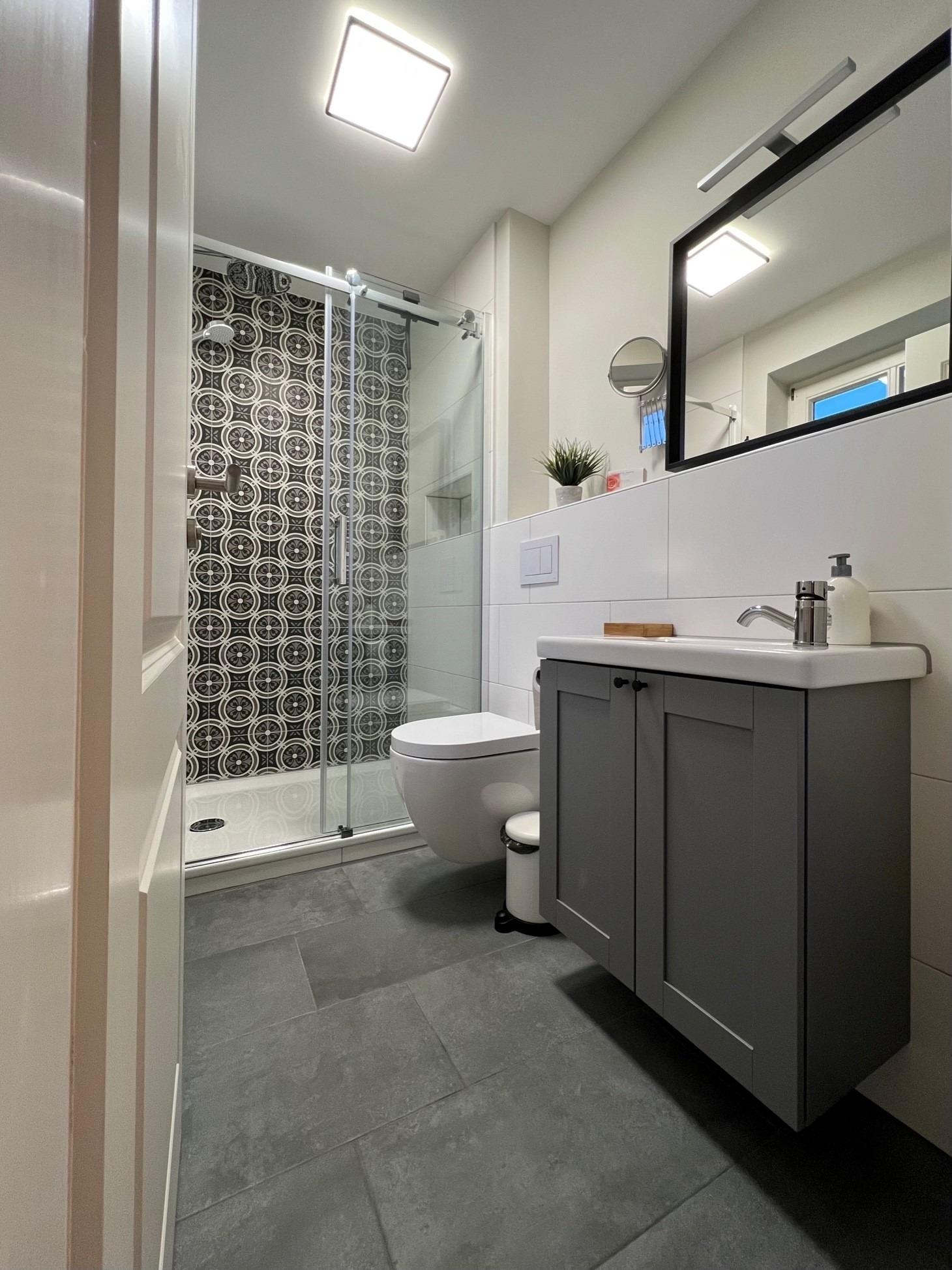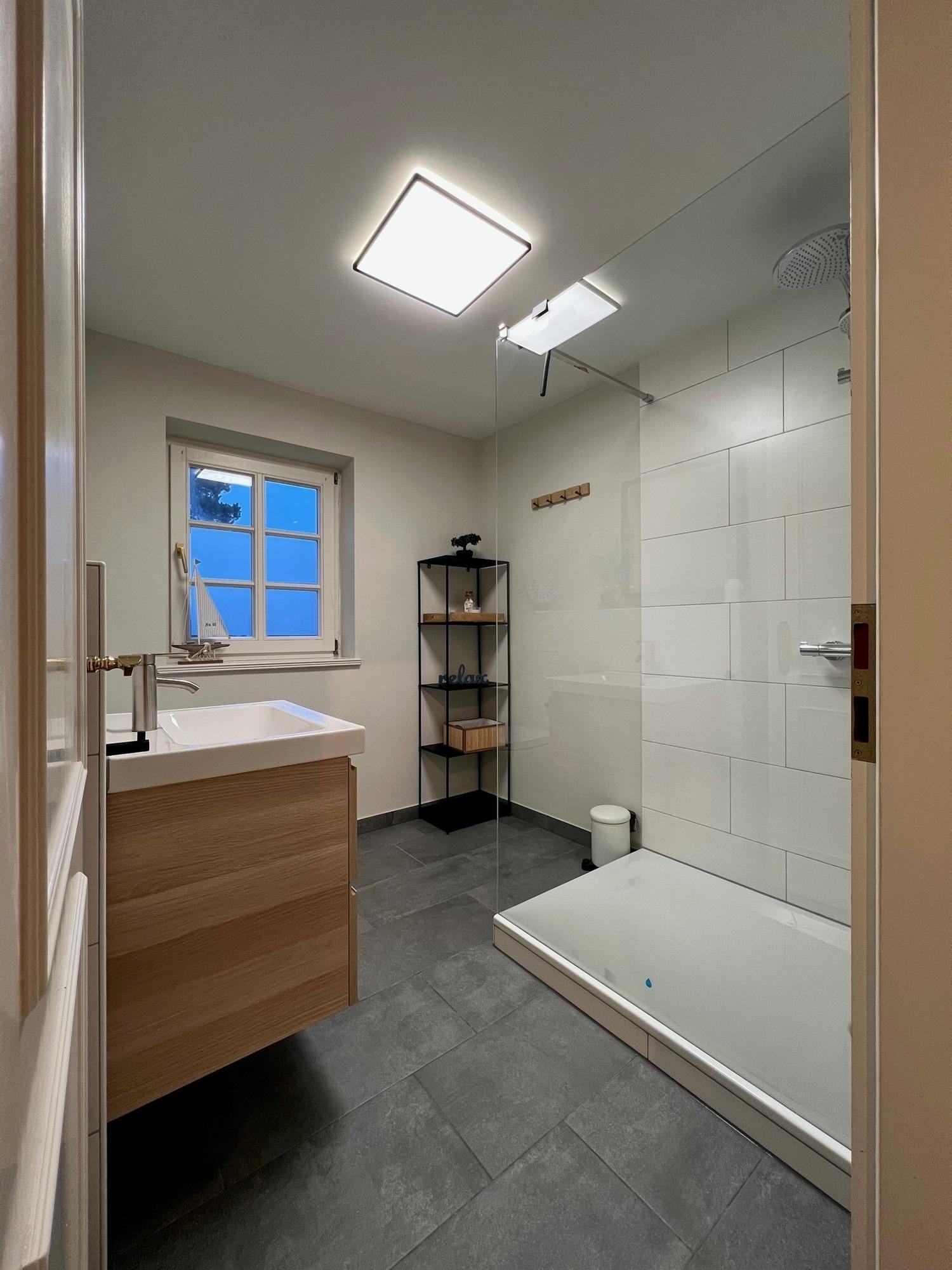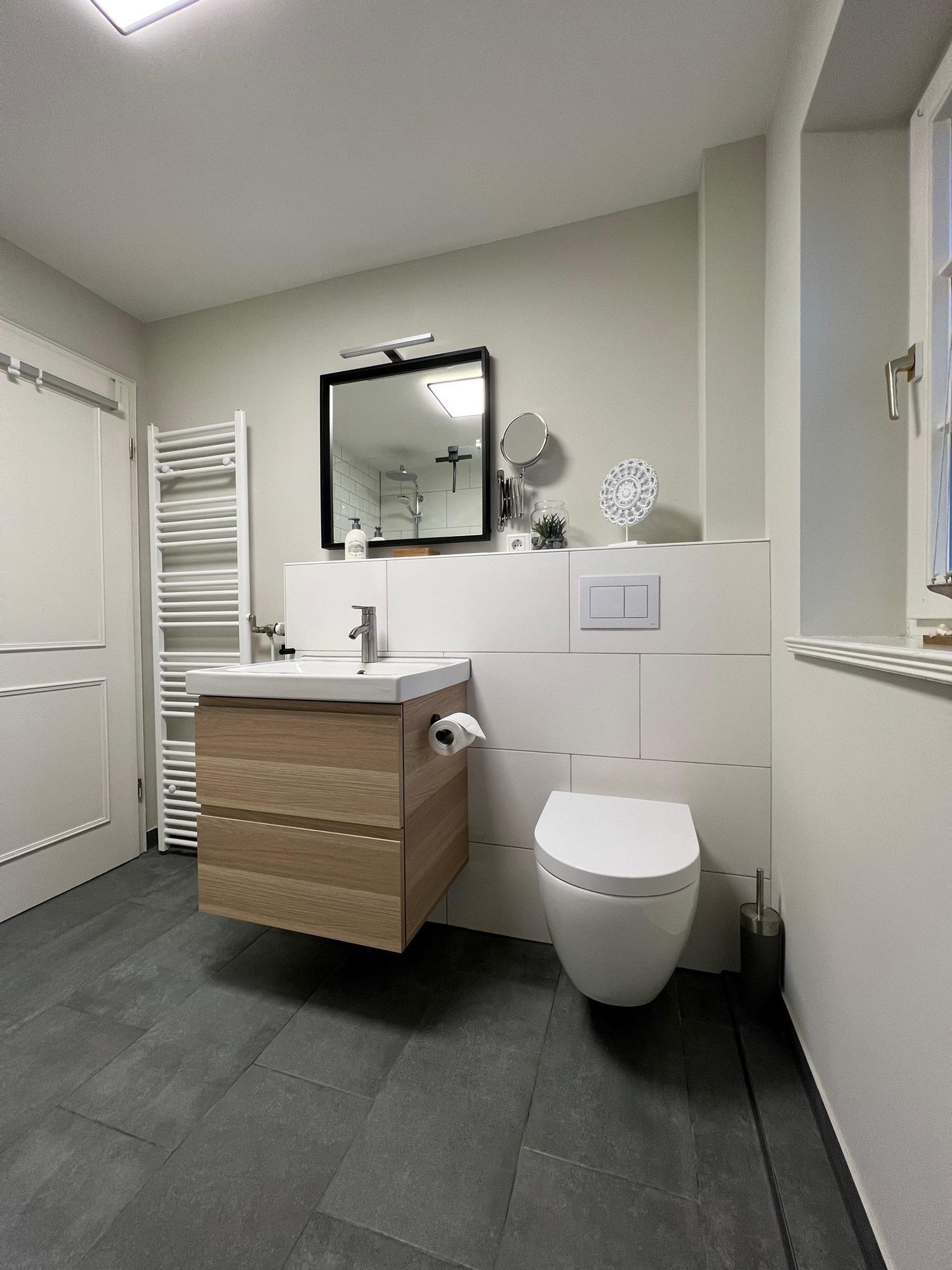 Beide Bäder sind mit einer großen Dusche mit Rainshower und Fussbodenerwärmung ausgestattet. Das Bad im 1. OG verfügt dazu noch über einen Handtuchhalterheizkörper.