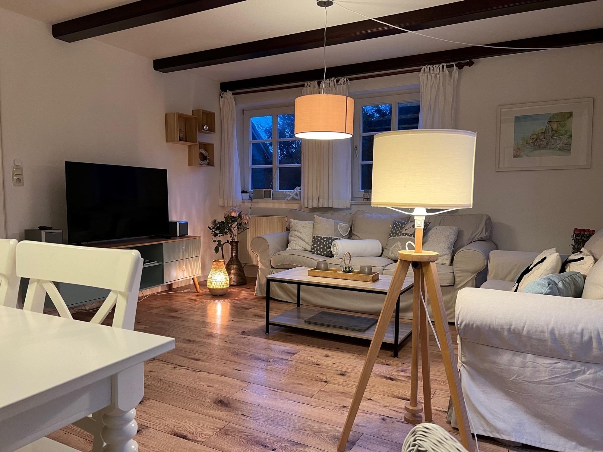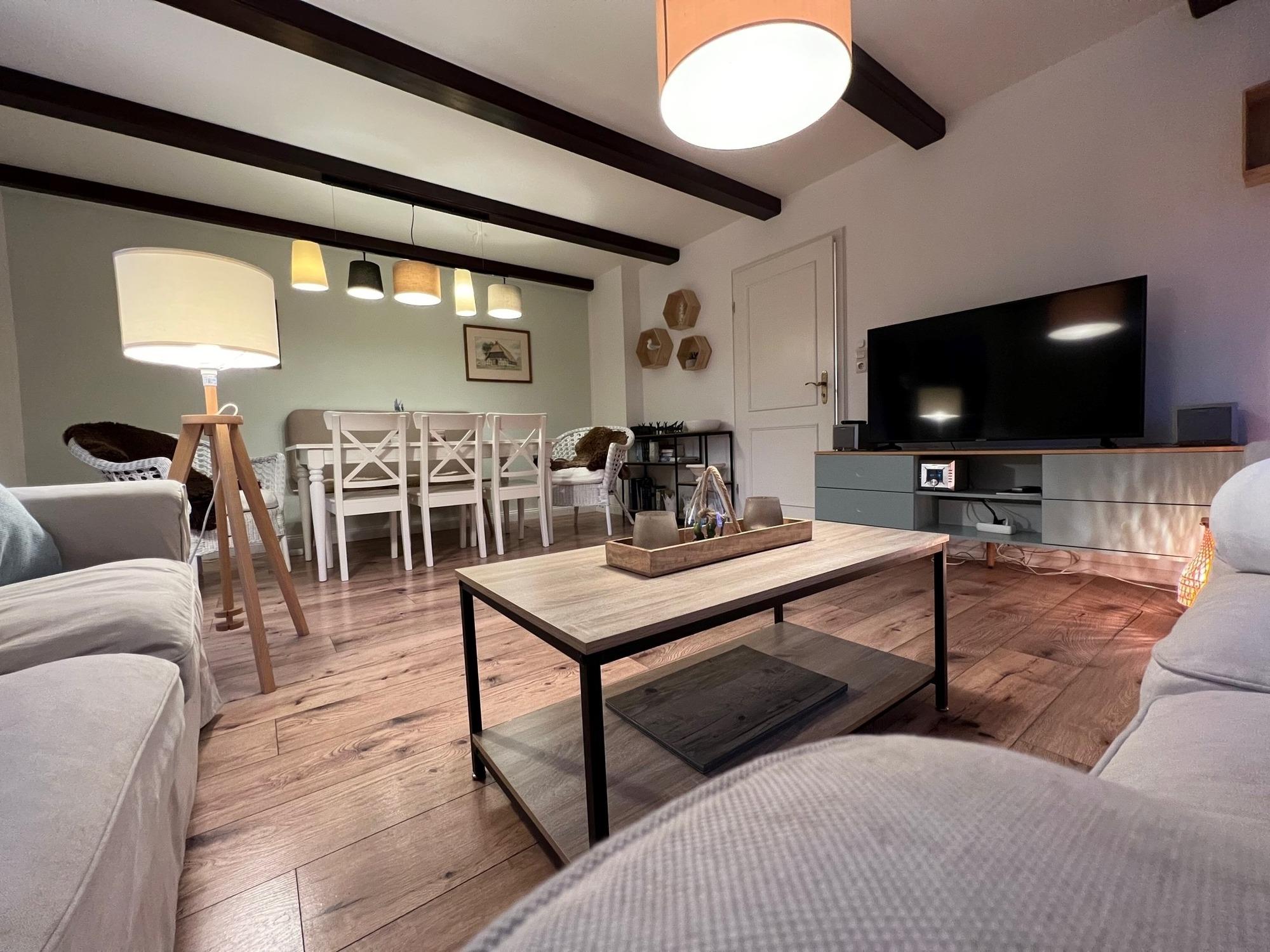 Das Wohnzimmer im Erdgeschoss hat einen Smart-TV, sowie Gesellschaftsspiele und Bücher.