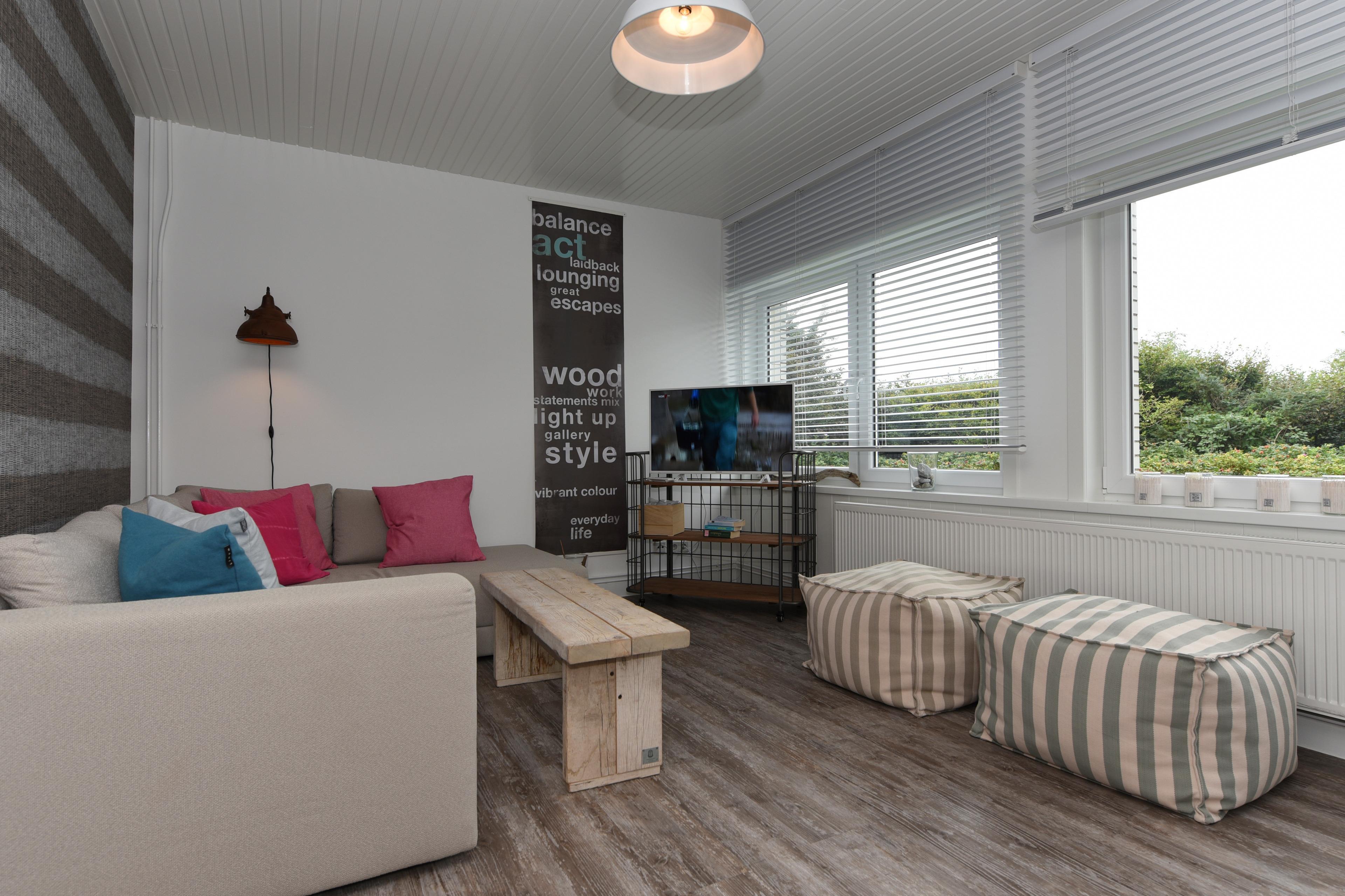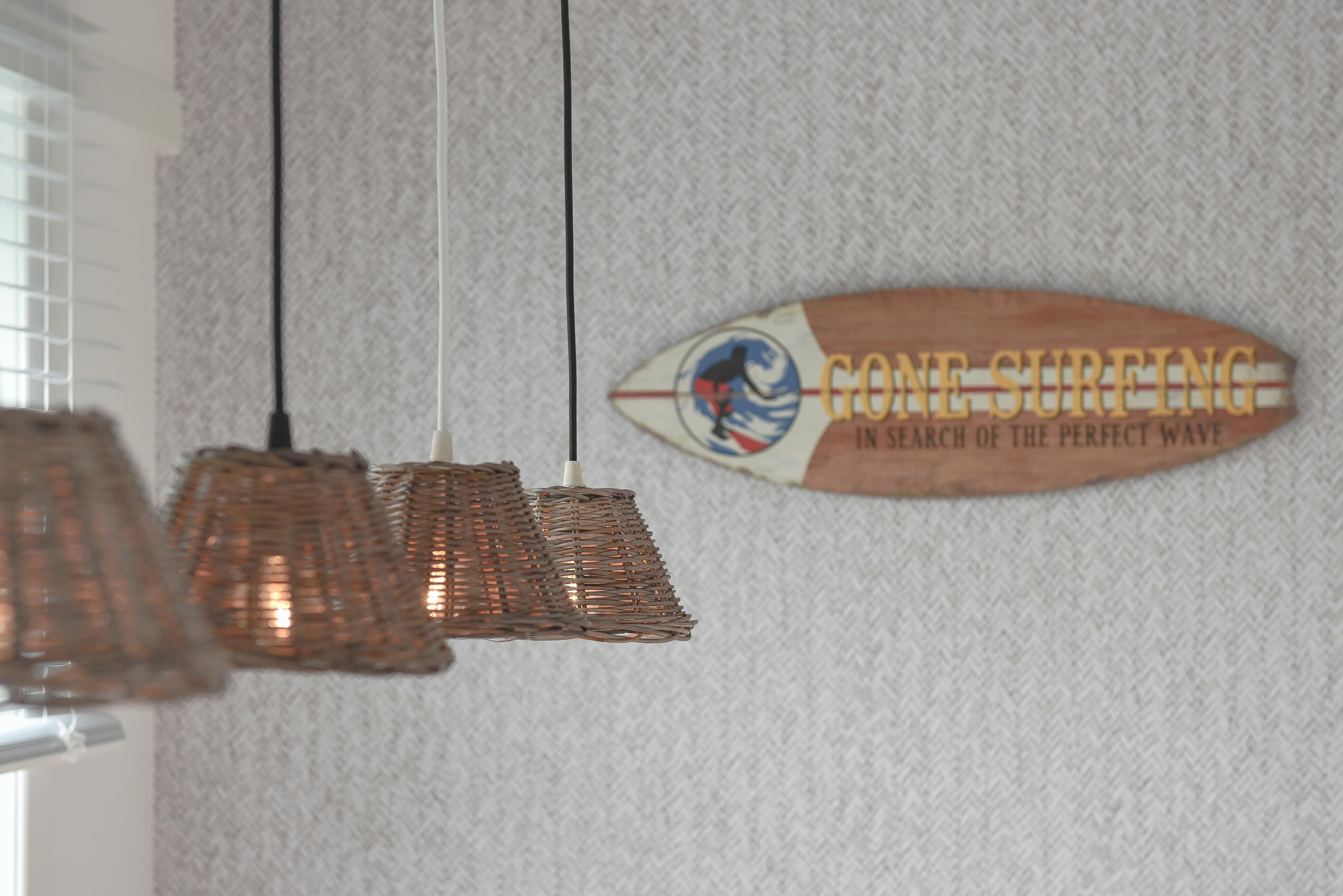 Eine große, gemütliche Couch lädt zum Entspannen nach einem aufregenden Tag am Strand oder auf dem Surfboard ein, während die Fensterfronten das gesamte Raumambiente mit natürlichem Licht durchfluten.