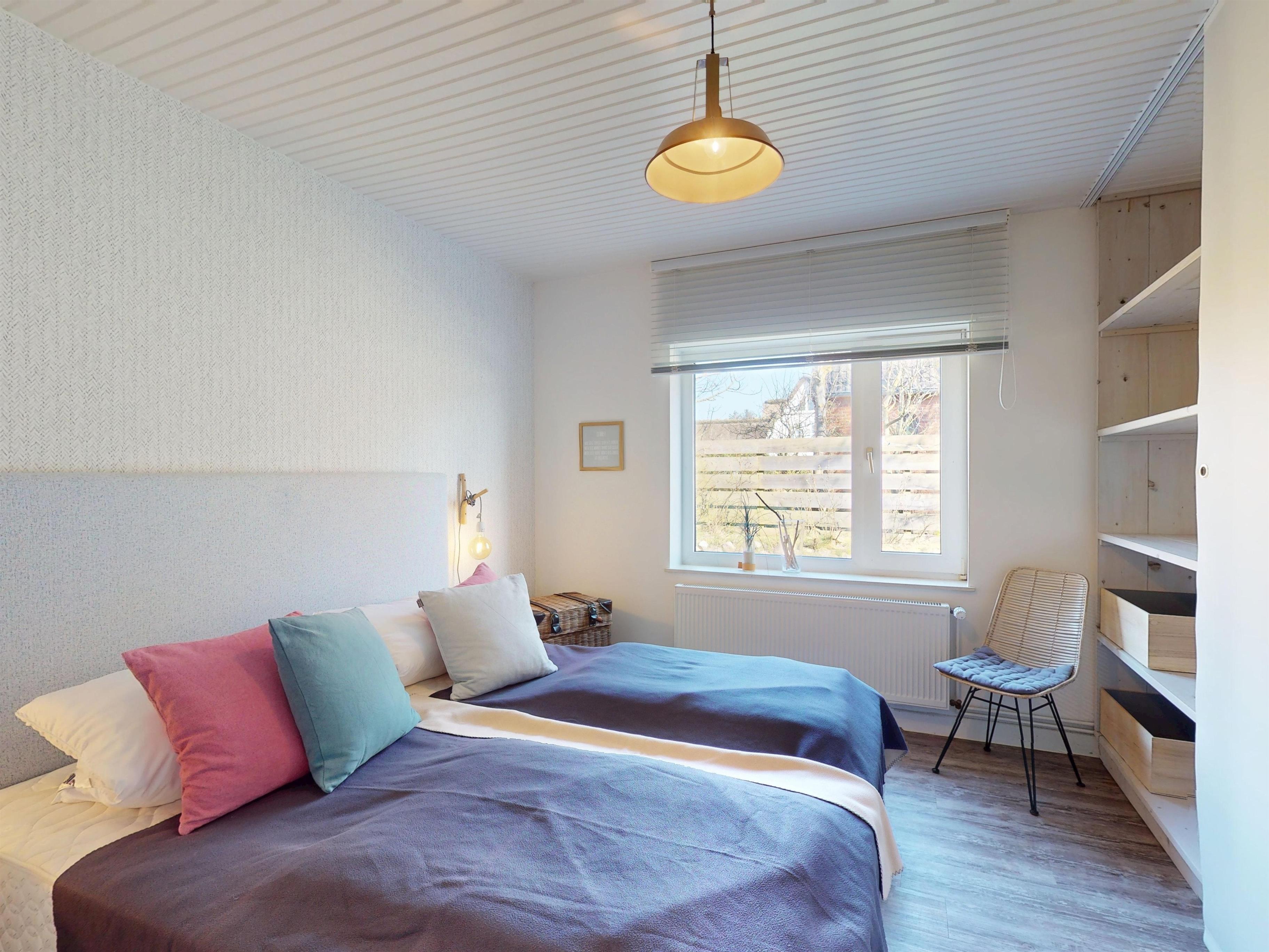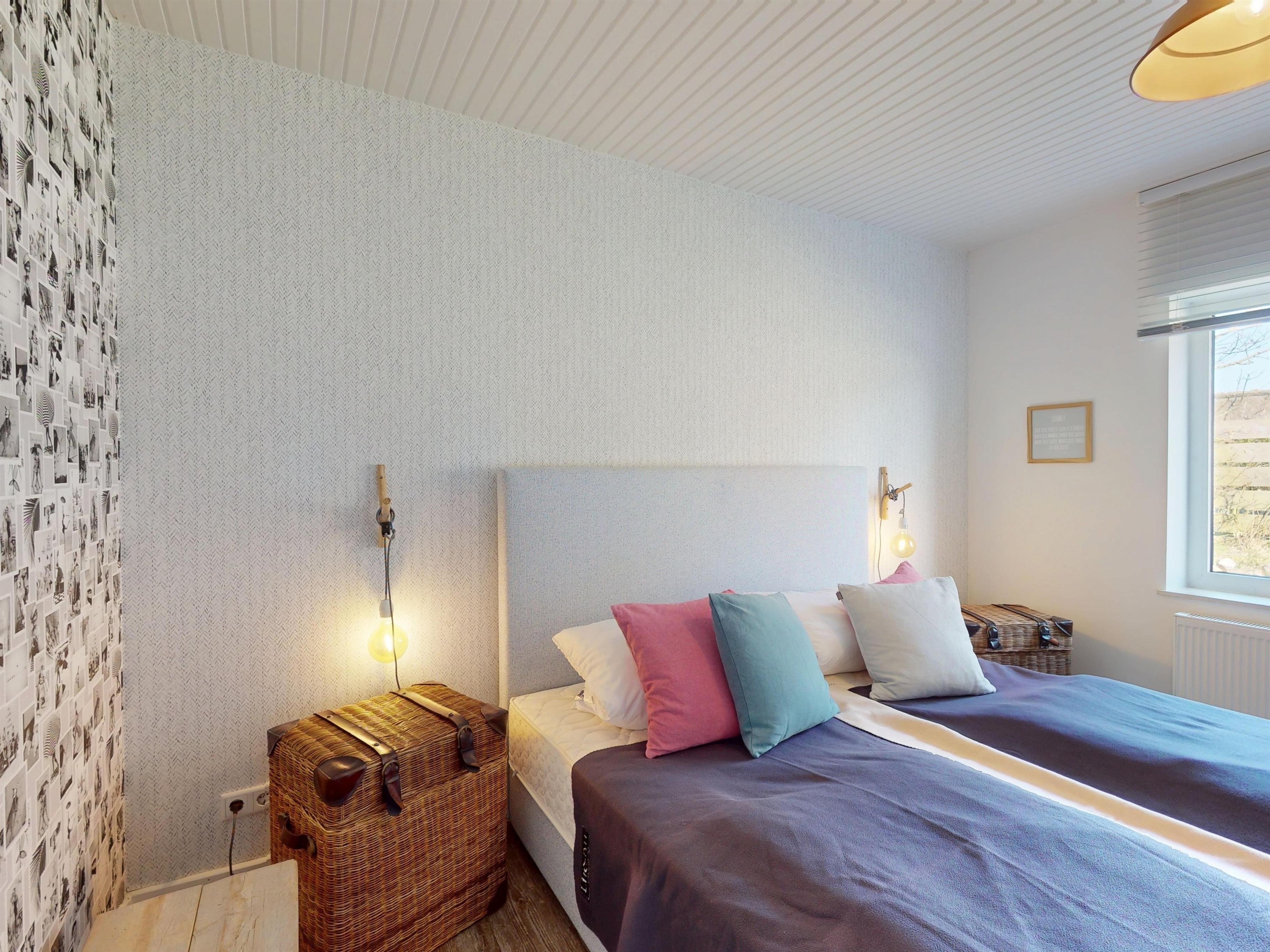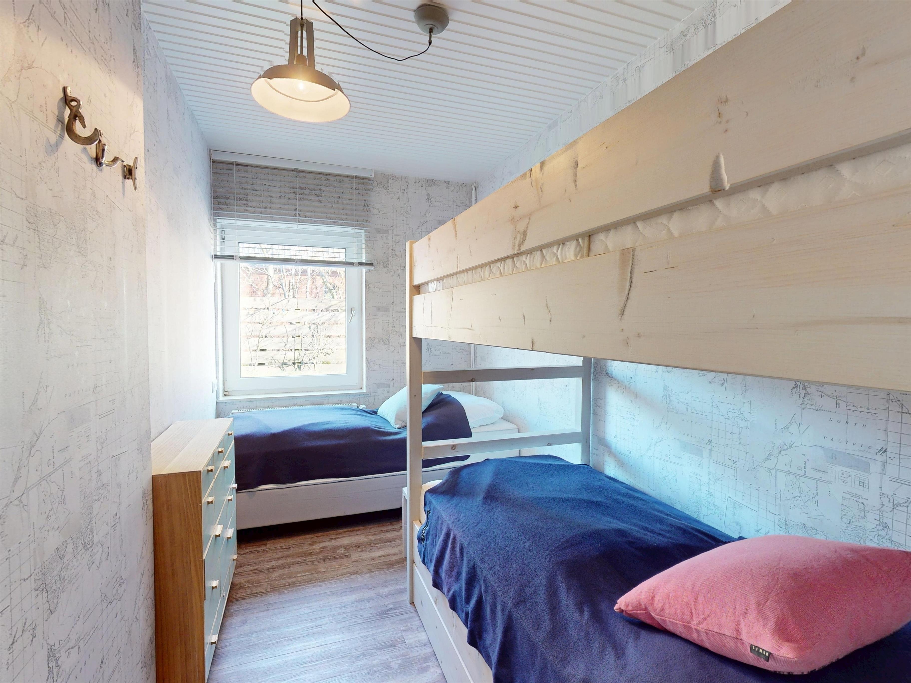 Das Doppelboxspringbett im Schlafzimmer sorgt für erholsame Nächte, während das Kinderzimmer mit einem Etagenbett und einem Einzelbett ideal für die kleinen Gäste ist.
