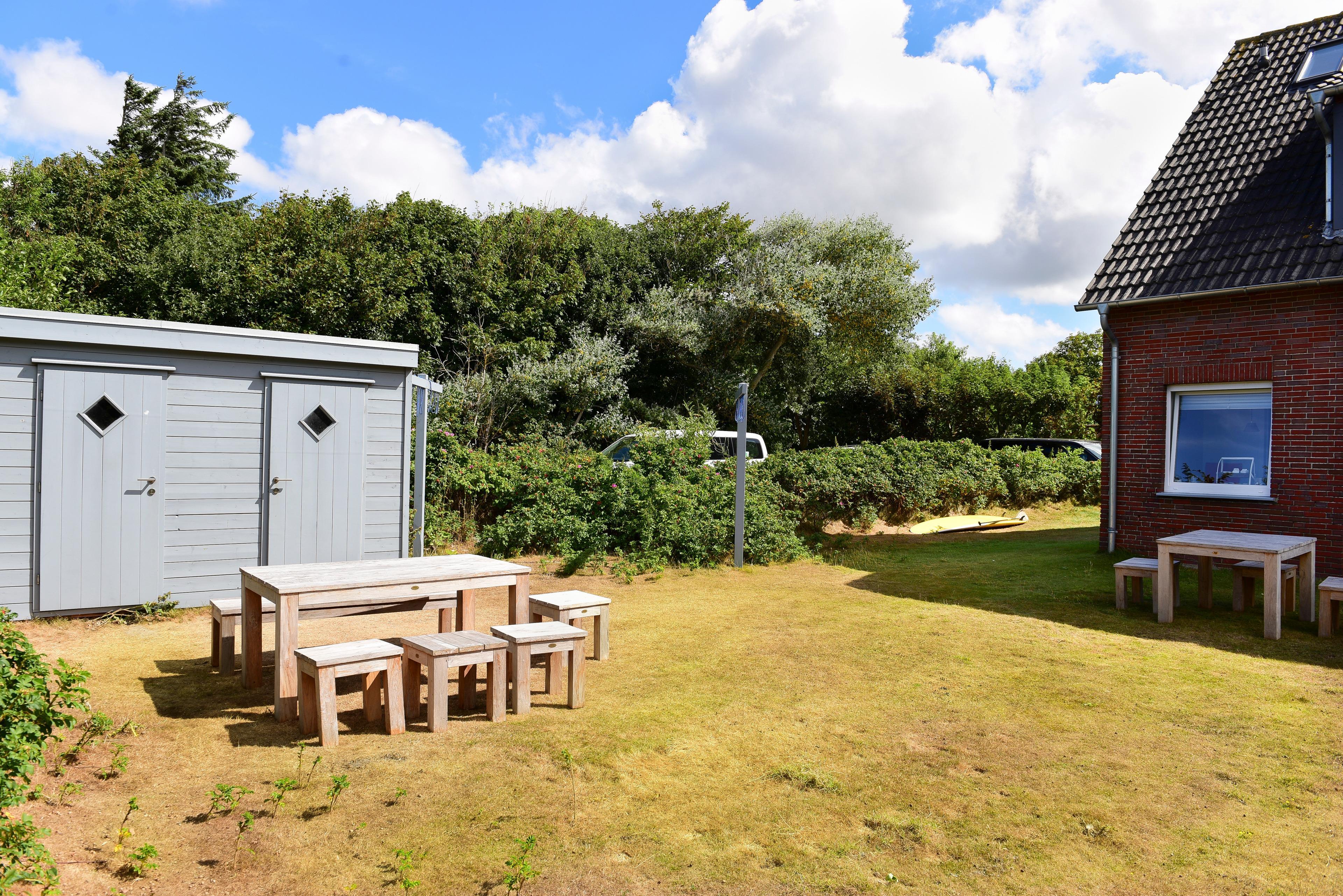 Der großzügige, gemeinschaftlich nutzbare Garten des Hauses bietet einen herrlichen Platz für den Sonnenuntergang, und für die Wassersportler unter Ihnen steht ein Schuppen für Surfbretter sowie Hängevorrichtungen für Segel bereit.