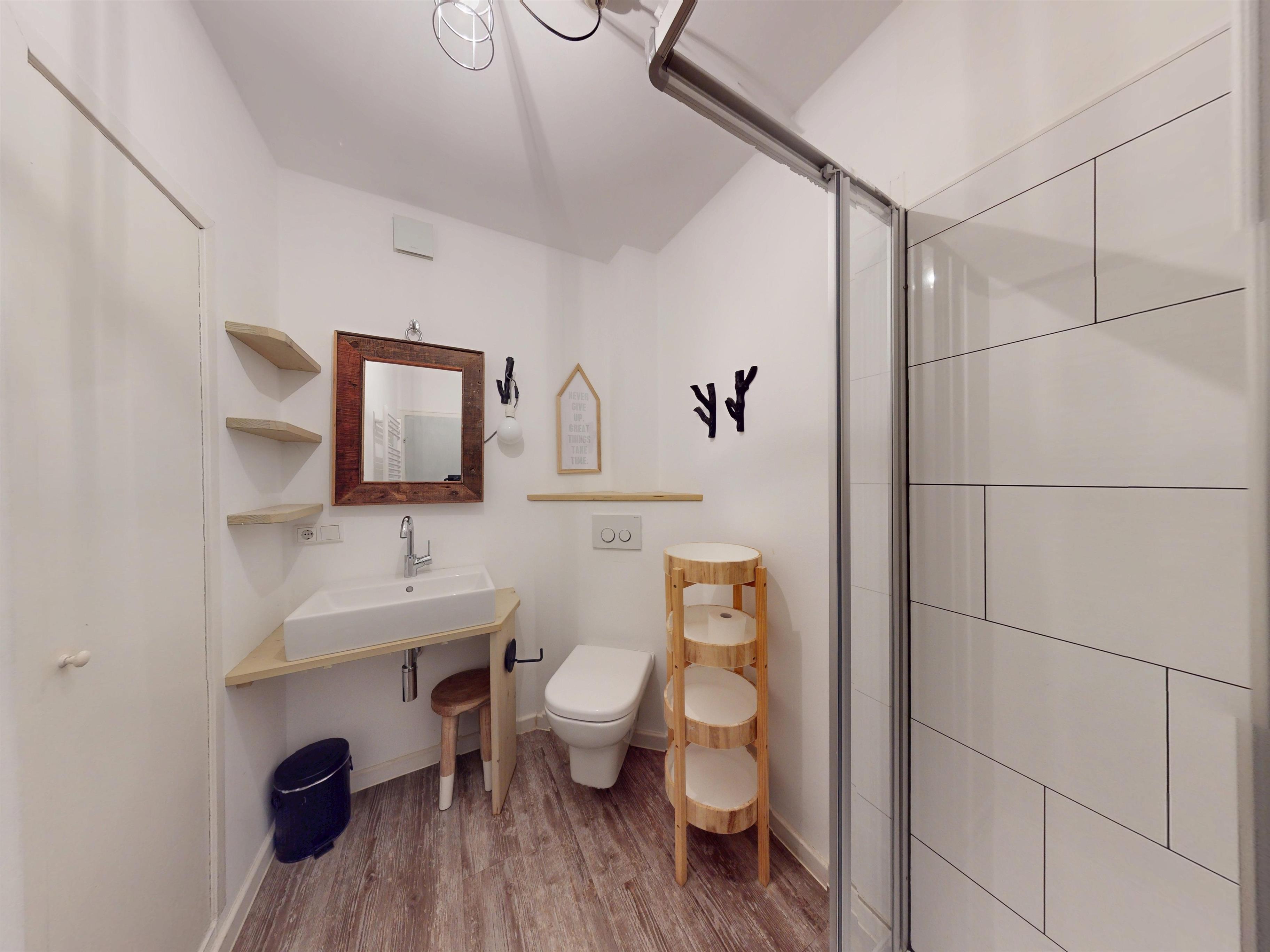 In jedem Raum finden Sie liebevolle Details, die der Wohnung einen ganz besonderen Charakter verleihen. Das helle Duschbad lädt mit seinem freundlichen Design und ausreichend Platz für Ihre persönlichen Utensilien zu einem erfrischenden Start in den Tag ein.