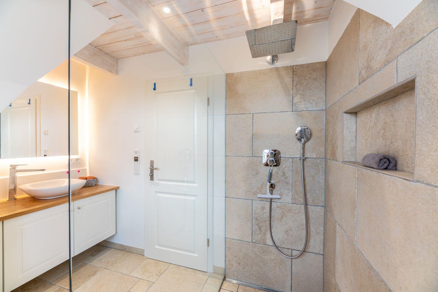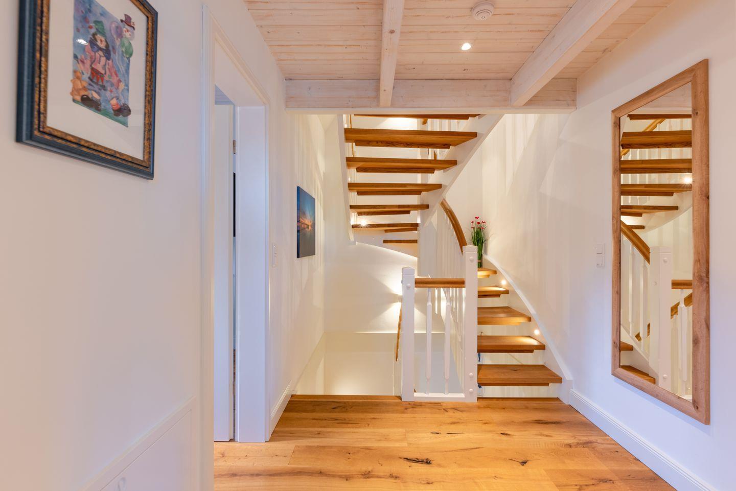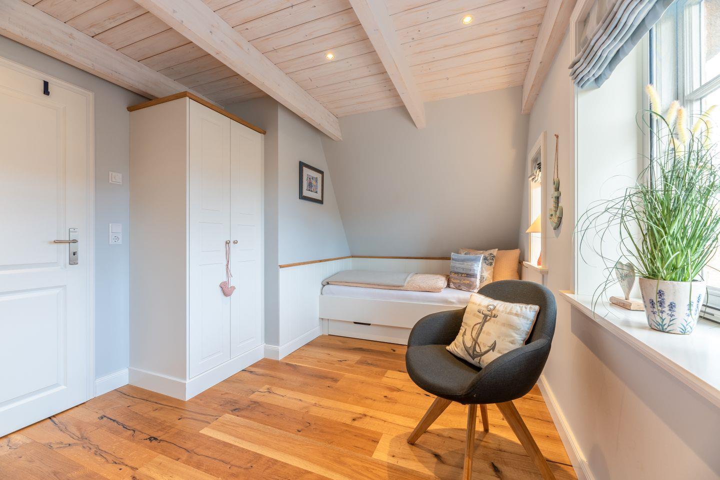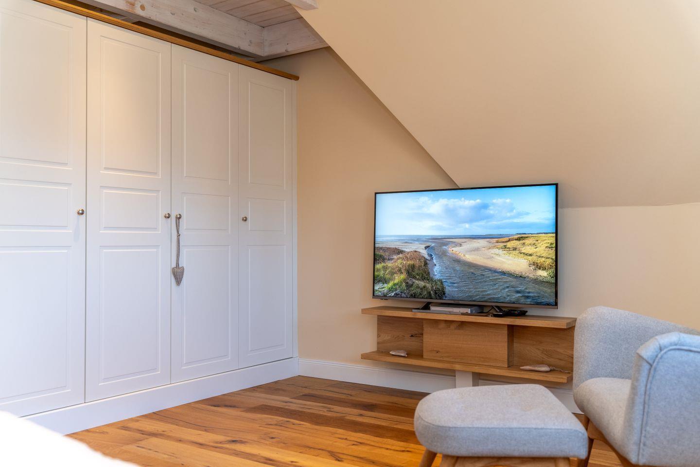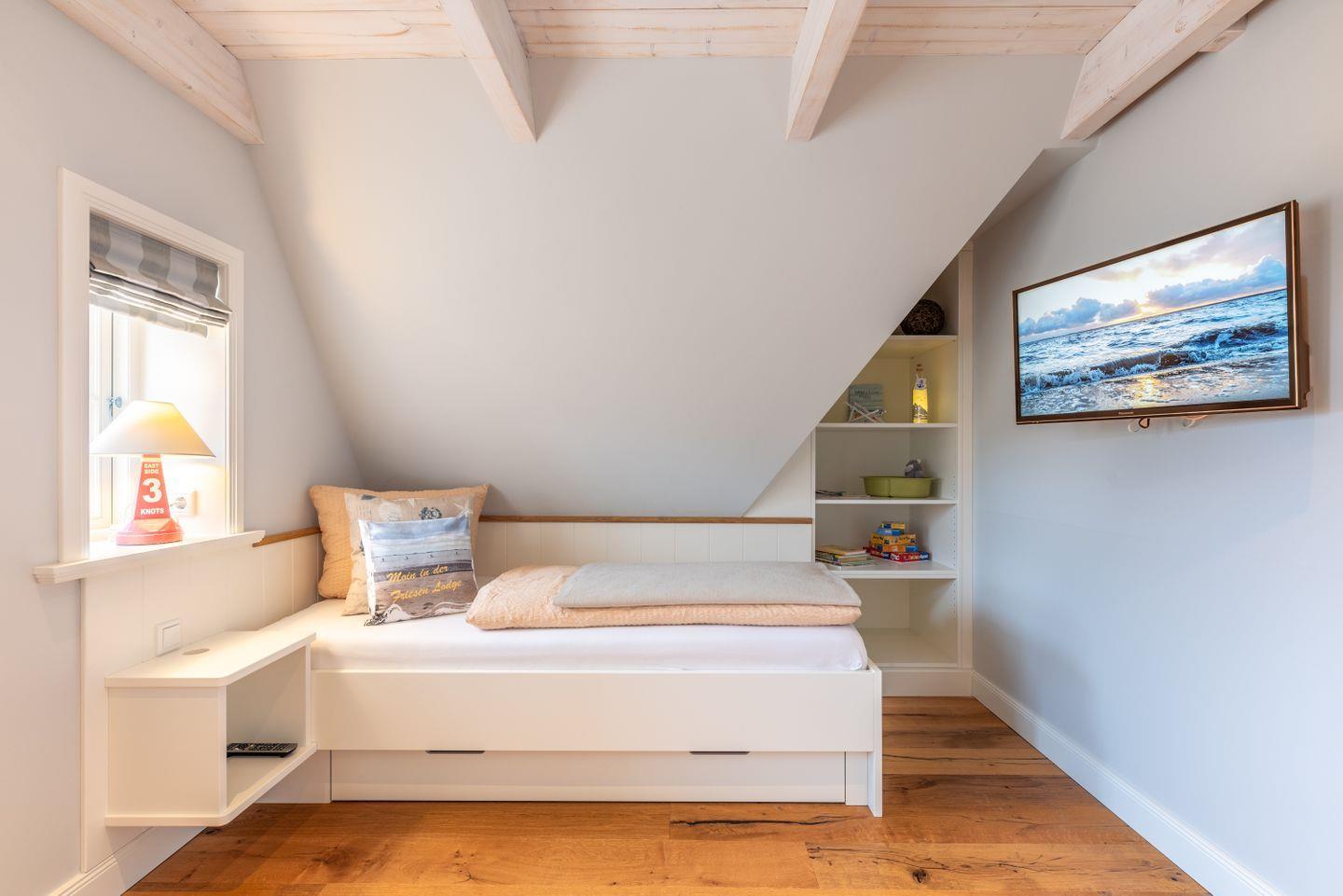 Zwei liebevoll gestaltete Schlafzimmer mit TV im Obergeschoss sorgen für erholsamen Schlaf. Das moderne Duschbad verfügt über eine Dusche, ein WC und ein Fenster sowie eine Fußbodenheizung.