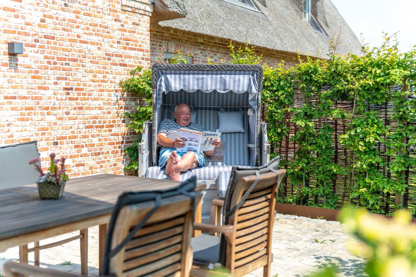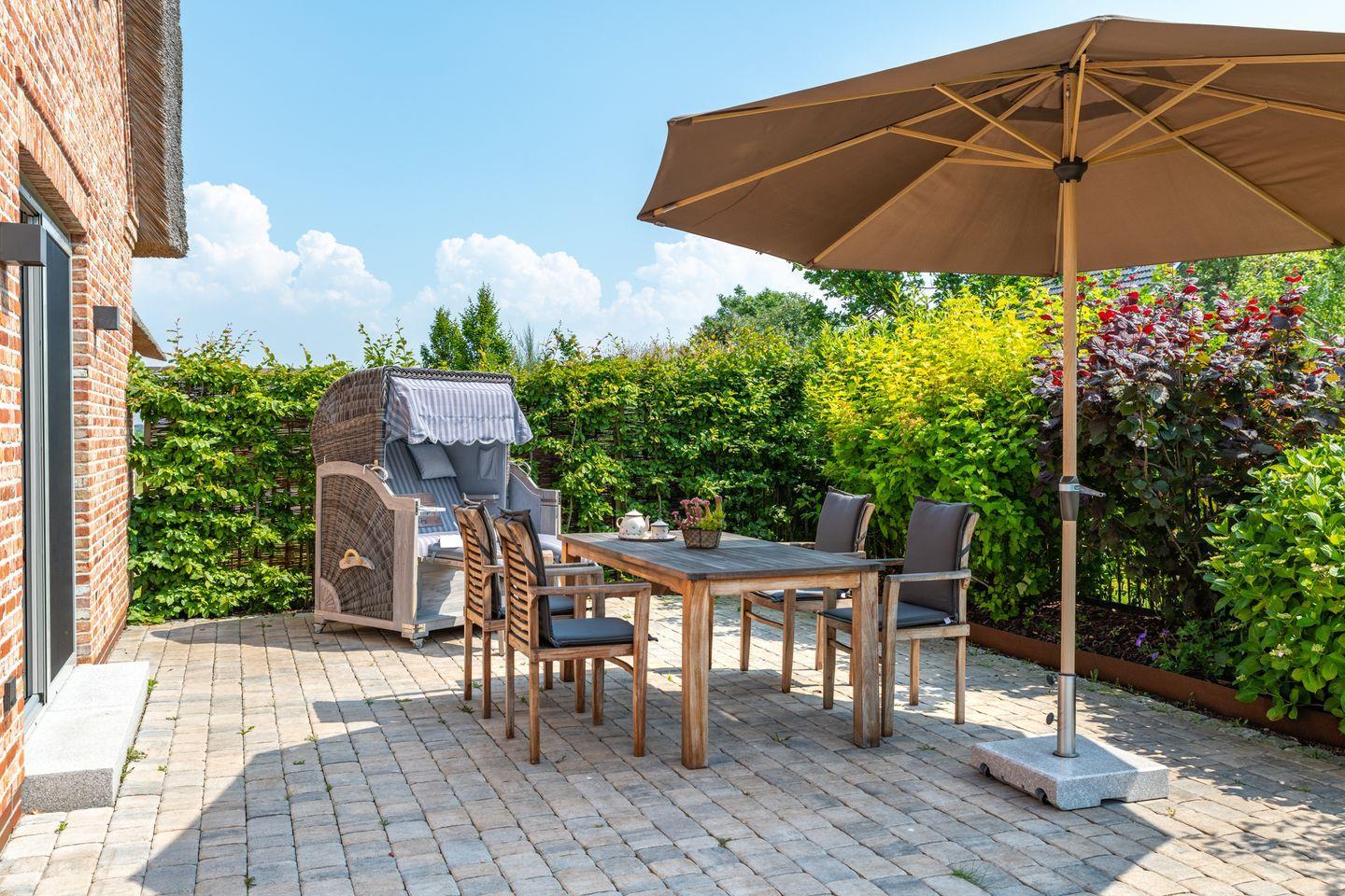 Eine sonnige Terrasse mit umzäunten Garten – perfekt für ein Frühstück im Freien oder gemütliche Abende. Ein Parkplatz ist ebenfalls vorhanden. Fahrräder können in der Fahrradgarage abgestellt werden. Ein Strandkorb steht ihnen am Objekt zur Verfügung sowie auch direkt am Strand.