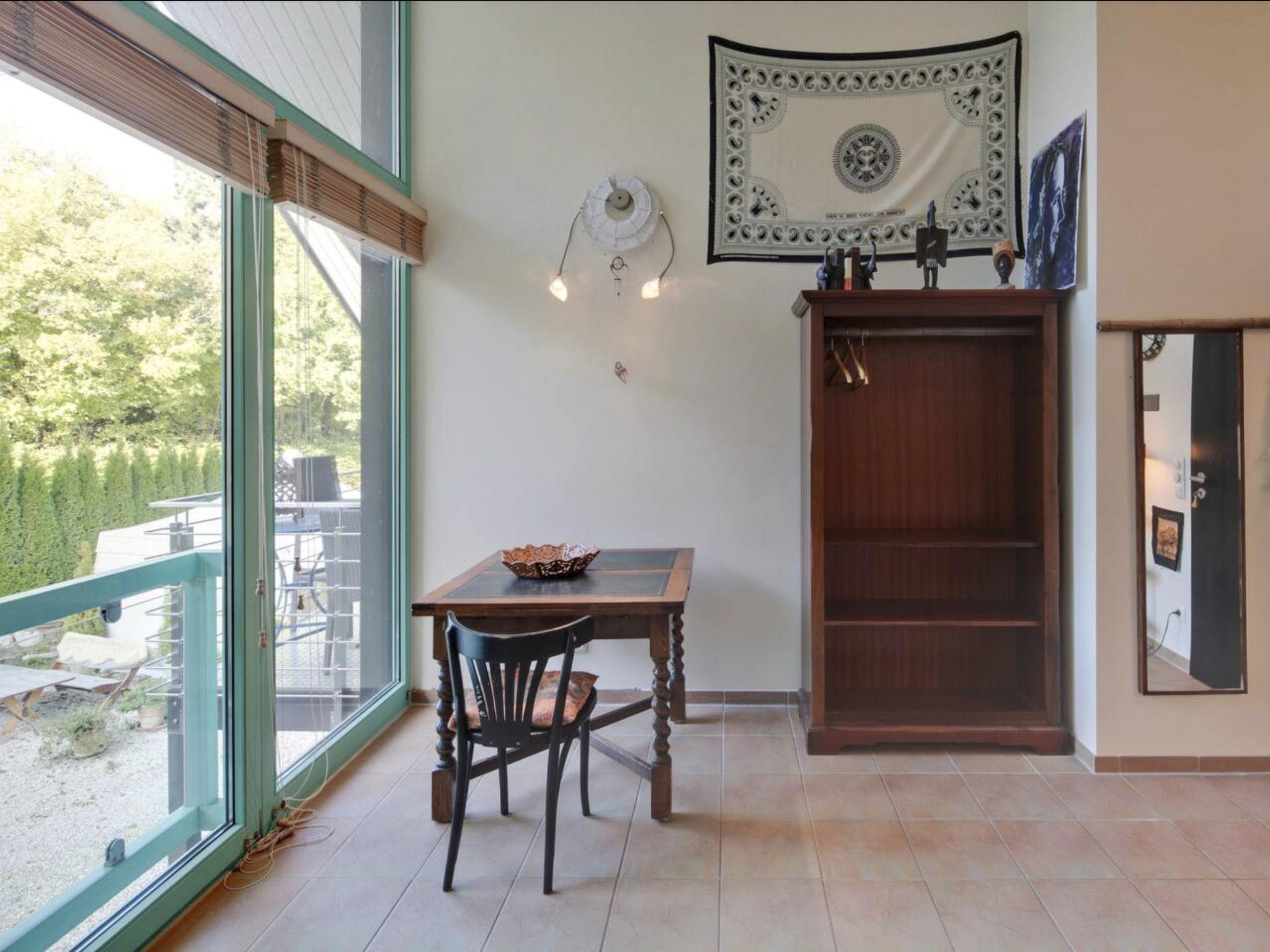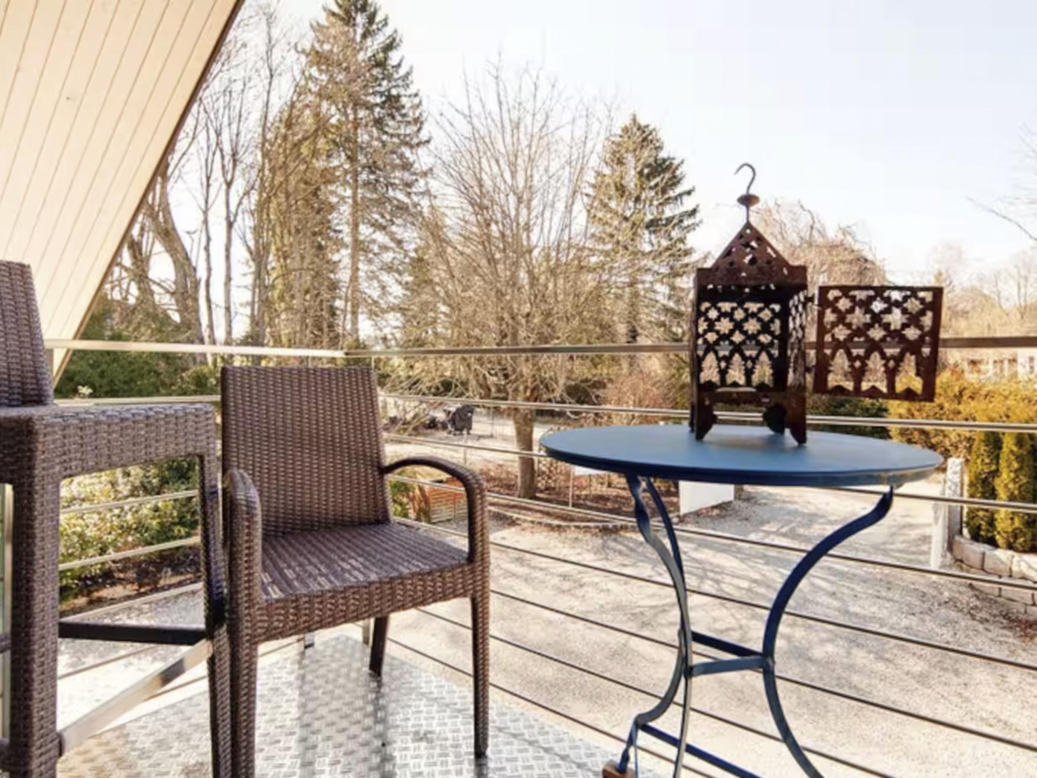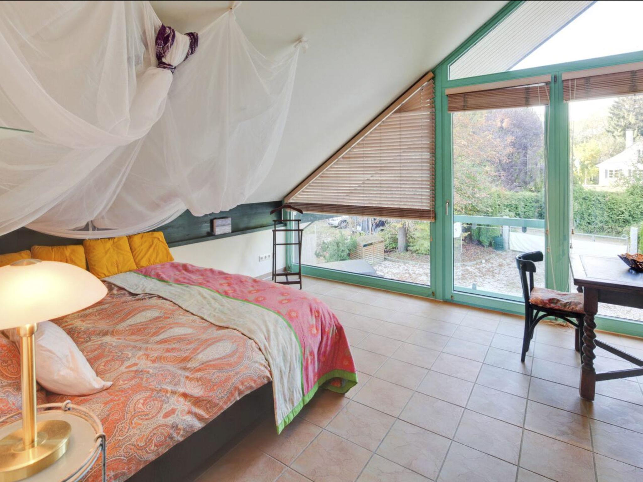 The "Immas Welt" holiday flat is located on the top floor of the timber and glass architect's house on a plot of approx. 2,400 square metres in the Utting-Holzhausen district and can be reached via an external staircase. Short distances lead to the lake with bathing area and sunbathing lawn, to the landing stage of the Ammersee shipping company and into the open countryside. Rooms and furnishings: Lots of ceiling height, glass, wooden and ceramic floors, combined with white and fresh colours, give the flat a loft character. It offers openness and spaciousness with an unobstructed view of the countryside. The flat consists of a living room, two separate double bedrooms, a lounger in the living area, kitchen, bathroom and balcony. The sloping ceilings provide space for a walk-in wardrobe. The flat has its own guest car park. The furnishings in all rooms fulfil high standards of material quality, design, functionality and comfort. Modern entertainment electronics, contemporary kitchen technology, a desk/workstation in the bedroom, a washbasin, bath and shower with plenty of space and light in the bathroom and colourful accessories ... make "Immas Welt" the flat of your dreams. The 2 bedrooms each have a king-size bed, so 3 children could easily sleep in them. If there are more guests, we also have several mattresses that can be set up in the living area. The courtyard is available for you to use outside. You can relax there and have a barbecue. Immas Spa: As a guest you are welcome to the 120 square metre Day Spa, a day beauty farm for body care, cosmetic and water treatments. IMPORTANT: If you are travelling with a dog, please let us know the breed and sex of the dog and whether it is neutered or not when booking. Travelling is only possible with sociable dogs. Brief description Other : Non-smoking house Brief description 1Number of kitchens : 1Bedroom 1Other bedroom furnishings : large box-spring bed Bedroom 2Other bedroom furnishings : large box-spring bed Surroundings Rental facilities : boat hire, bicycle hire Sports facilities in the surrounding area : fishing, basketball, canoeing, climbing, mountain biking, cycling tours, horse riding, rowing, sailing, surfing, water skiing Garden and outdoor facilities Garden equipment : barbecue