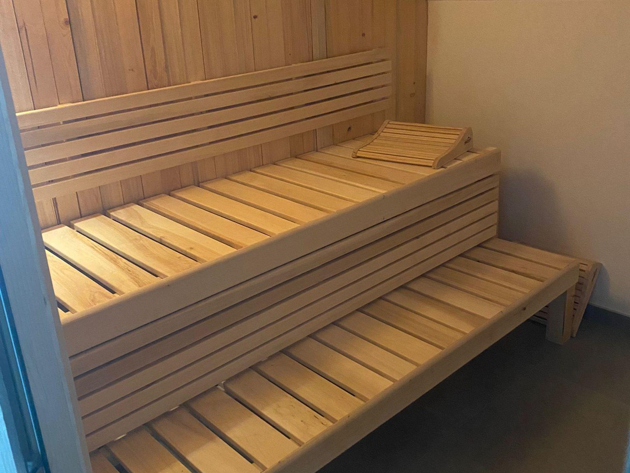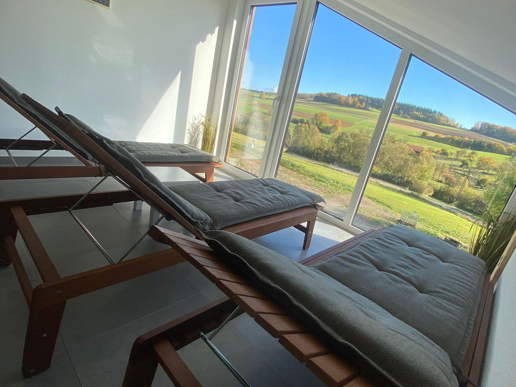 Im zweiten Obergeschoss findet ihr einen großzügigen Wellnessbereich, der über einen geräumigen Flur direkt von den Ferienwohnungen erreichbar ist. Neben einem Ruhebereich mit atemberaubendem Blick ins Grüne bietet der Wellnessbereich eine Sauna sowie einen großzügigen Whirlpool für bis zu vier Personen mit verschiedenen Massagedüsen.