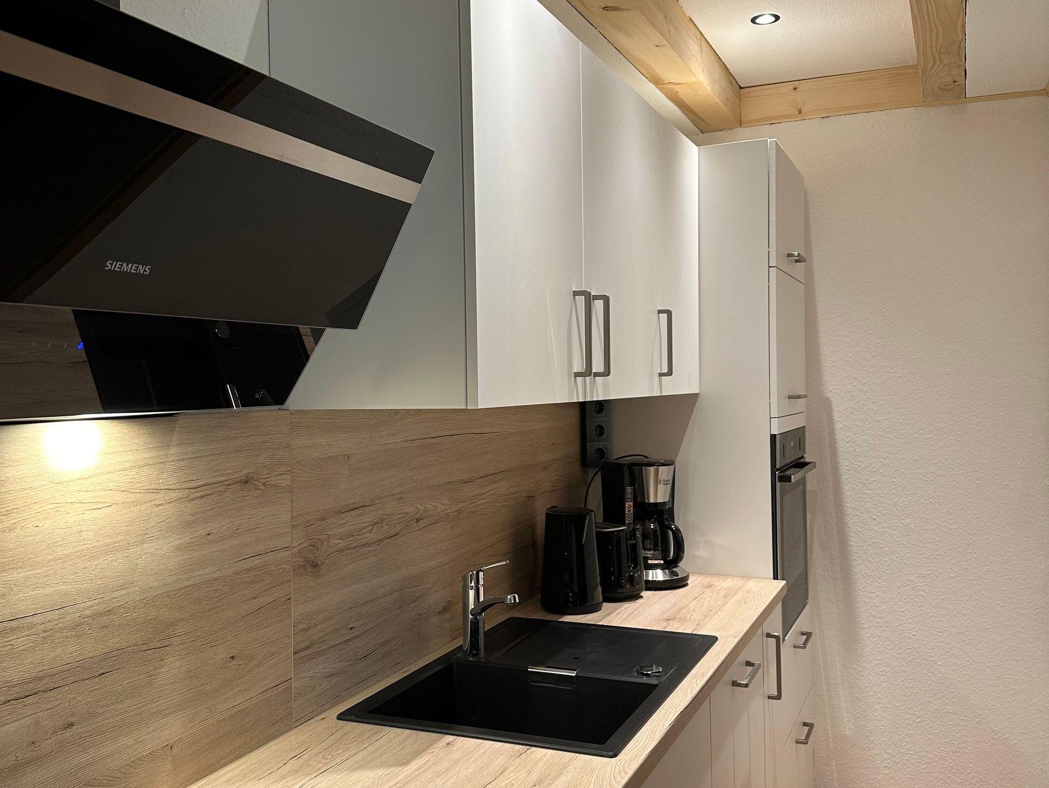 Die voll ausgestattete Küche lässt keine Wünsche offen und verfügt über einen Geschirrspüler, hochwertige Elektrogeräte (Kühlschrank, ein Gefrierfach, Induktionsherd, Mikrowelle, Ofen) sowie Toaster, Kaffeemaschine und Wasserkocher.