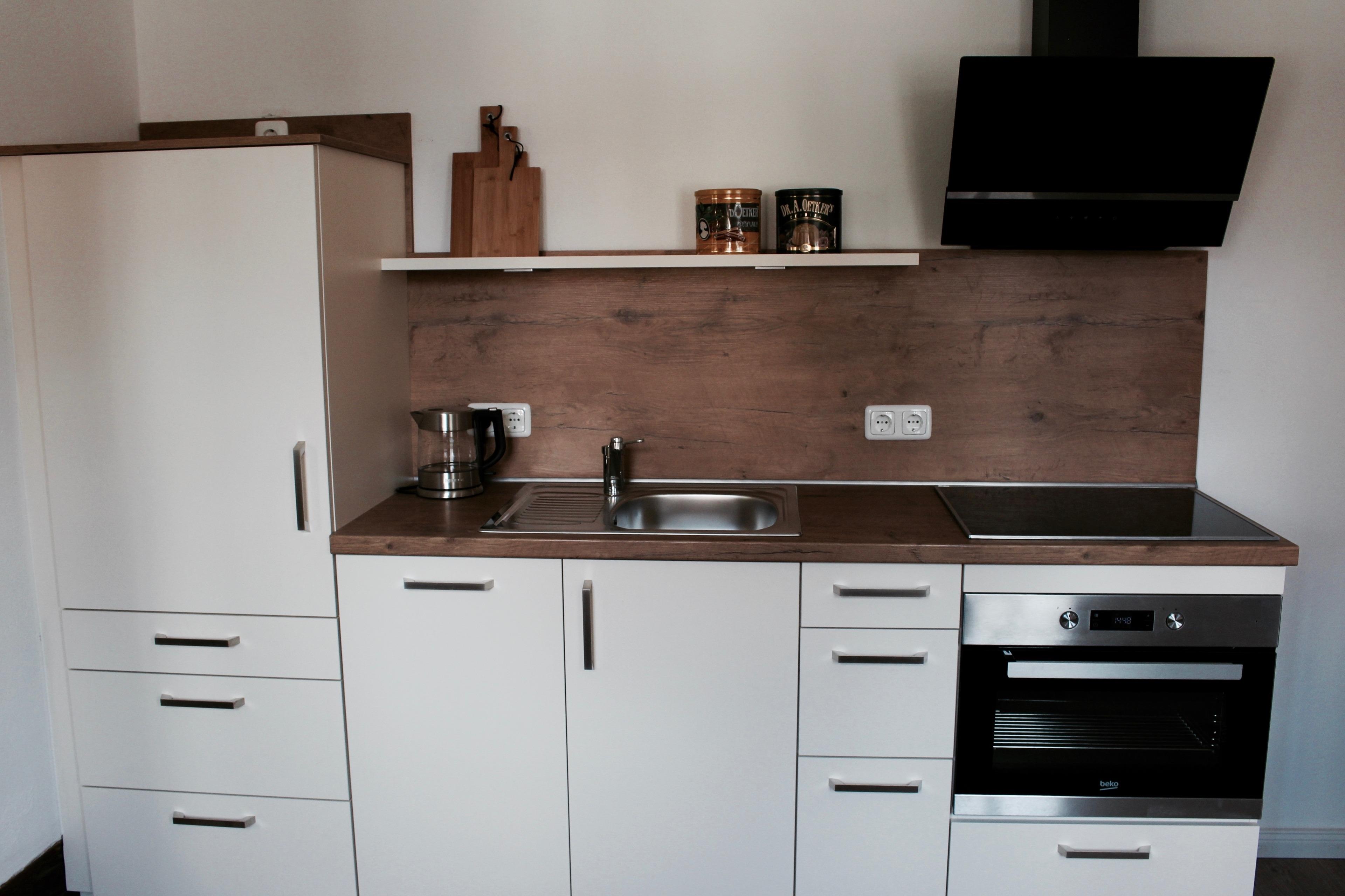 Die Wohnküche verfügt über eine voll ausgestattete Küchenzeile, einen 4-Plattenherd mit Backofen, einen Kühlschrank mit Gefrierfach und eine Geschirrspülmaschine. Im Schlafbereich befindet sich ein Doppelbett der Größe 180 x 200 cm mit zwei einzelnen Matratzen und das Vollbad ist ausgestattet mit einer Dusche.