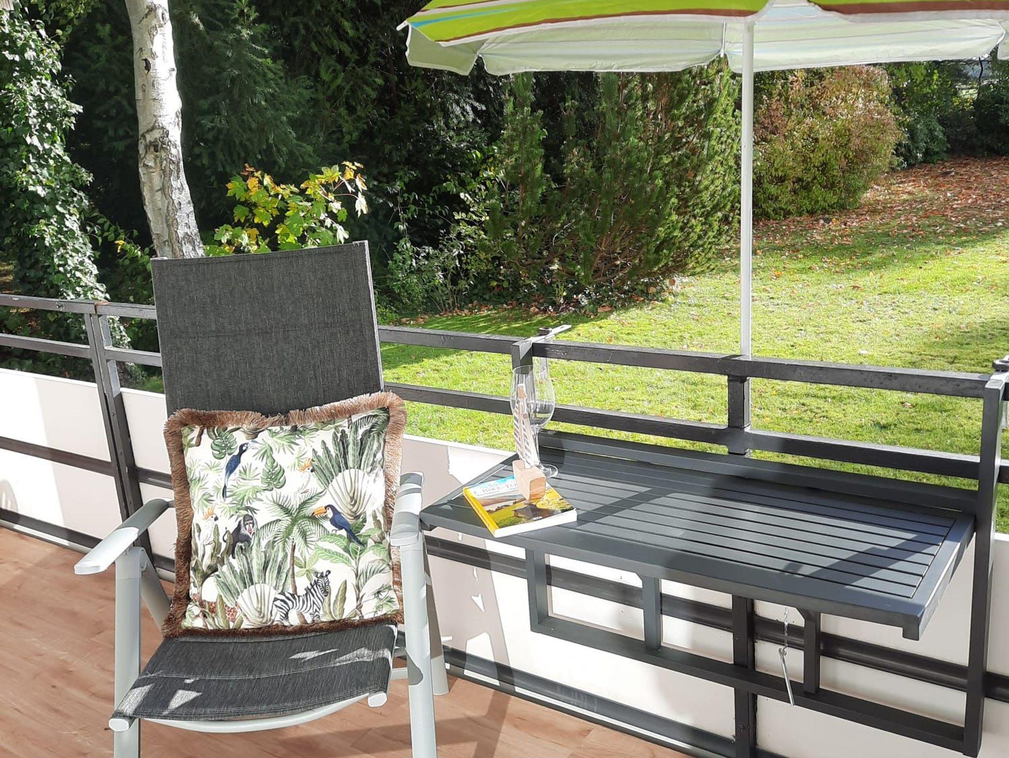 Ausstattung Außen: sonnige, überdachte Loggia (Südausrichtung), Esstisch mit 2 Gartenstühlen, 2 Relaxliegen, toller, ruhiger Gartenblick