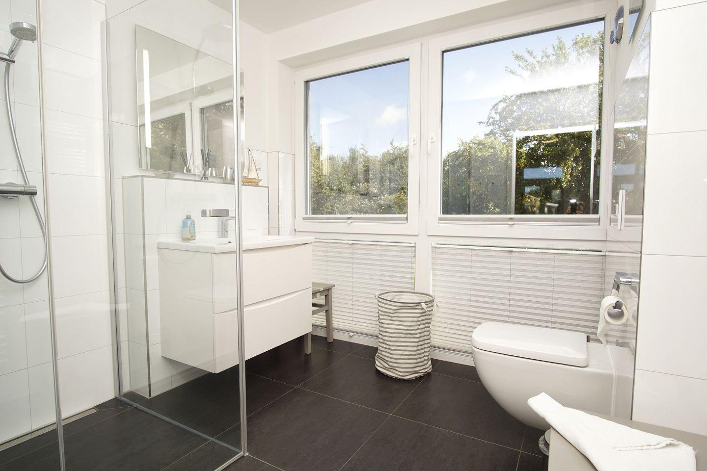 BAD // zwei Badezimmer im EG - erstes Tageslichtbad (Bad en suite) im EG mit Dusche, Waschbecken und WC, zweites Tageslichtbad im EG mit Dusche, Waschbecken und WC, drittes Tageslichtbadezimmer im OG mit Dusche und Badewanne ++