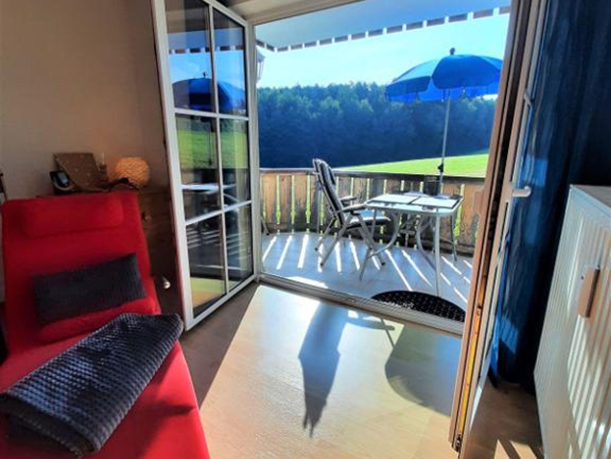 Sie hat einen herrlichen großen Balkon, der vom Schlafzimmer und vom Wohnzimmer aus begehbar ist. Sie befindet sich im 1. Stock und bietet einen herrlichen Blick auf Wiesen und Wald. Balkonmöbel für 4 Personen, Wäscheständer sowie Sonnenschirm und eine Sonnenliege sind vorhanden.