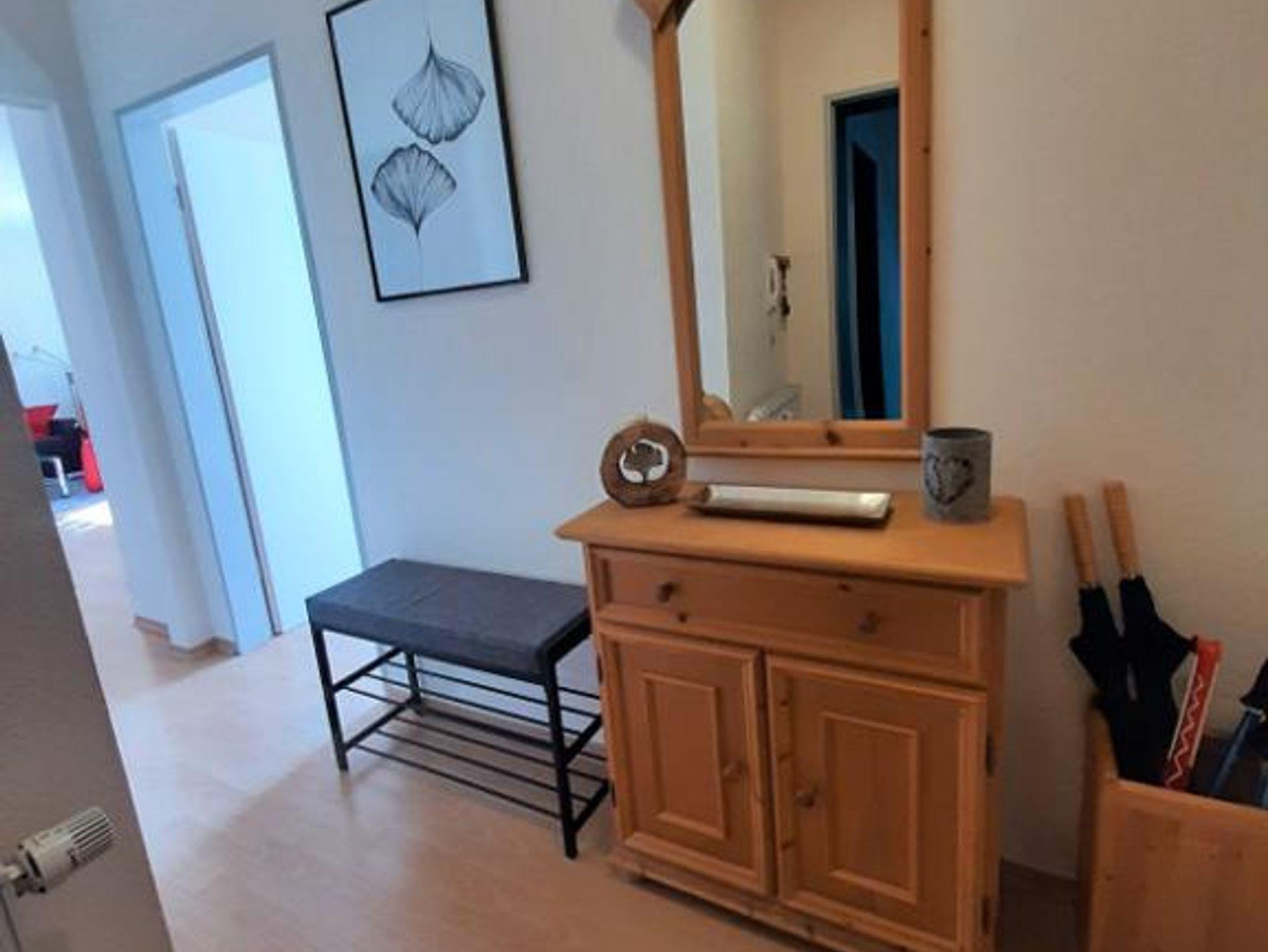 Der Flur ist mit einer Echtholzgarderobe, einem großen Spiegel und einer praktischen Sitzgelegenheit mit Schuhablage ausgestattet.