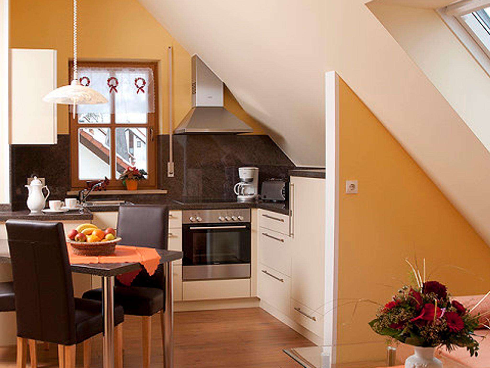 Unsere mit Liebe eingerichtete Ferienwohnung lässt für den Gast keine Wünsche offen. Sie bietet als Nichtraucherwohnung einen erholsamen Urlaub und für den Geschäftsreisenden einen angenehmen Aufenthalt. Die 36 m² große Dachgeschoßwohnung ist mit einem Balkon und Dachfenster mit Rollo`s ausgestattet. Die Wohnung hat ein separates Schlafzimmer mit Doppelbett. Babybett und Hochstuhl kann auf Anfrage zur Verfügung gestellt werden. Im offenen Wohnbereich befindet sich eine voll eingerichtete Küche mit integriertem Essbereich. Eine Schlafcouch steht im Wohnbereich zur Verfügung. Das Bad verfügt über eine Dusche, WC, Waschbecken, Föhn und Handtuchtrockner.
